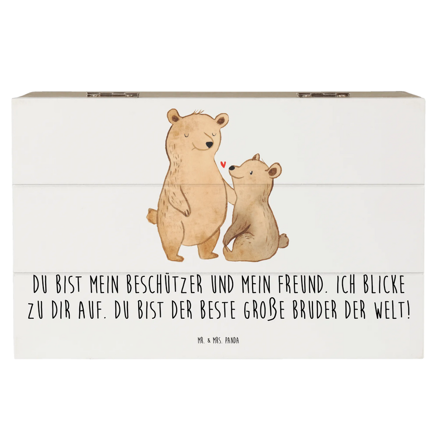Die Kiste ist mit einem liebevollen Motiv von zwei Bären gestaltet, die einander verbunden sind. Der große Bruder hält seine Tatze schützend auf die Schulter des kleinen Bruders, während zwischen ihnen ein kleines rotes Herz schwebt. Dieses Design symbolisiert die innige Bindung und Liebe, die Geschwister füreinander empfinden. Der Slogan "Du bist mein Beschützer und mein Freund. Ich blicke zu dir auf. Du bist der beste große Bruder der Welt!" macht die Kiste zu einem noch persönlichen Geschenk, das die besonderen Momente der Geschwisterliebe festhält.