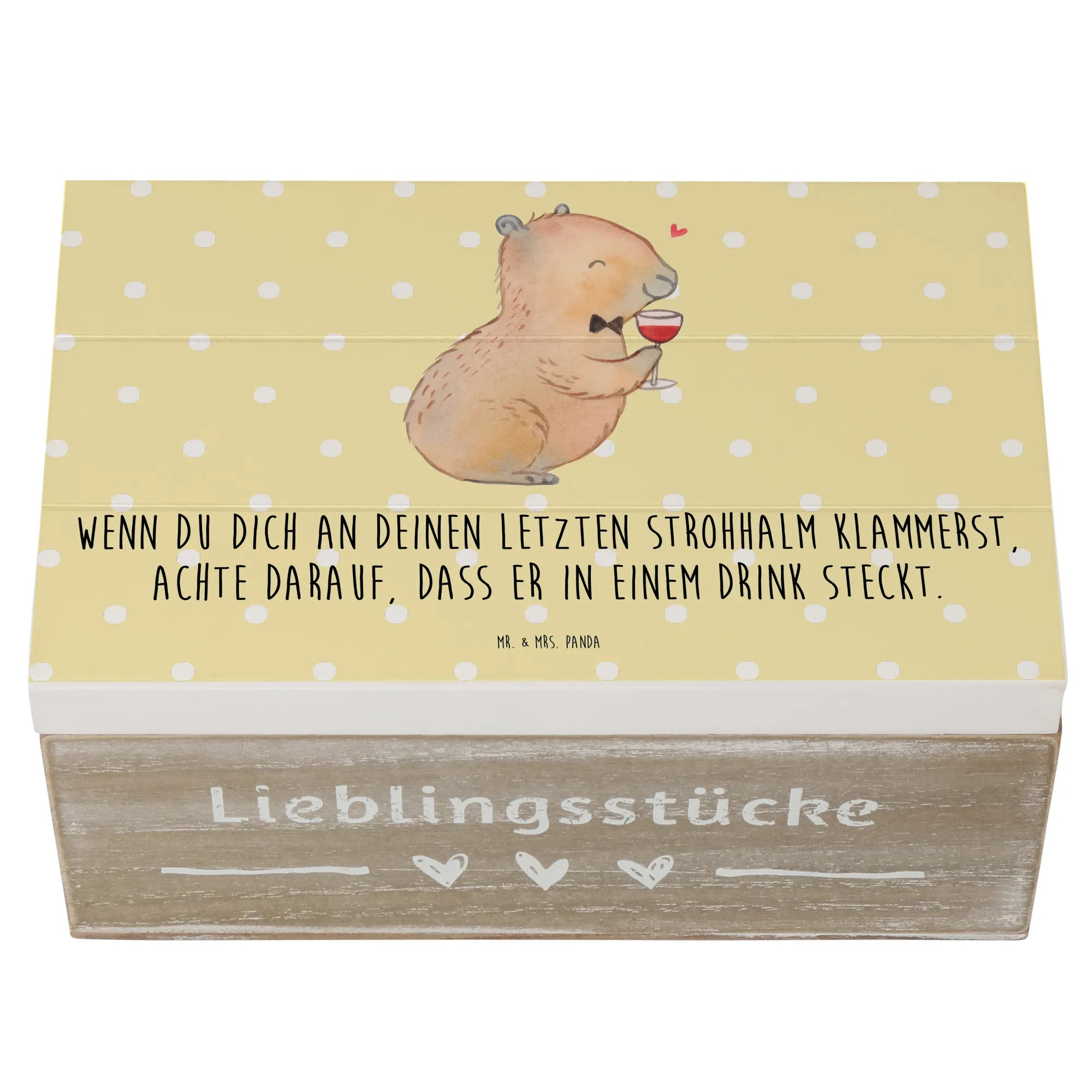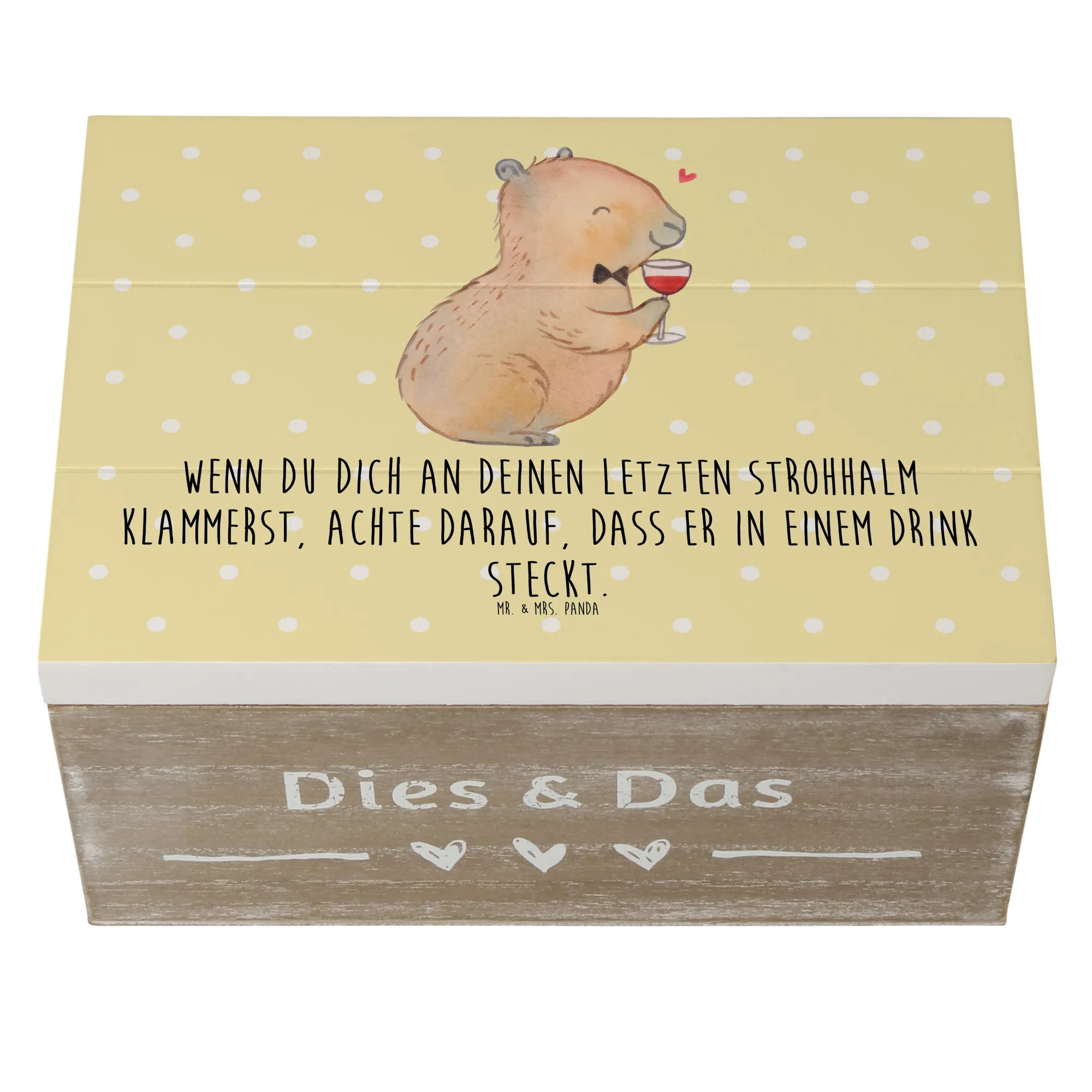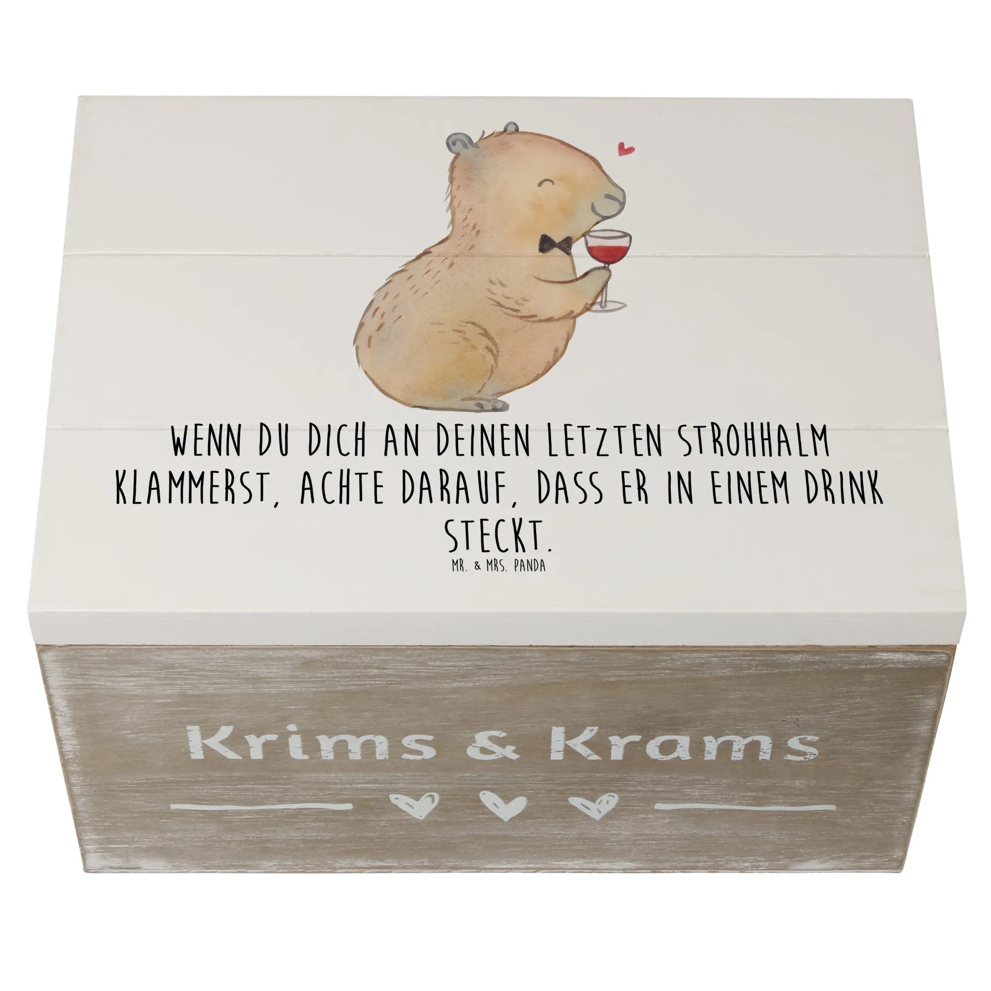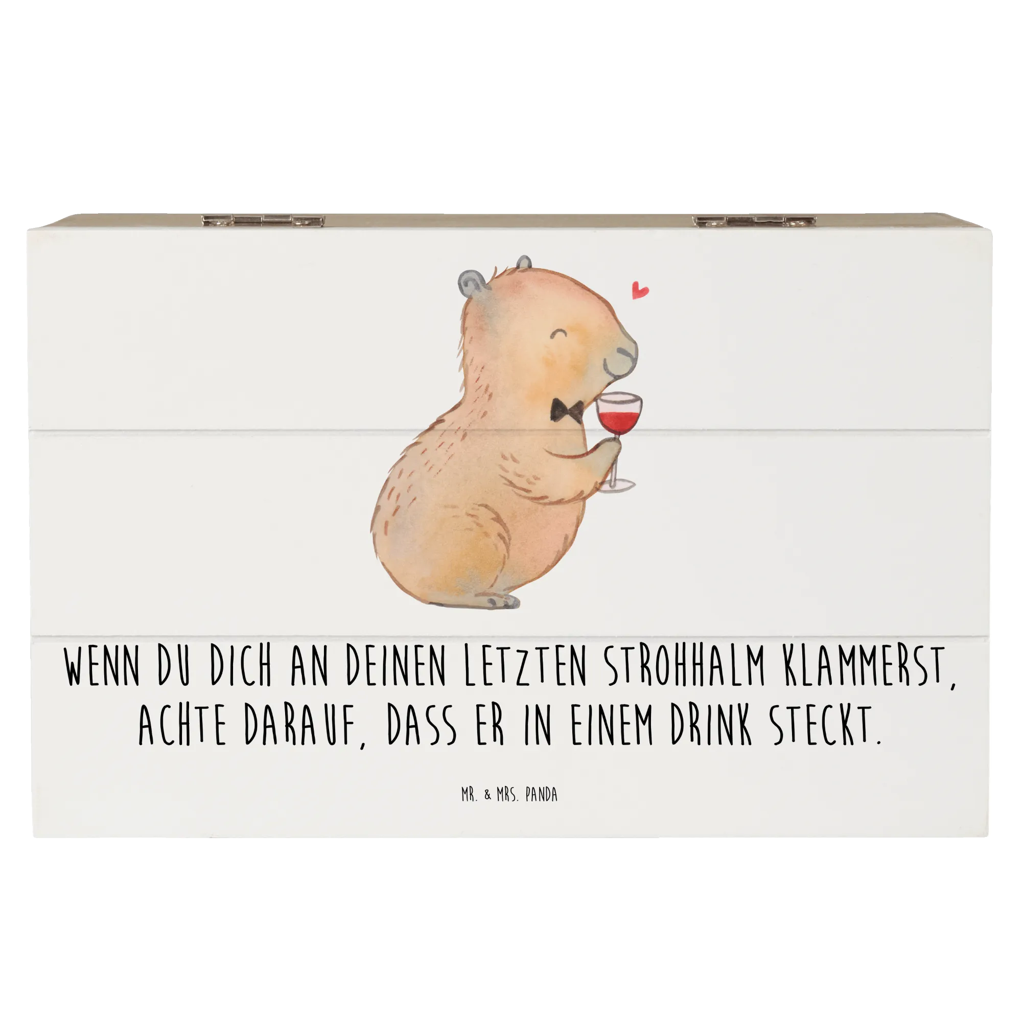 Das handgezeichnete Capybara, das elegant mit einer schwarzen Fliege und einem Glas Wein in der Pfote posiert, fängt den Moment der Lebensfreude perfekt ein. "Wenn du dich an deinen letzten Strohhalm klammerst, achte darauf, dass er in einem Drink steckt." Dieser spritzige Spruch verleiht der Kiste zusätzlichen Charme und macht sie zu einem idealen Geschenk für jeden, der das Leben feiert.
