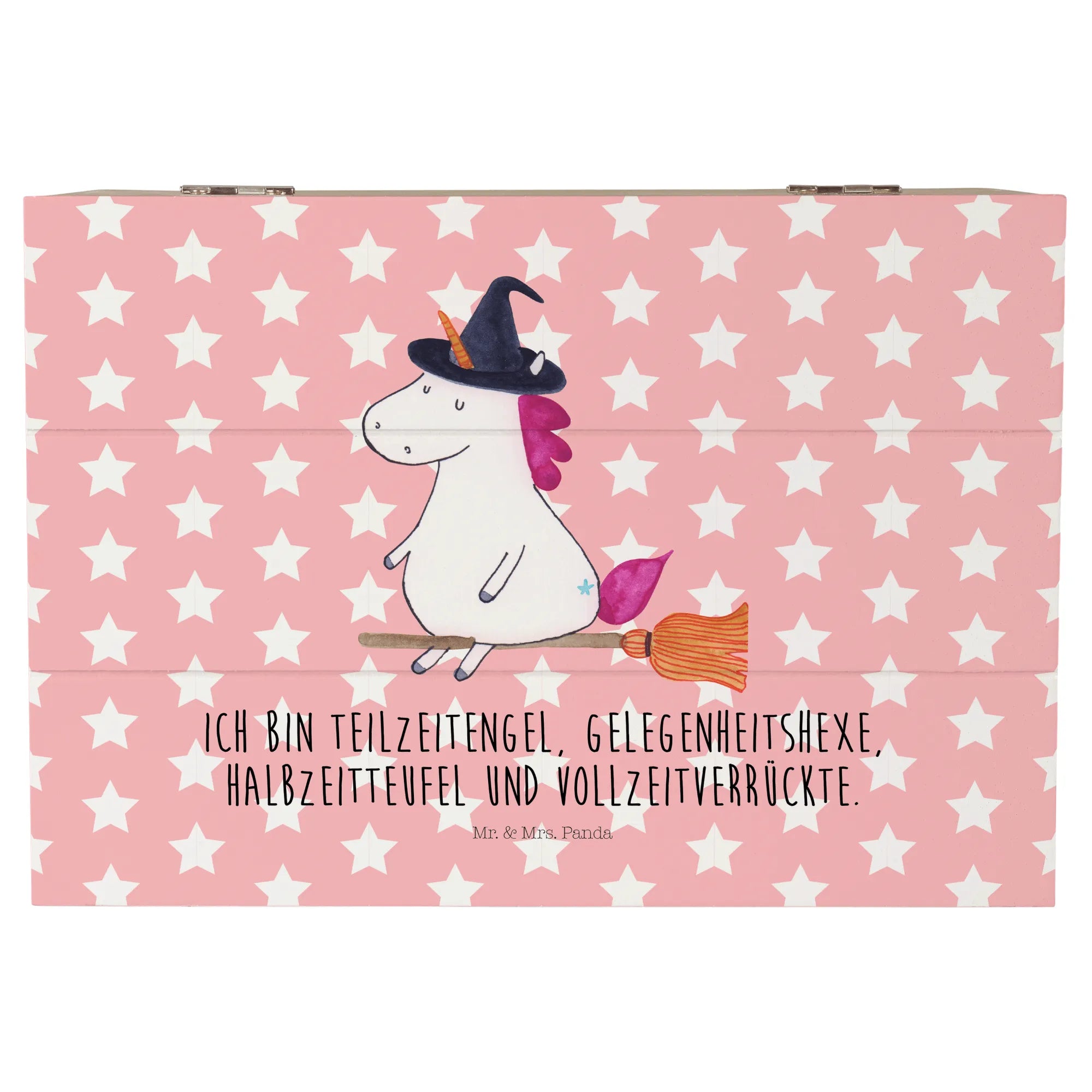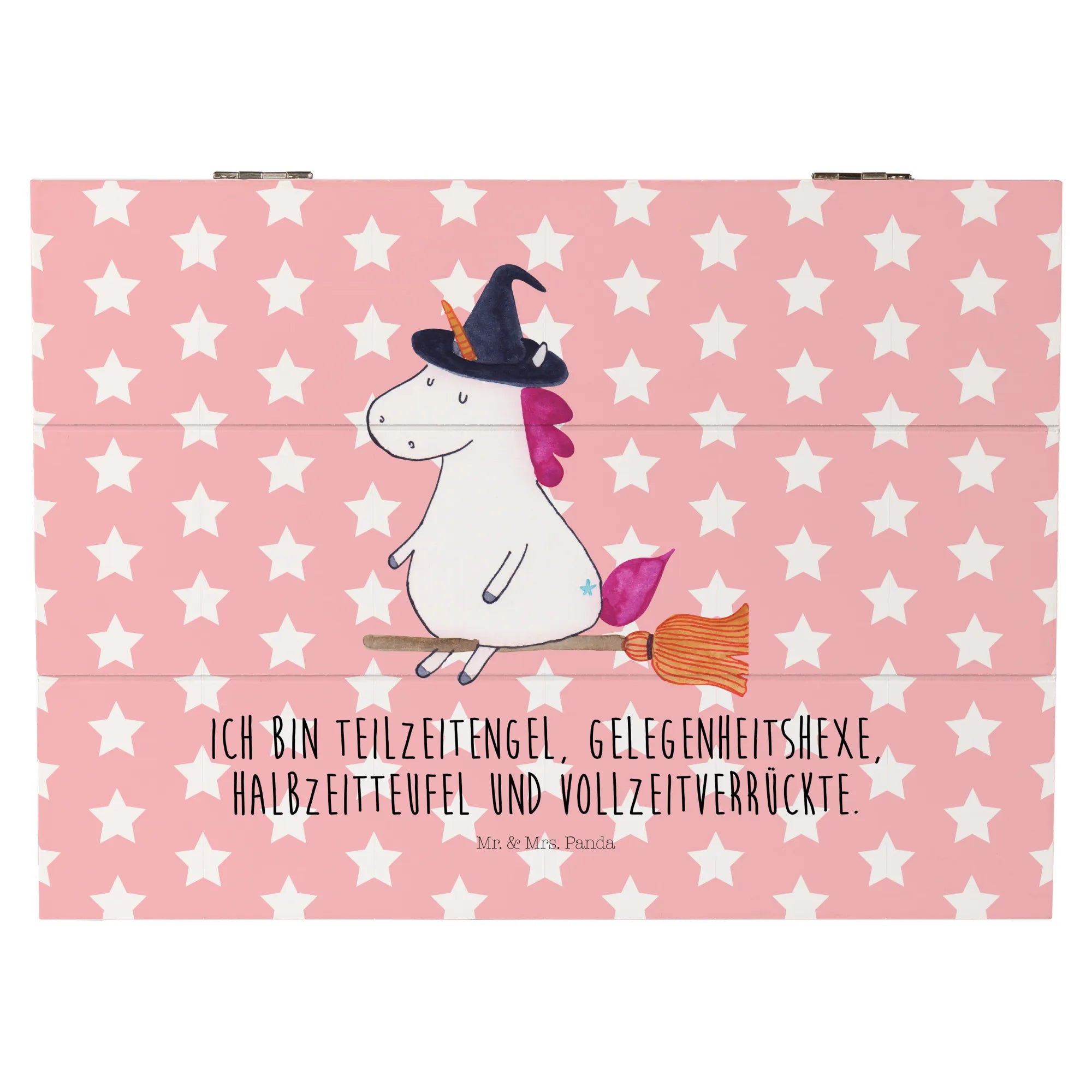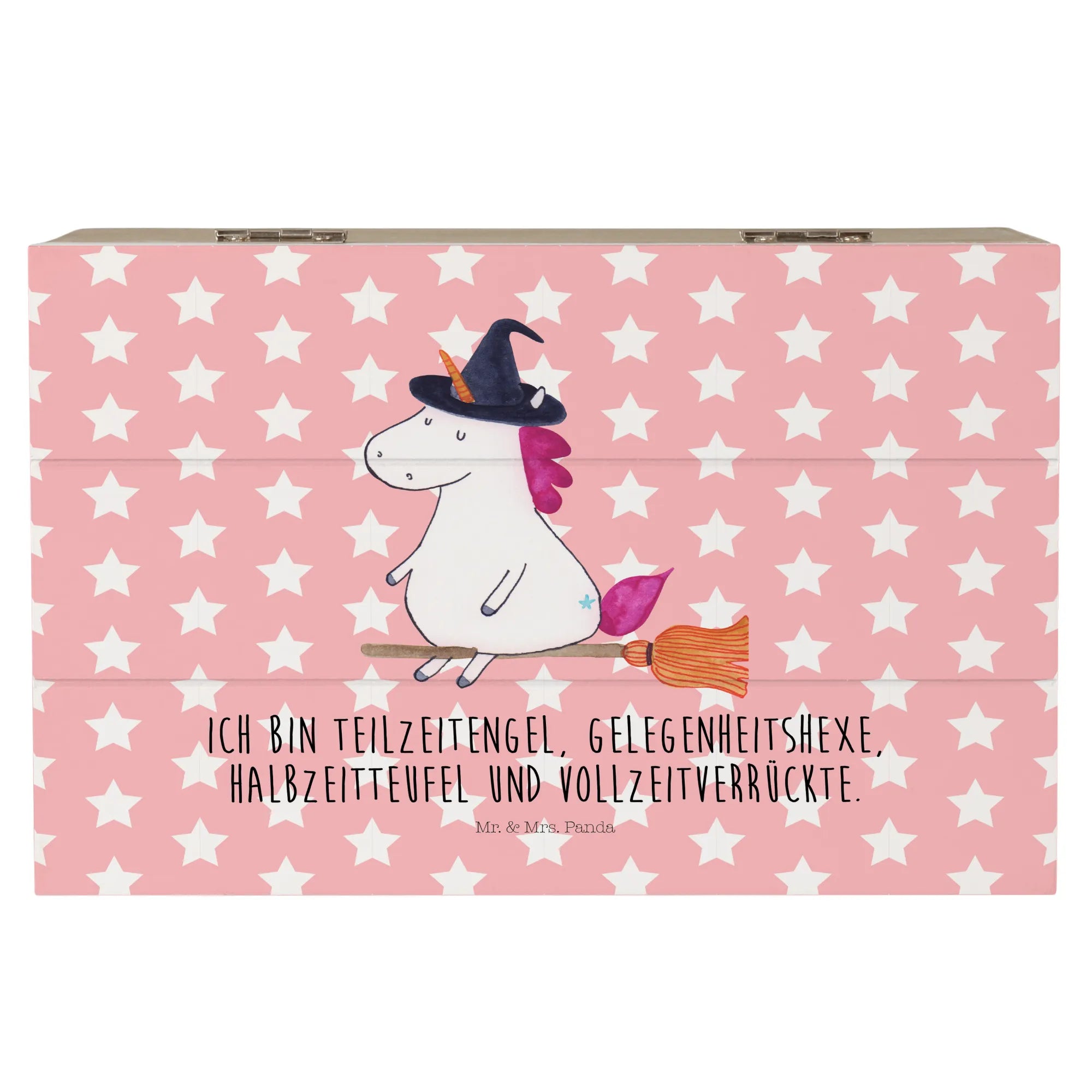 Die Holzkiste Einhorn Hexe ist Teil der zauberhaften Einhorn-Kollektion von Mr. & Mrs. Panda, die großartige Produkte mit liebevollen und handgezeichneten Motiven bietet. Lass deiner Fantasie freien Lauf und entdecke die betörende Welt der Einhörner und all ihrer zauberhaften Freunde! Ob als Erinnerungskiste oder dekorative Deko-Box, dieses Produkt wird für viel Freude sorgen und dein Herz höher schlagen lassen.