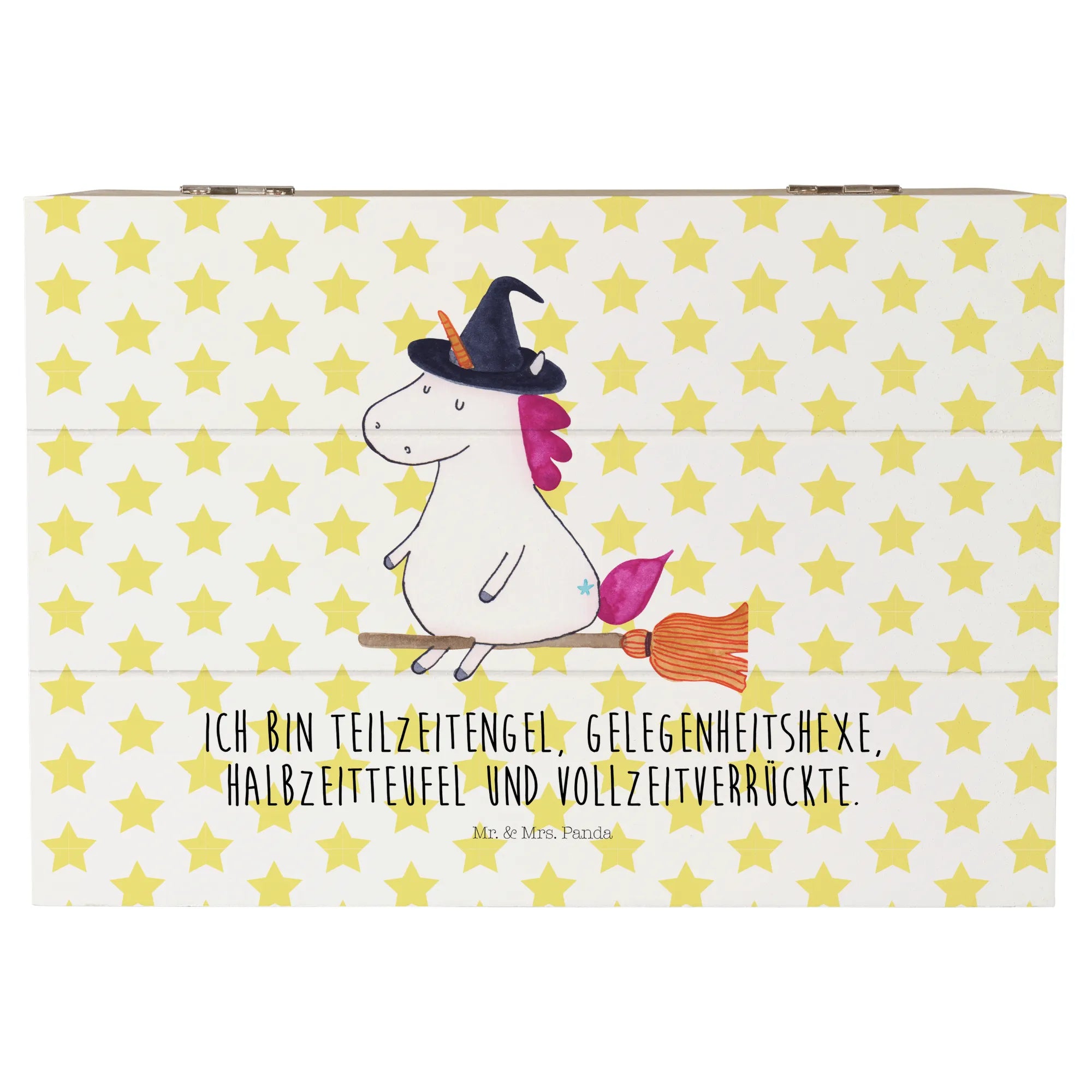 Entdecke die bezaubernde Holzkiste "Einhorn Hexe" von Mr. & Mrs. Panda! Diese wunderschöne Kiste ist nicht nur ein echter Hingucker, sondern auch unglaublich vielseitig. Mit einem tollen Motiv eines Einhorns, das auf einem Besen reitet und mit einem Hexenhut ausgestattet ist, ist diese Kiste perfekt für alle, die das Besondere lieben.