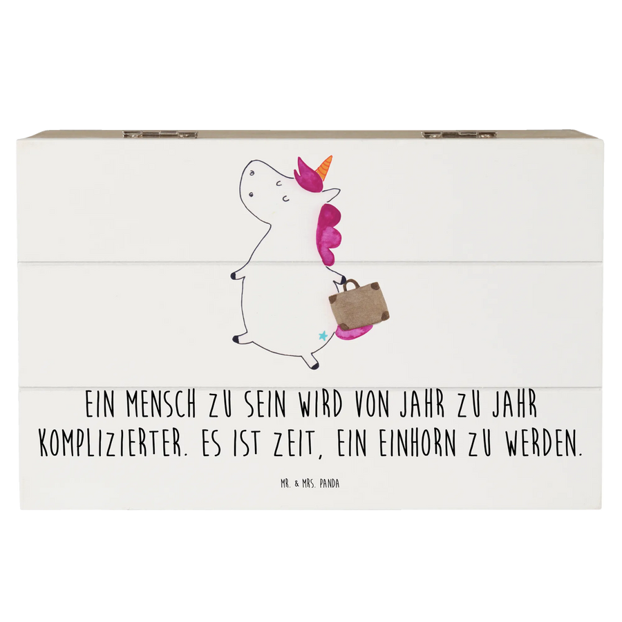 Die wunderschöne Holzkiste Einhorn Koffer von Mr. & Mrs. Panda ist das perfekte Geschenk für alle Einhornliebhaber, ob groß oder klein. Diese zauberhafte Erinnerungskiste besticht durch ihr einzigartiges Design, welches ein fröhliches Einhorn mit einem Koffer zeigt – ein absolutes Muss für jeden, der das Kindliche in sich bewahren möchte!