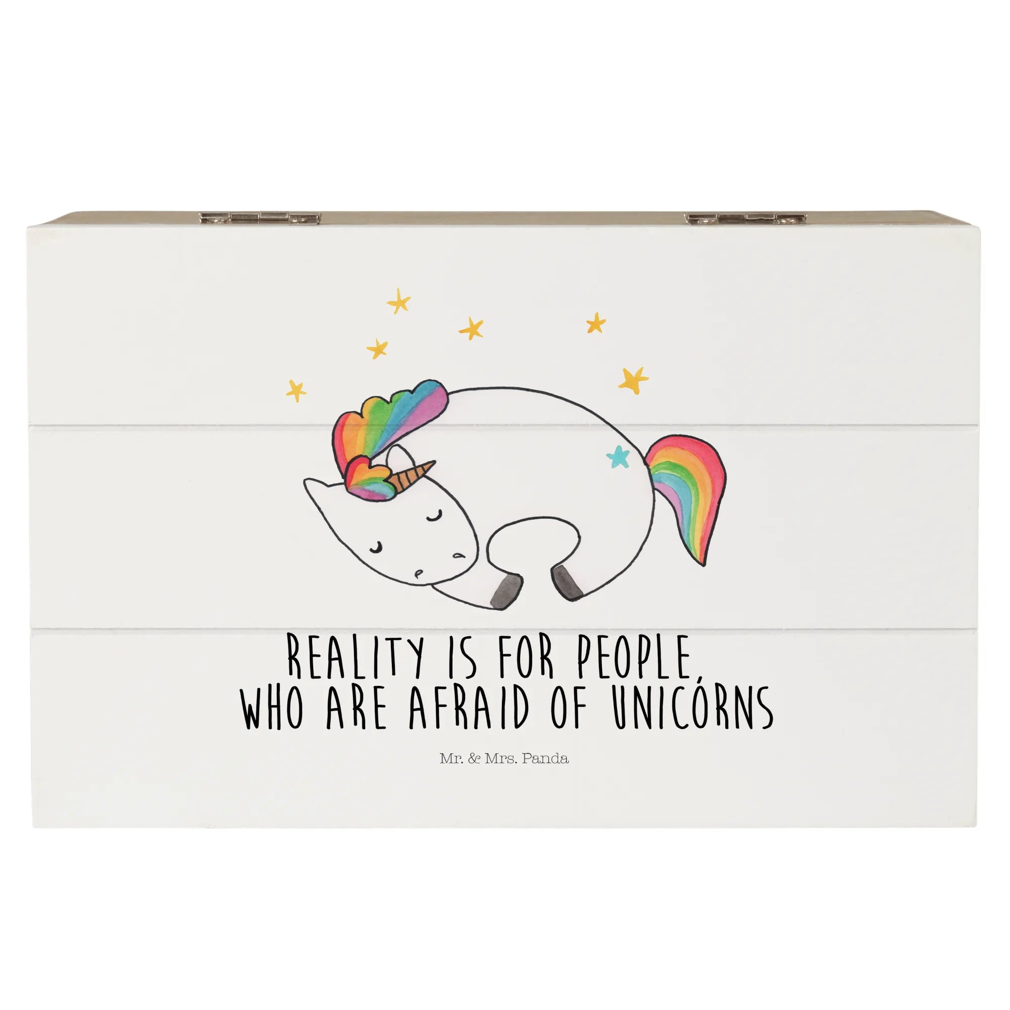 Du suchst nach dem perfekten Geschenk für einen Einhorn-Liebhaber? Dann ist die wunderschöne Holzkiste "Einhorn Nacht" von Mr. & Mrs. Panda genau das Richtige für dich! Diese zauberhafte Schatzkiste beeindruckt mit ihrem niedlichen Motiv eines schlafenden Einhorns, das in seine wunderschönen Träume vertieft ist. Der spritzige Spruch "Die Realität ist was für Menschen, die Angst vor Einhörnern haben" macht die Kiste zu einem besonderen Hingucker.