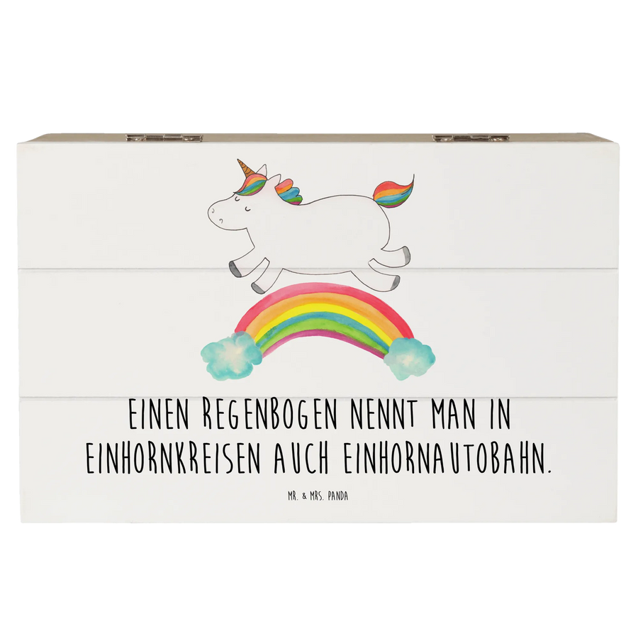 Entdecke unsere zauberhafte Holzkiste mit dem fröhlichen Einhorn Regenbogen Motiv aus der Einhorn - Kollektion von Mr. & Mrs. Panda! Diese wunderschöne Holzkiste ist nicht nur ein echter Hingucker, sondern auch ein ganz besonderer Aufbewahrungsort für all die kleinen Schätze des Lebens.