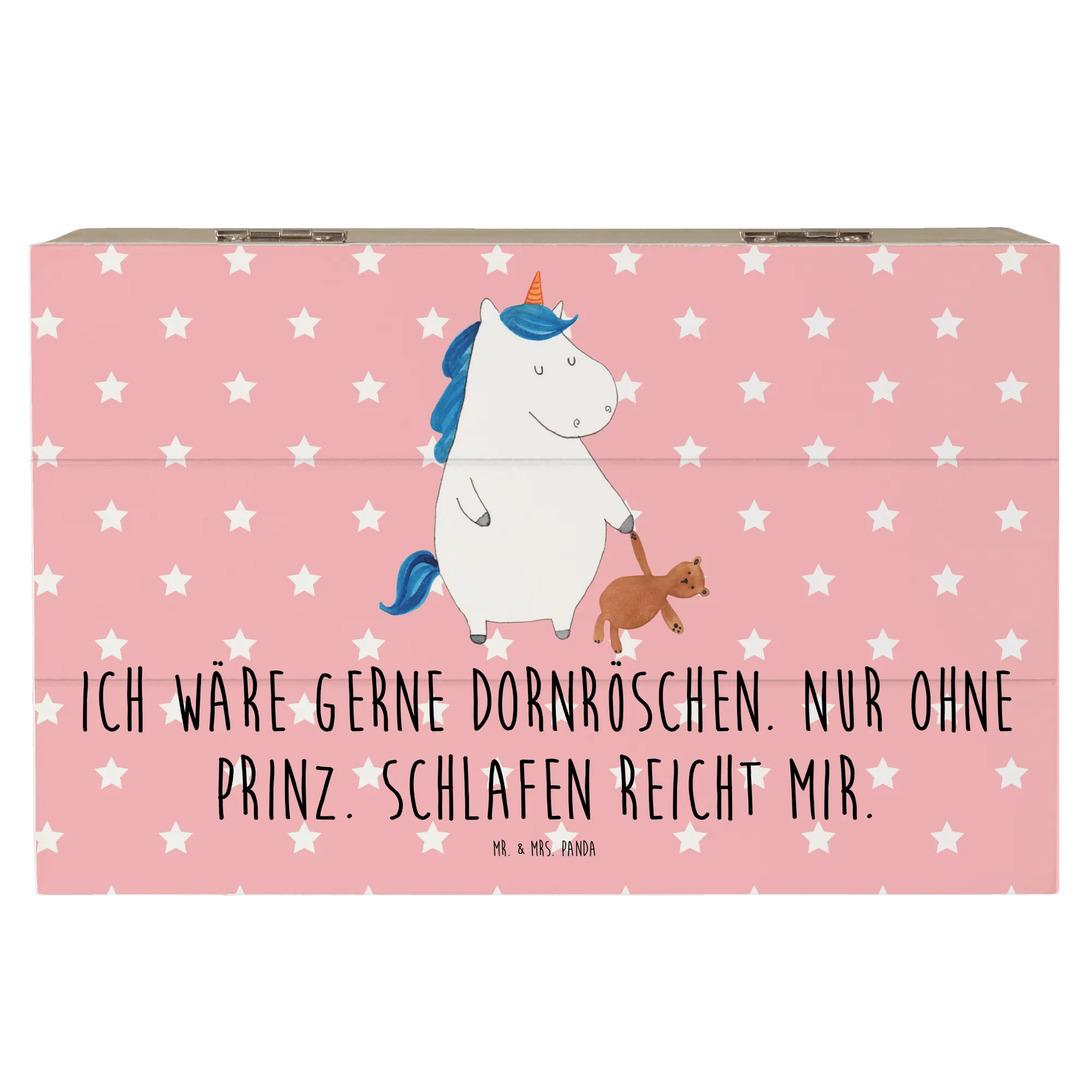 Die wundervolle Holzkiste Einhorn Teddy aus der exklusiven Einhorn-Kollektion von Mr. & Mrs. Panda ist das perfekte Geschenk für alle Einhornliebhaber und träumerischen Seelen. Diese bezaubernde Kiste, bedruckt mit einem handgezeichneten süßen Einhorn, das mit einem Teddy kuschelt, lässt Herzen höher schlagen. Der Spruch "Ich wäre gerne Dornröschen. Nur ohne Prinz. Schlafen reicht mir." bringt zusätzlich einen Hauch von Magie und Verspieltheit ins Spiel.