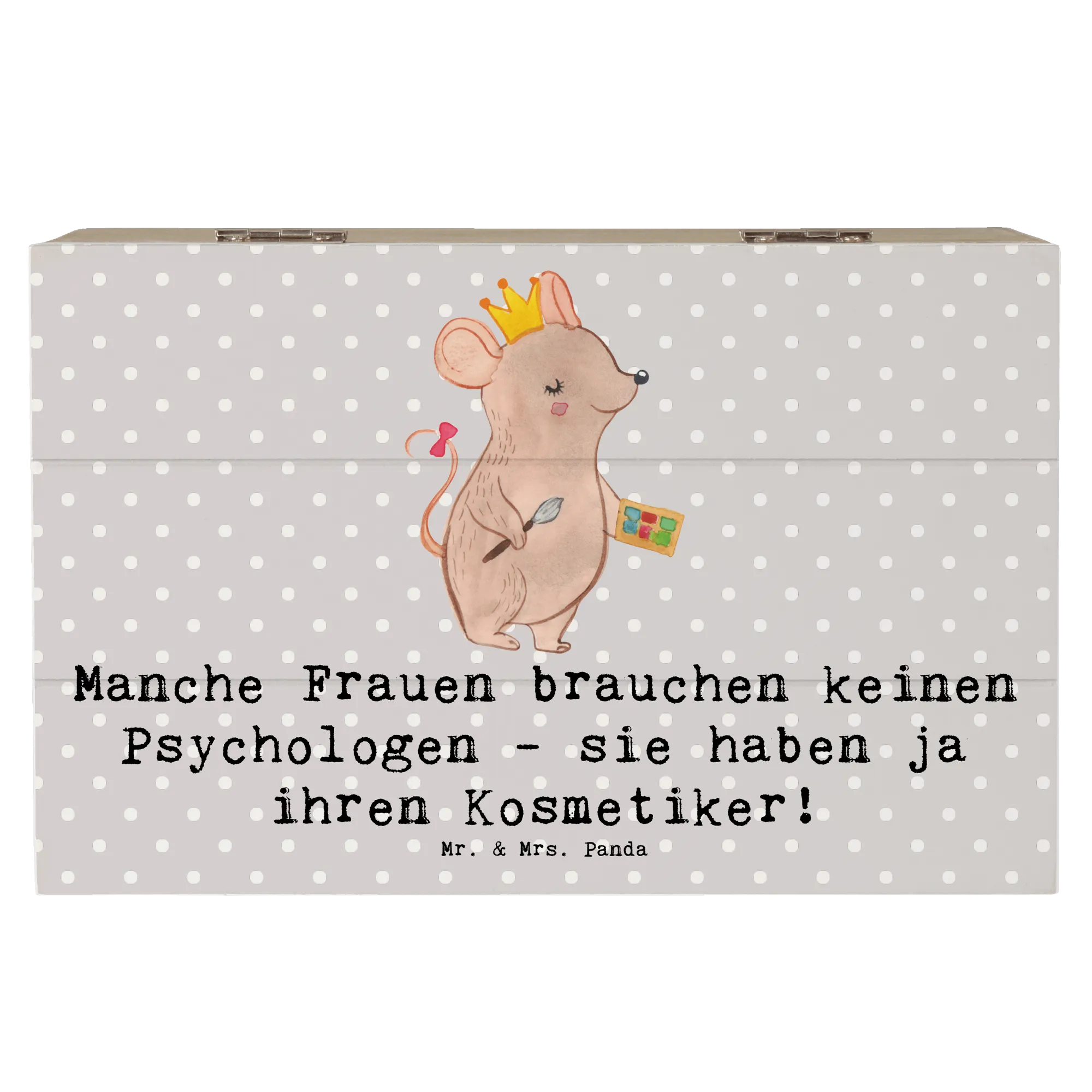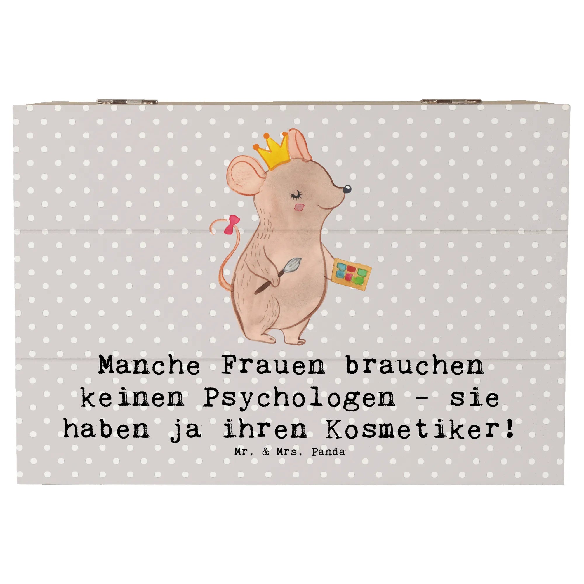 Die wunderschöne Holzkiste von Mr. & Mrs. Panda ist das perfekte Geschenk für jeden Kosmetiker und all jene, die die Schönheit lieben! Mit dem liebevoll designten Motiv 'Manche Frauen brauchen keinen Psychologen - sie haben ja ihren Kosmetiker!' ist diese Kiste nicht nur ein echter Hingucker, sondern auch ein Ausdruck von Wertschätzung für die Kunst der Schönheitspflege.
