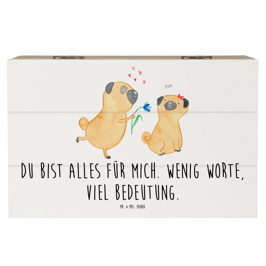 Die zauberhafte Holzkiste "Mops verliebt" von Mr. & Mrs. Panda ist das perfekte Geschenk für Hundeliebhaber und alle, die die Liebe zu ihren treuen Vierbeinern teilen möchten. Diese wunderschöne Kiste aus robuster Holzfaser bietet ausreichend Platz für besondere Erinnerungen, sei es für Fotos, kleine Schätze, oder als dekorative Aufbewahrungsbox. Der verspielte Aufdruck zweier niedlicher Möpse, die verliebt aufeinander blicken, sorgt für ein Lächeln auf dem Gesicht jeder Hundeliebhaberin. Unter dem liebevollen Motiv befindet sich der Slogan "Du bist alles für mich. Wenig Worte, viel Bedeutung." – eine schöne Botschaft für deinen Partner oder einen lieben Freund.