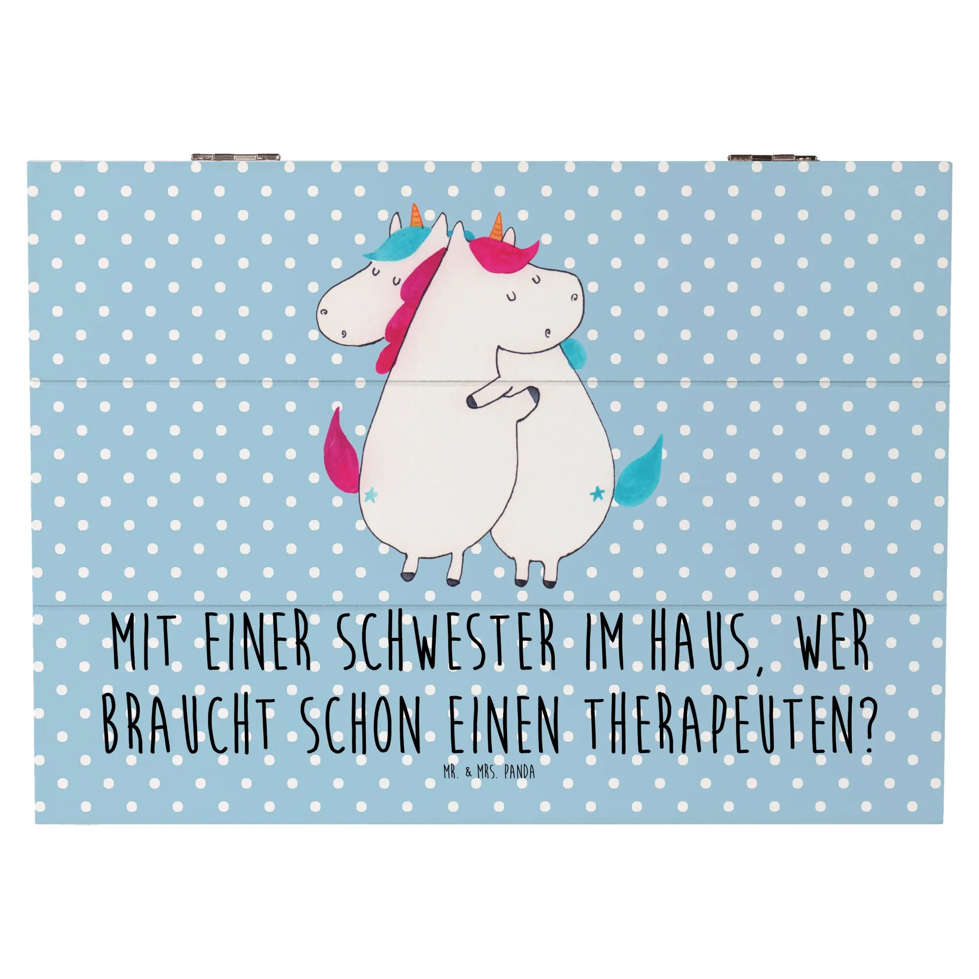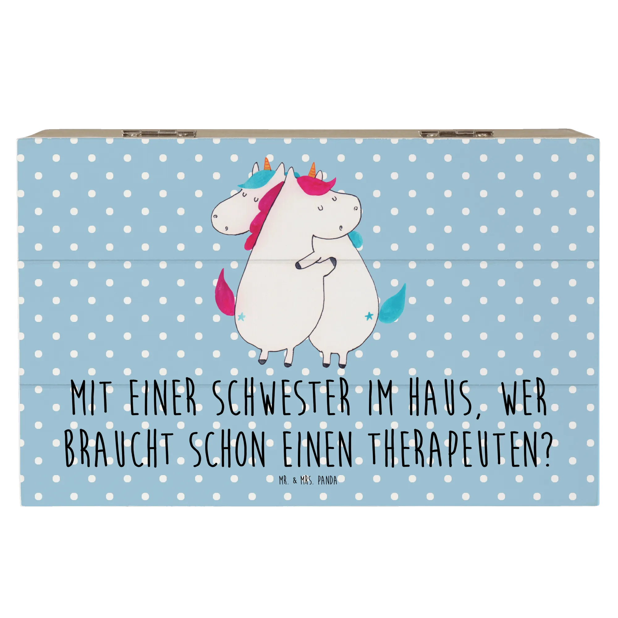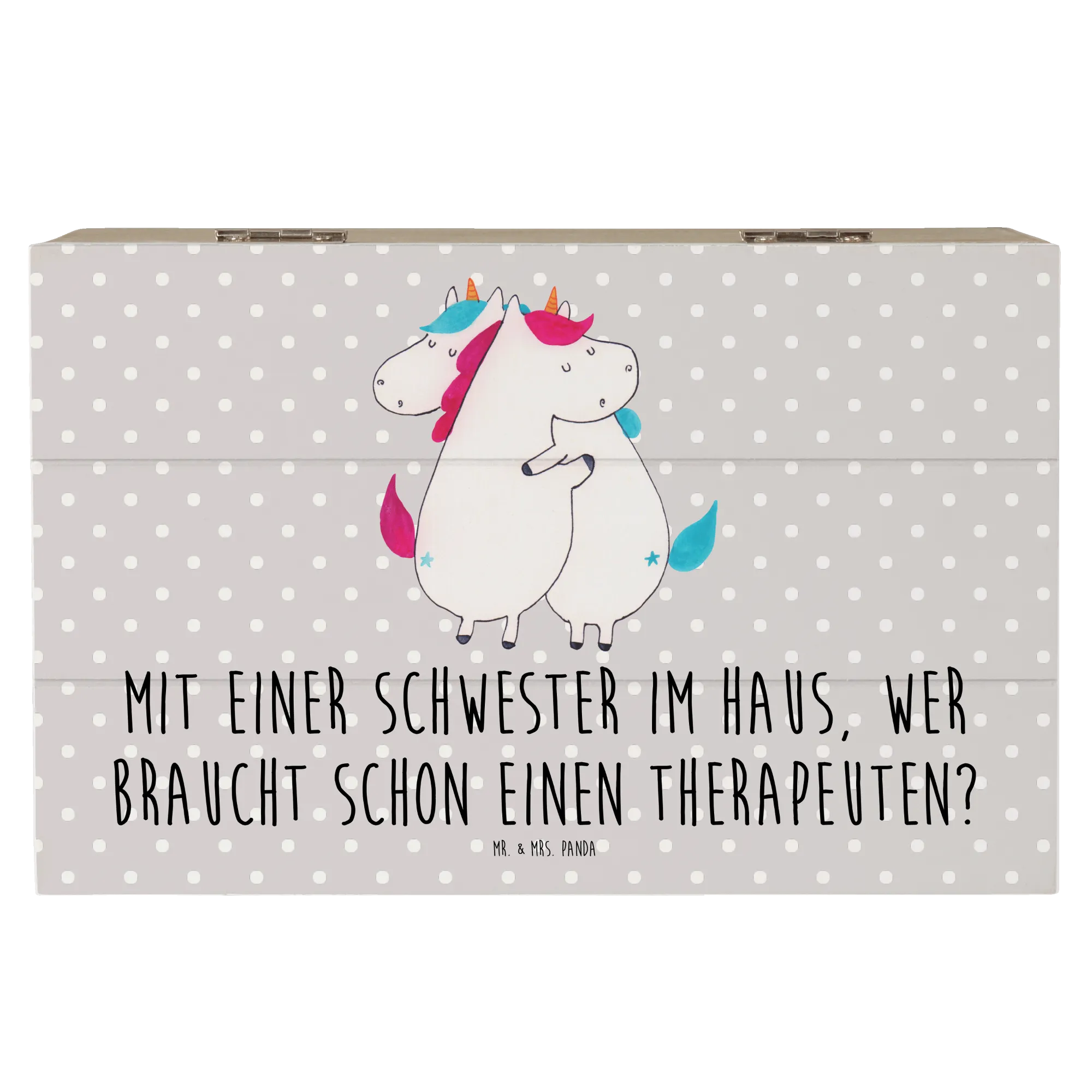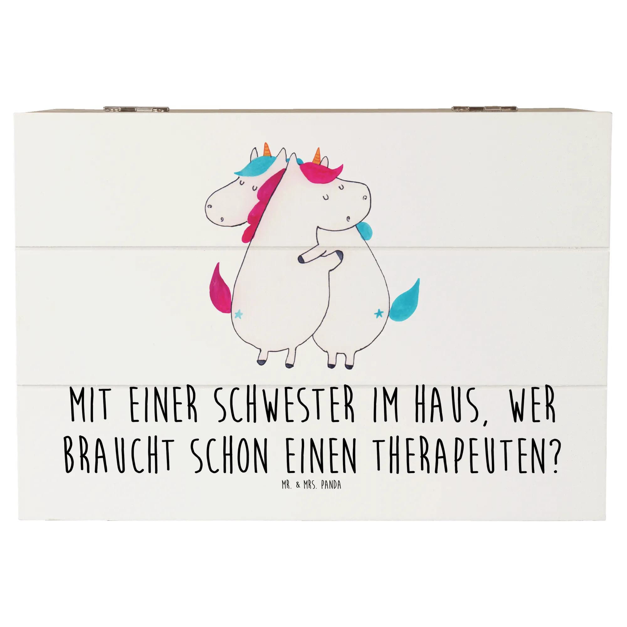 Die Holzkiste von Mr. & Mrs. Panda ist das perfekte Geschenk für alle Schwestern und die, die sie lieben! Mit dem liebevollen Spruch "Mit einer Schwester im Haus, wer braucht schon einen Therapeuten?" fängt diese Erinnerungskiste die besondere Verbindung zwischen Geschwistern ein. Egal ob zum Geburtstag, zur Hochzeit oder einfach als kleines Dankeschön – diese Kiste ist ein echter Schatz!
