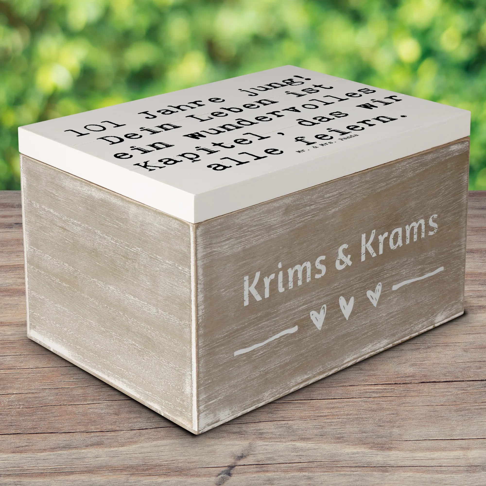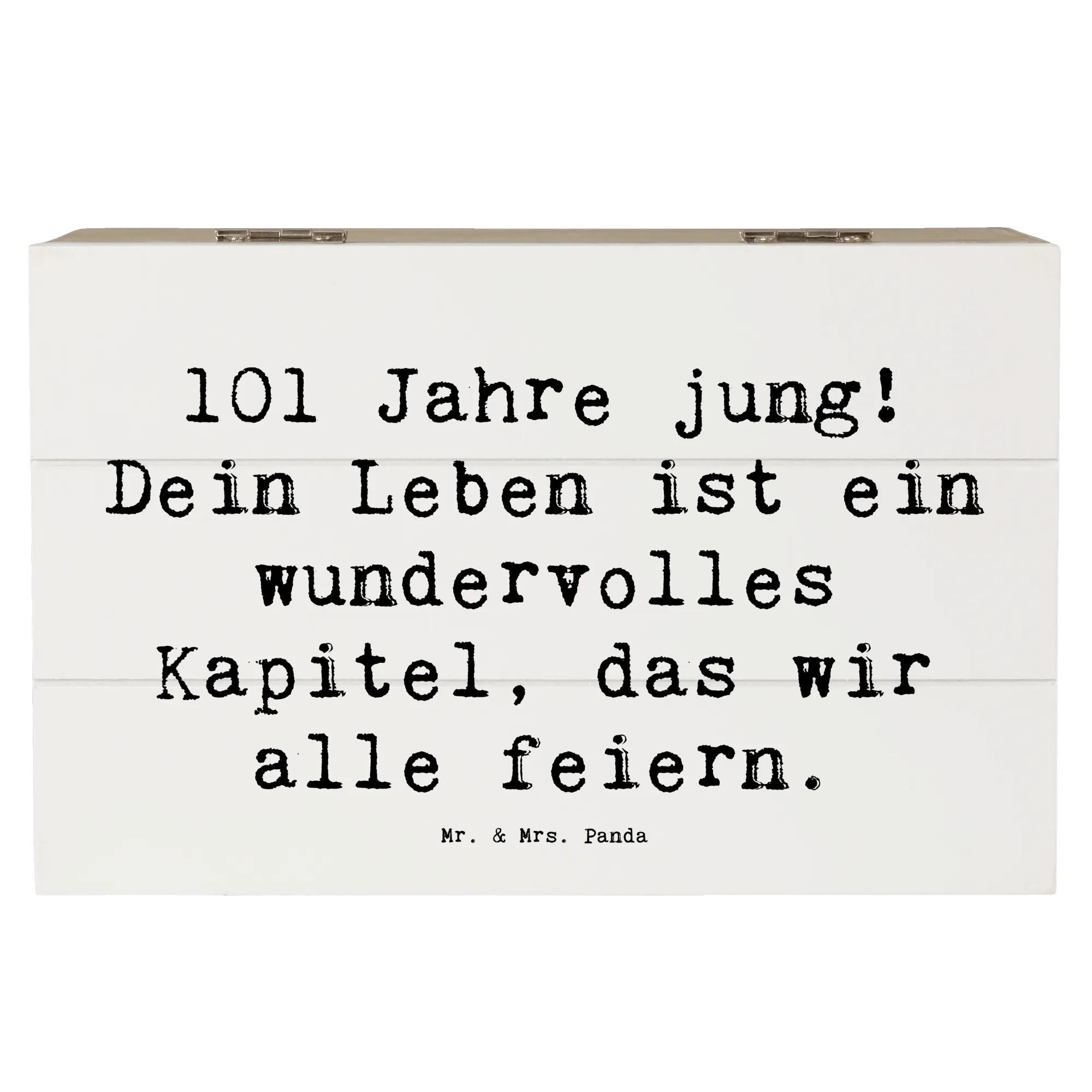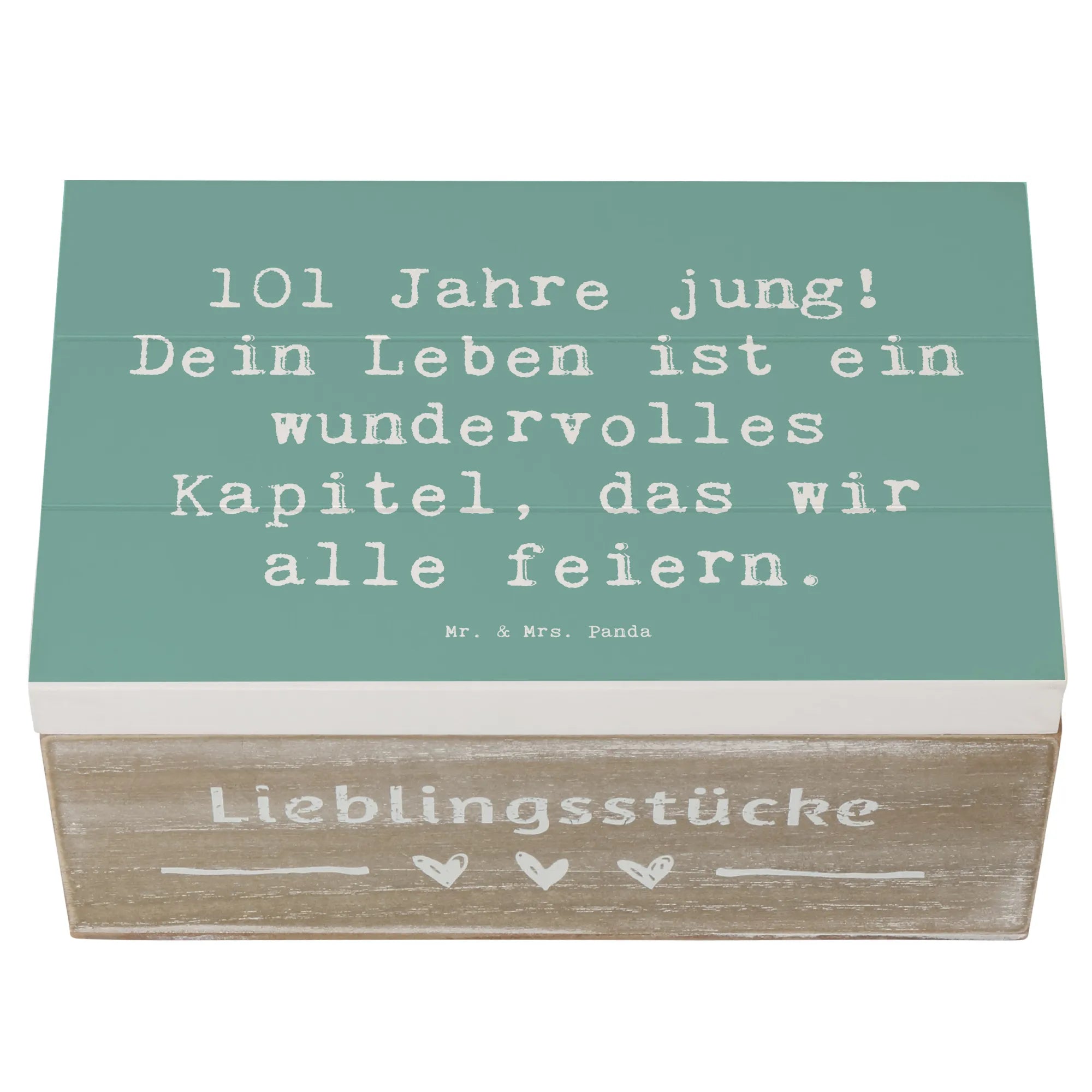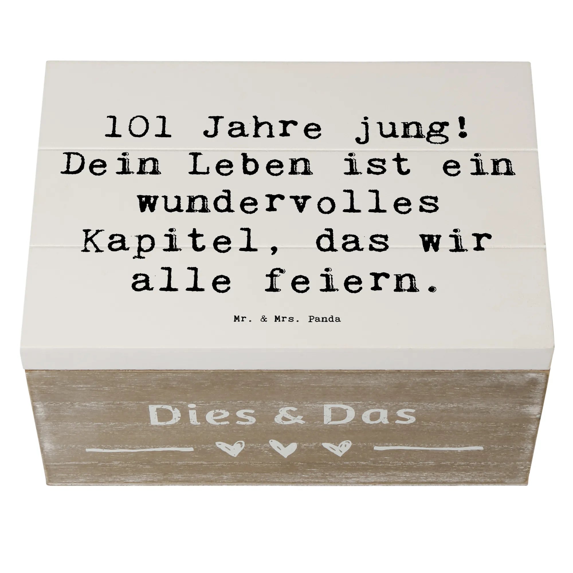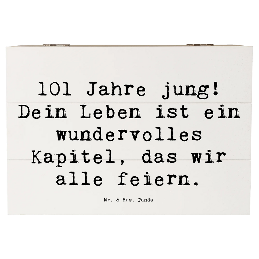 Die wunderschöne Holzkiste von Mr. & Mrs. Panda ist das perfekte Geschenk zum 101. Geburtstag! Mit dem liebevollen Spruch "101 Jahre jung! Dein Leben ist ein wundervolles Kapitel, das wir alle feiern." macht sie jede Feier zu etwas ganz Besonderem. Diese Erinnerungskiste bietet nicht nur ausreichend Platz für all die kostbaren Schätze, die ein Leben lang gesammelt wurden, sondern auch für die tollen Momente, die in Zukunft noch kommen.