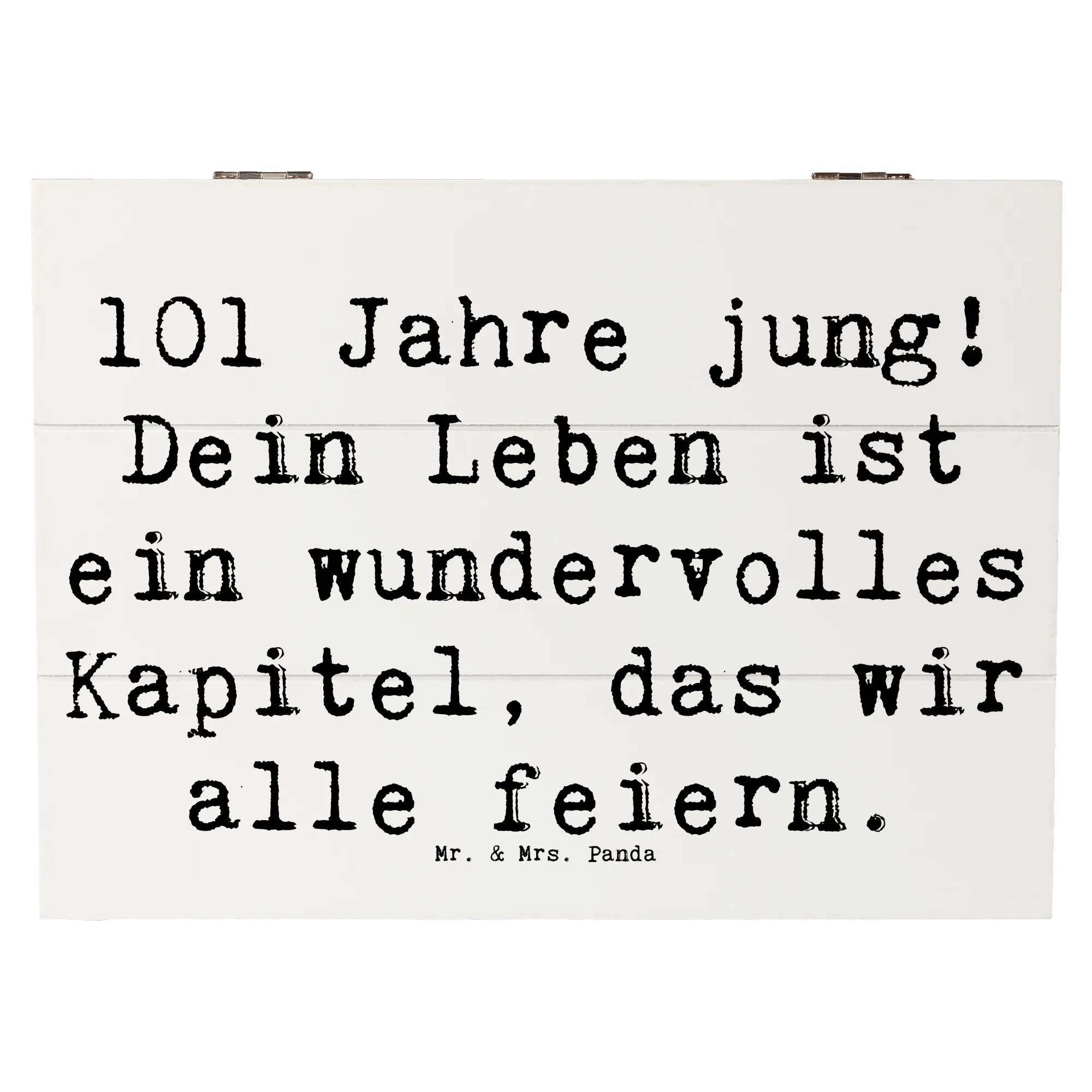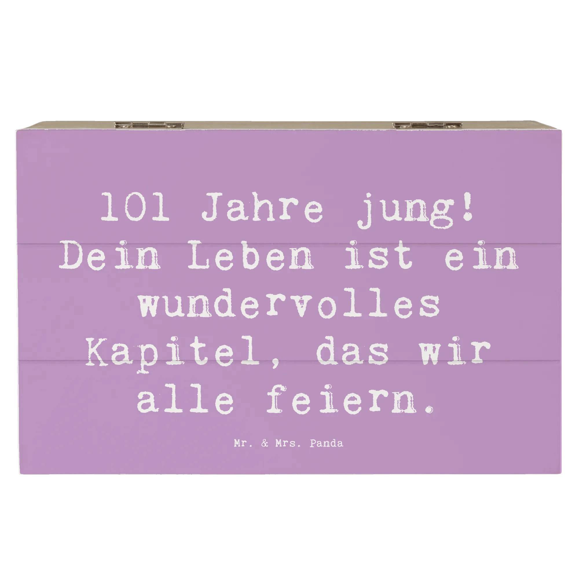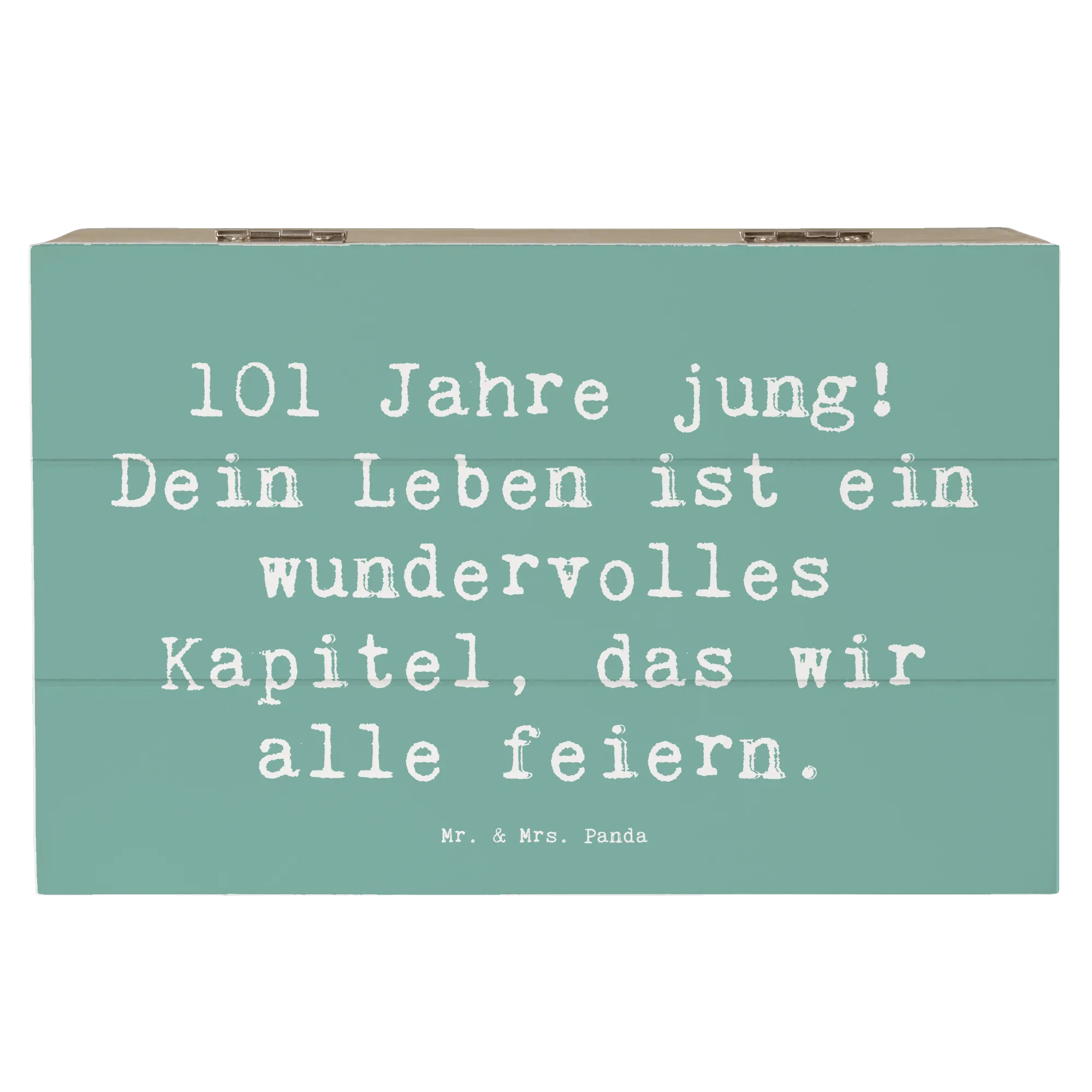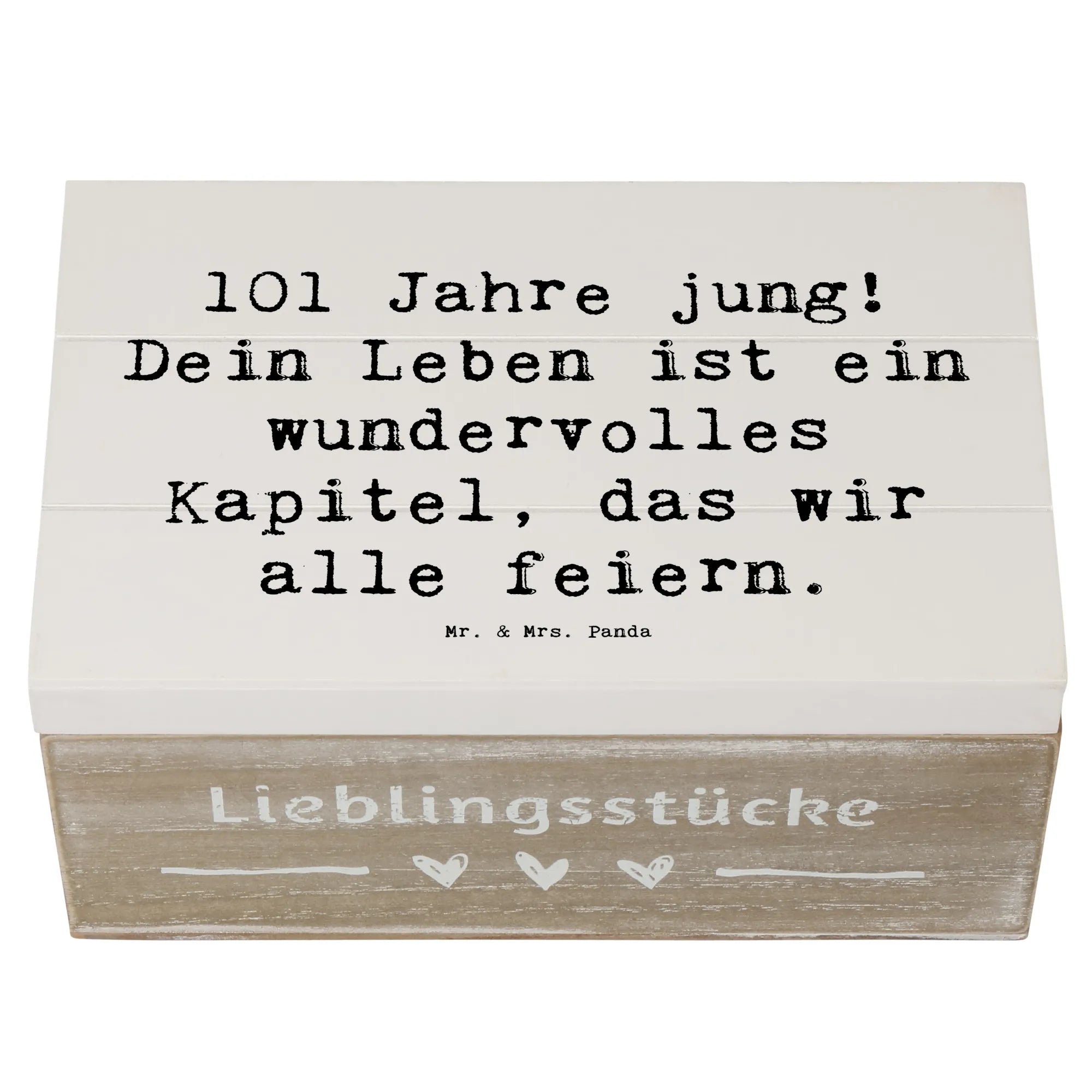 Die wunderschöne Holzkiste von Mr. & Mrs. Panda ist das perfekte Geschenk zum 101. Geburtstag! Mit dem liebevollen Spruch "101 Jahre jung! Dein Leben ist ein wundervolles Kapitel, das wir alle feiern." macht sie jede Feier zu etwas ganz Besonderem. Diese Erinnerungskiste bietet nicht nur ausreichend Platz für all die kostbaren Schätze, die ein Leben lang gesammelt wurden, sondern auch für die tollen Momente, die in Zukunft noch kommen.