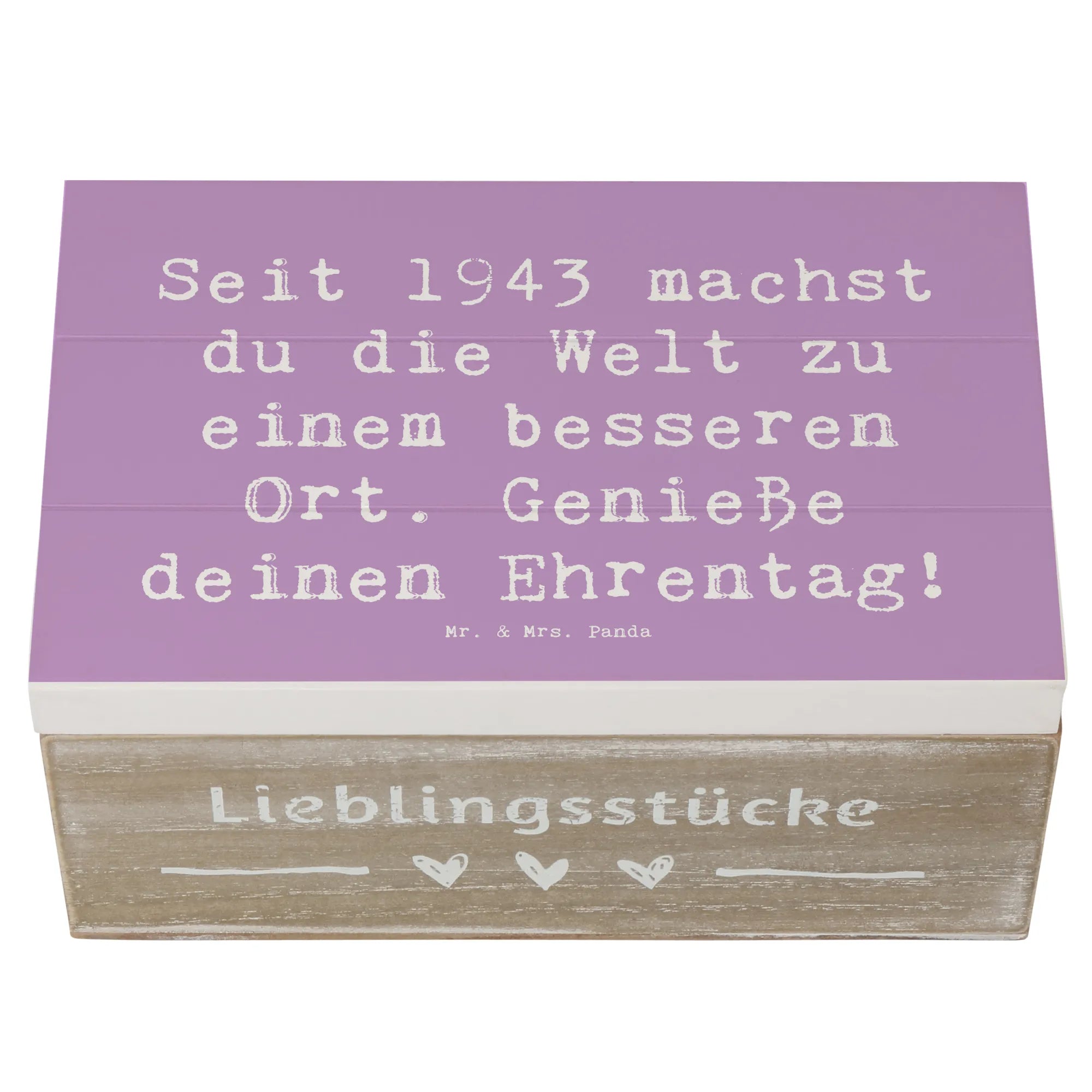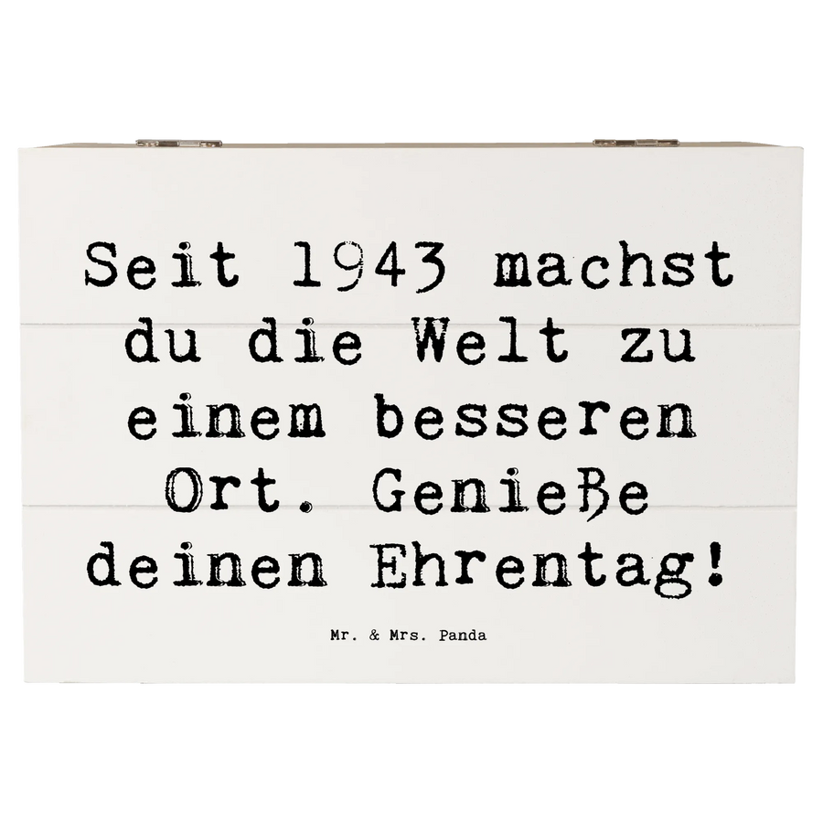 Entdecke die wunderschöne Holzkiste von Mr. & Mrs. Panda, die ganz besonders für Menschen gedacht ist, die 1943 das Licht der Welt erblickt haben. Diese zauberhafte Erinnerungskiste bringt nicht nur Freude, sondern hält auch die schönsten Erinnerungen fest. Mit einem hübschen Motiv und dem liebevollen Spruch 'Seit 1943 machst du die Welt zu einem besseren Ort. Genieße deinen Ehrentag!' ist sie das perfekte Geschenk zum Geburtstag.