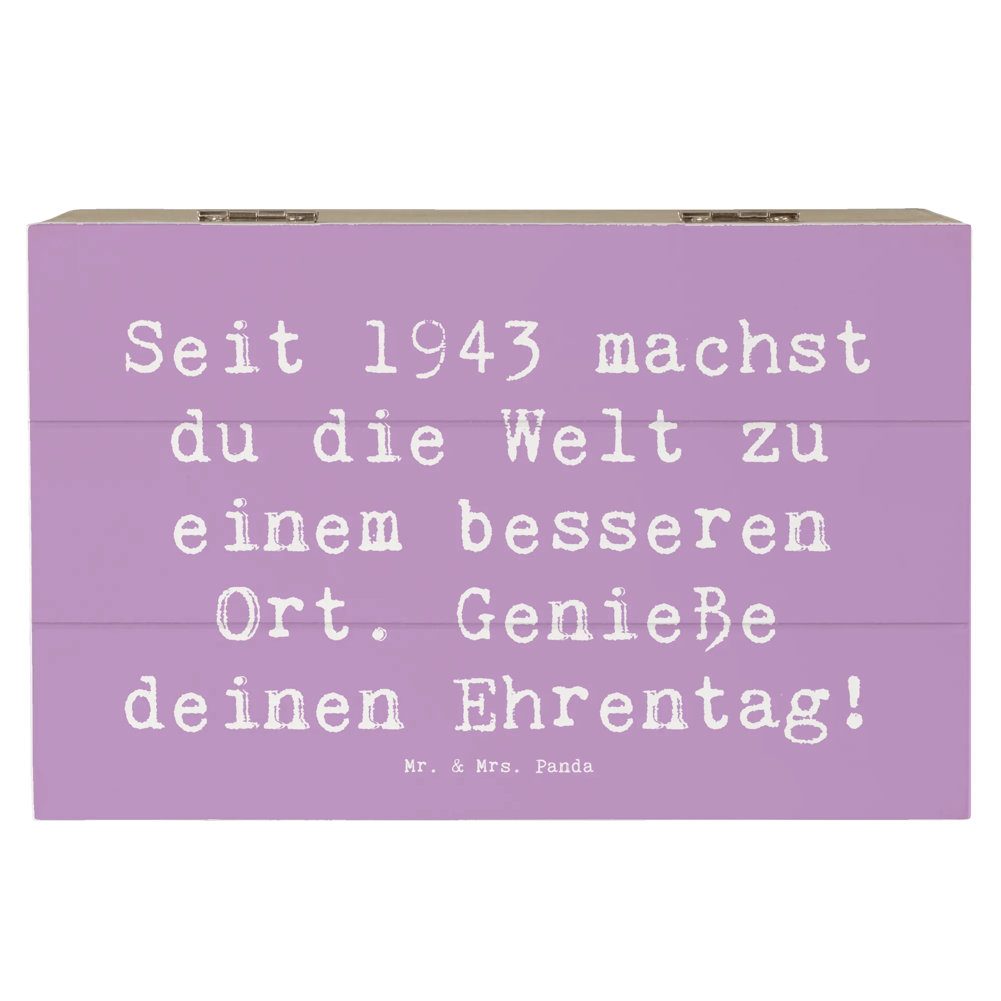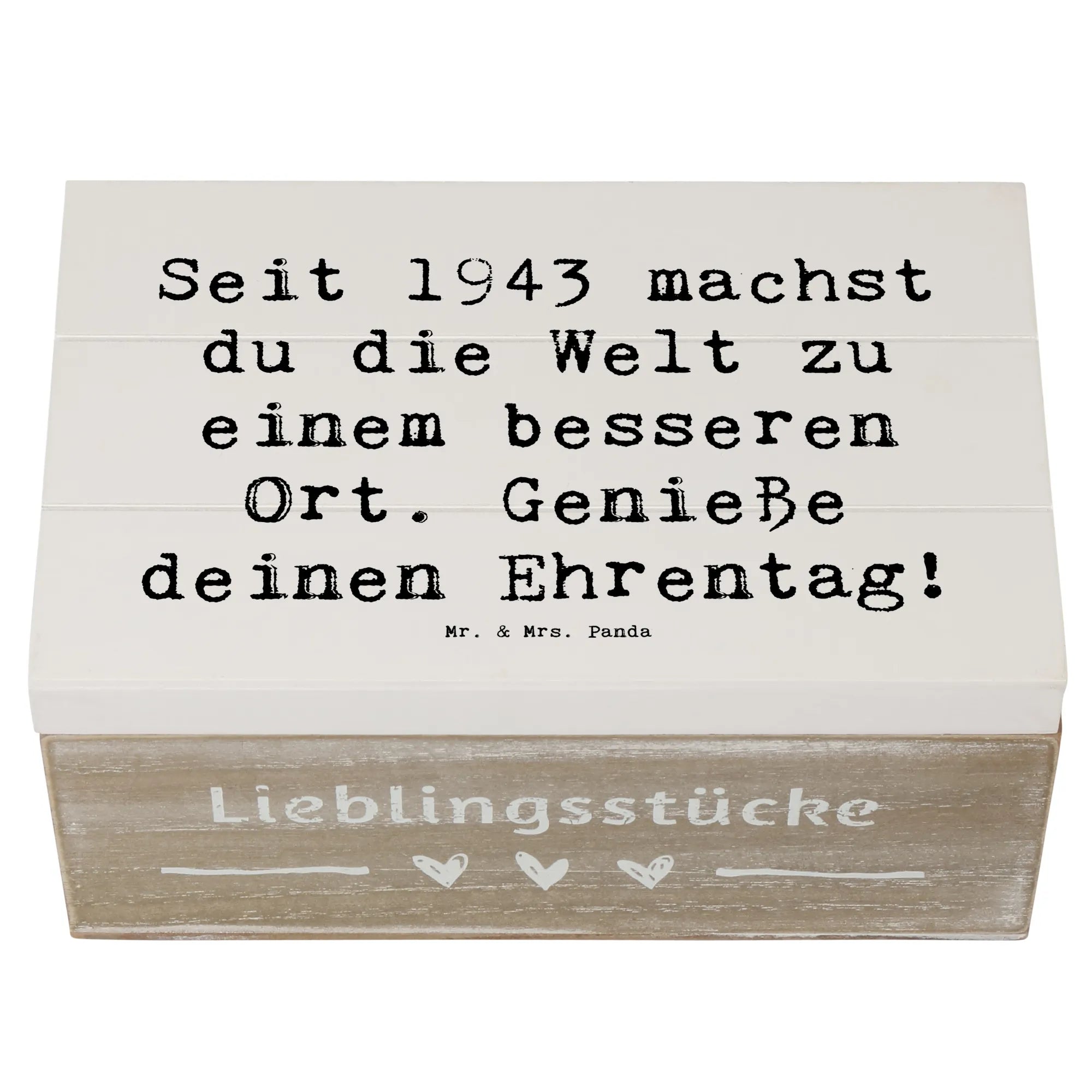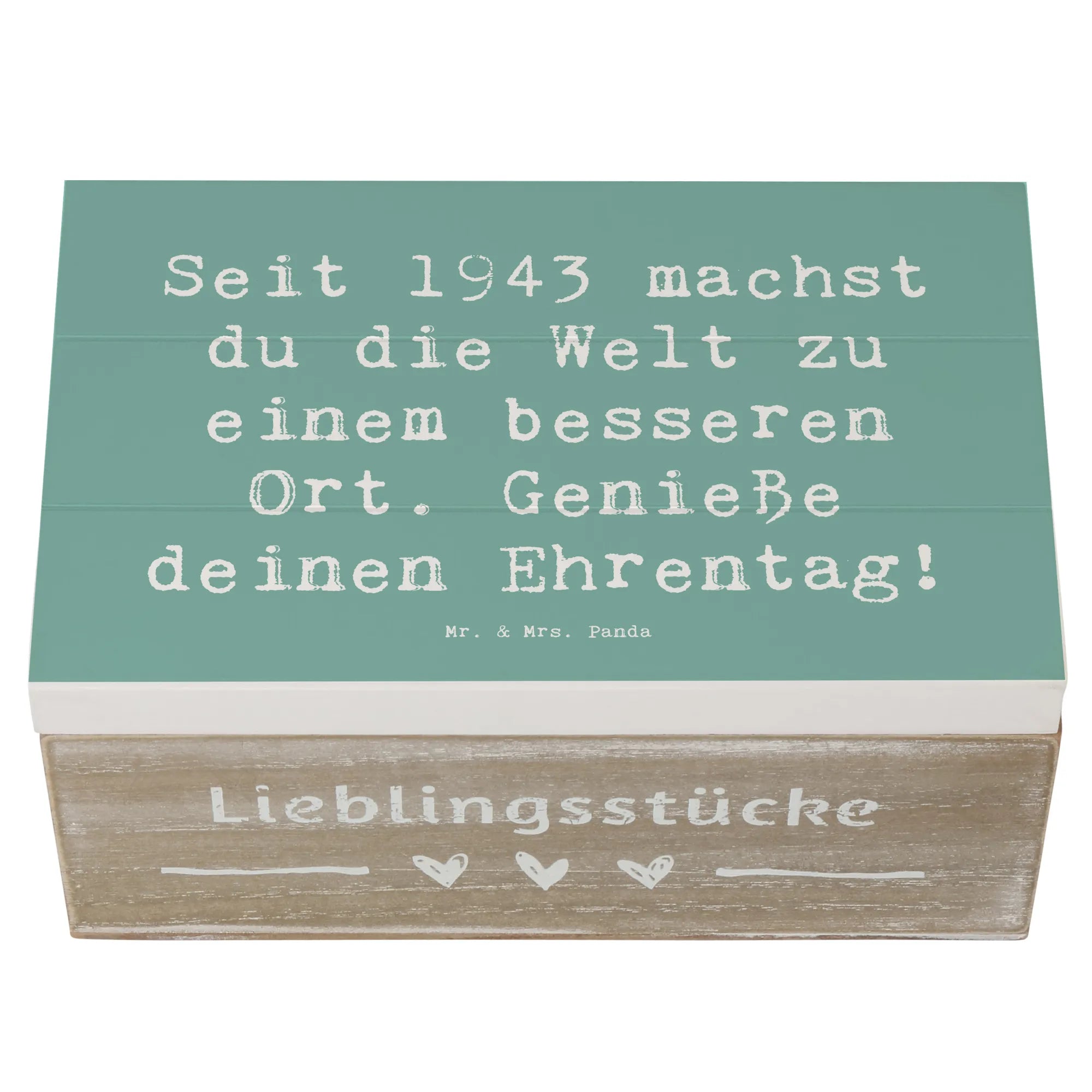 Du kannst sie als dekorative Aufbewahrungsbox nutzen oder als nachhaltige Geschenkbox für Freunde und Familie einsetzen. Die Kiste ist stabil, hat Einschlagscharniere für ein einfaches Öffnen und Schließen und ist in mehreren Größen erhältlich. Der liebevolle Spruch "Seit 1943 machst du die Welt zu einem besseren Ort. Genieße deinen Ehrentag!" sorgt für ein Lächeln und macht jedes Geschenk noch besonderer.