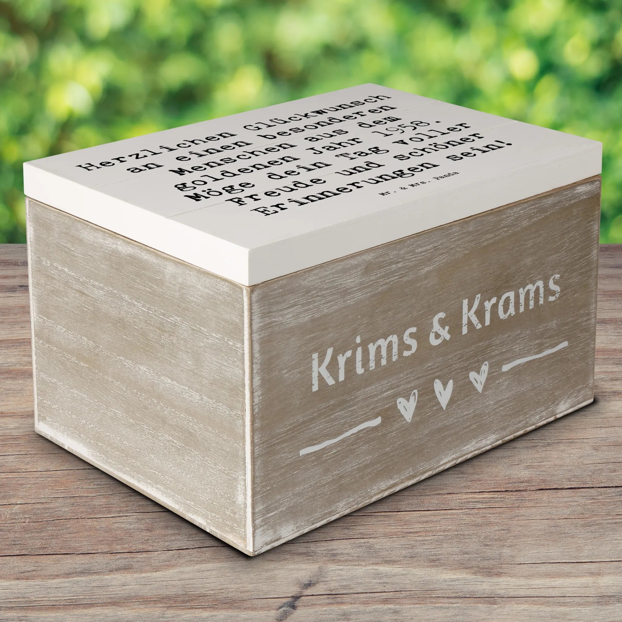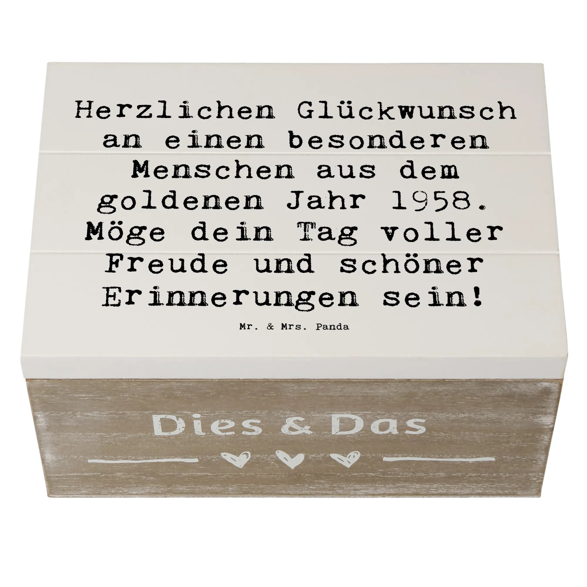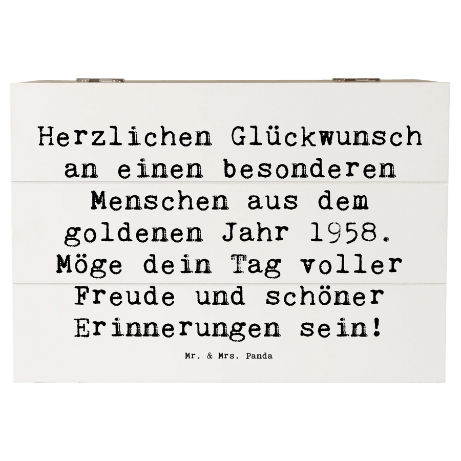 Die wunderschöne Holzkiste von Mr. & Mrs. Panda ist das perfekte Geschenk für jeden, der im goldenen Jahr 1958 das Licht der Welt erblickte! Diese liebevoll gestaltete Erinnerungskiste begeistert nicht nur durch ihr ansprechendes Design, sondern bietet auch ausreichend Platz, um die schönsten Erinnerungen und Schätze aufzubewahren.
