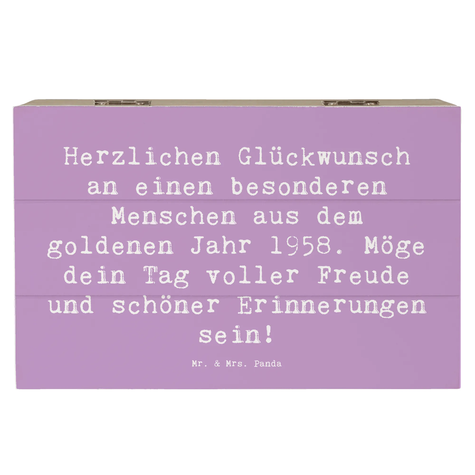 Du möchtest jemandem zum Geburtstag gratulieren? Dann schenk ihm die Holzkiste mit dem liebevollen Slogan: "Herzlichen Glückwunsch an einen besonderen Menschen aus dem goldenen Jahr 1958. Möge dein Tag voller Freude und schöner Erinnerungen sein!"