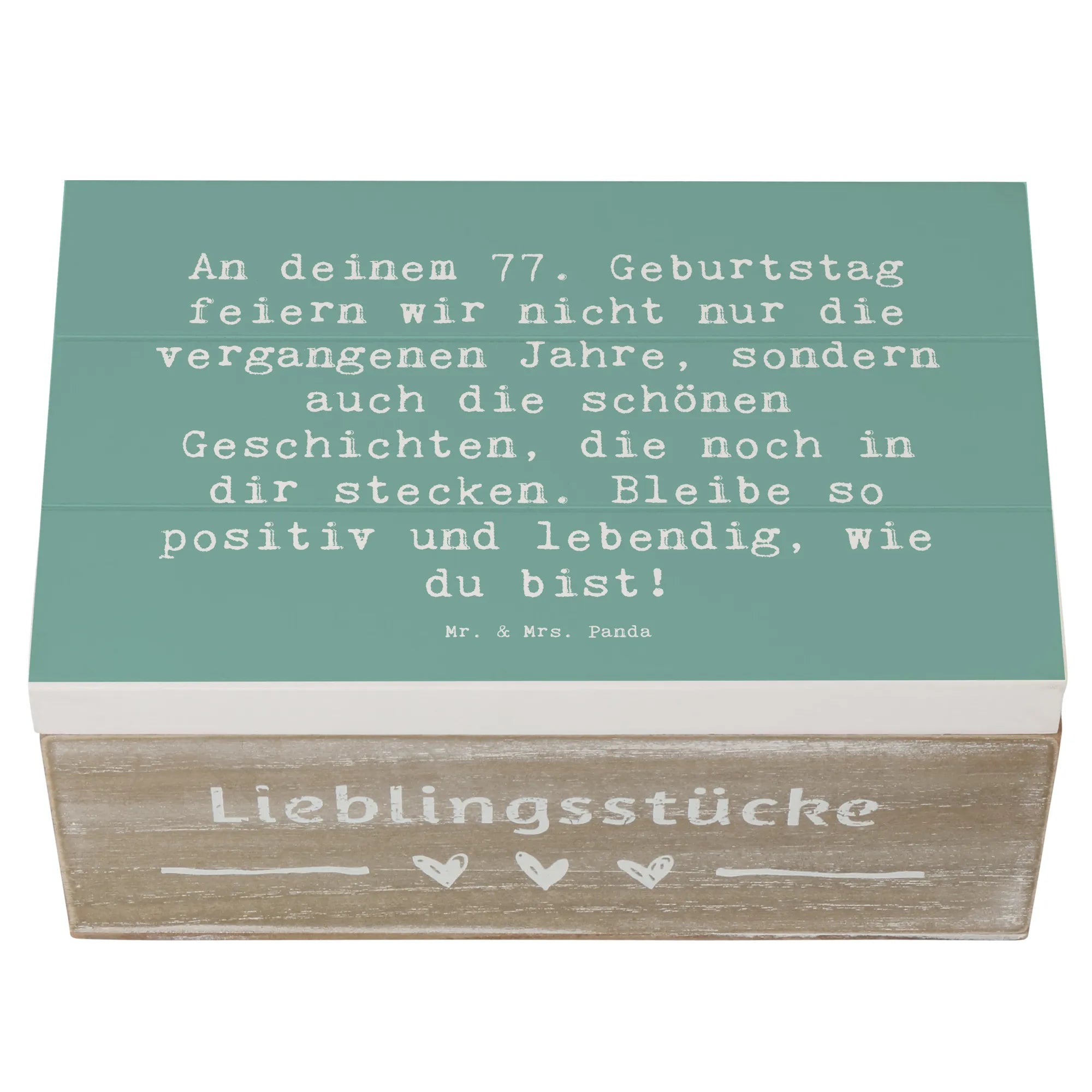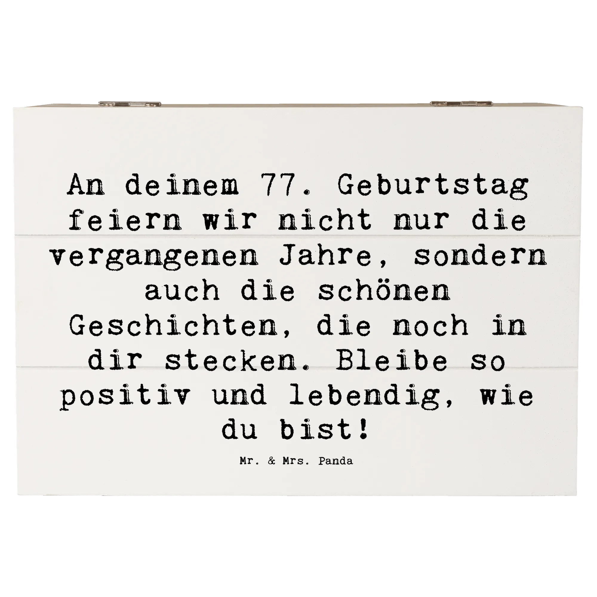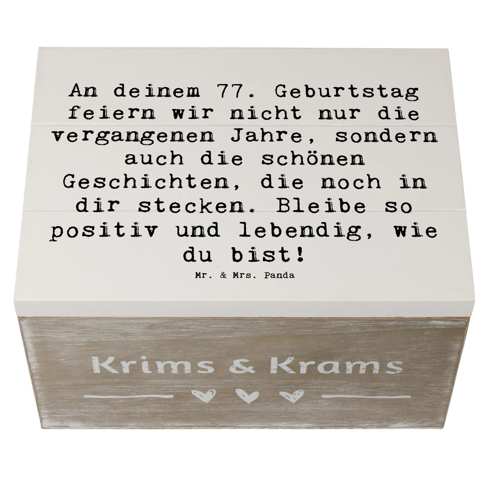 Ein besonderes Geschenk für Familie und Freunde, die ihren 77. Geburtstag gebührend feiern möchten. Schaffe mit der Holzkiste von Mr. & Mrs. Panda unvergessliche Erinnerungen, die ein Leben lang halten! Perfekt zur Nutzung bei Geburtsfeiern, Jubiläen oder einfach als schöne Aufbewahrung für die kleinen und großen Schätze des Lebens.