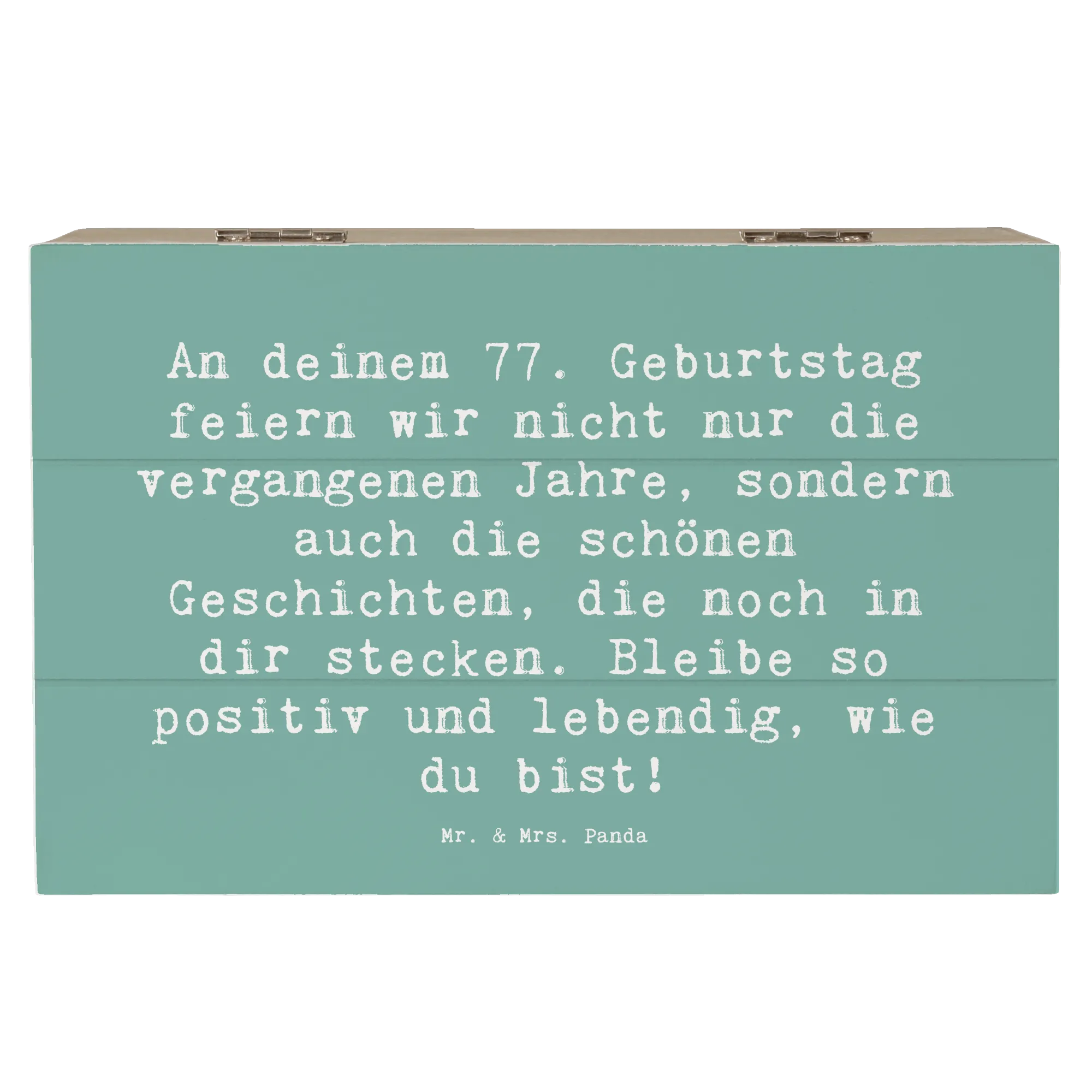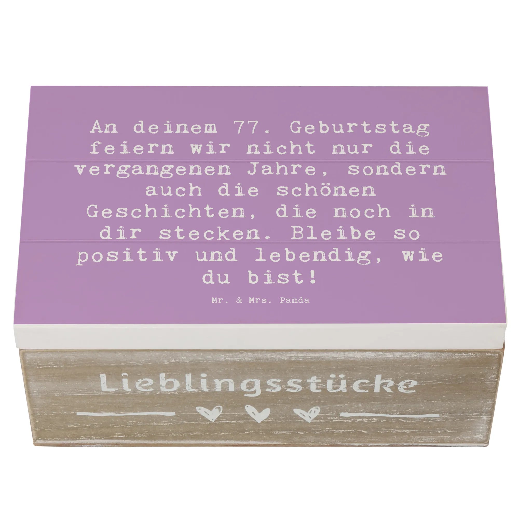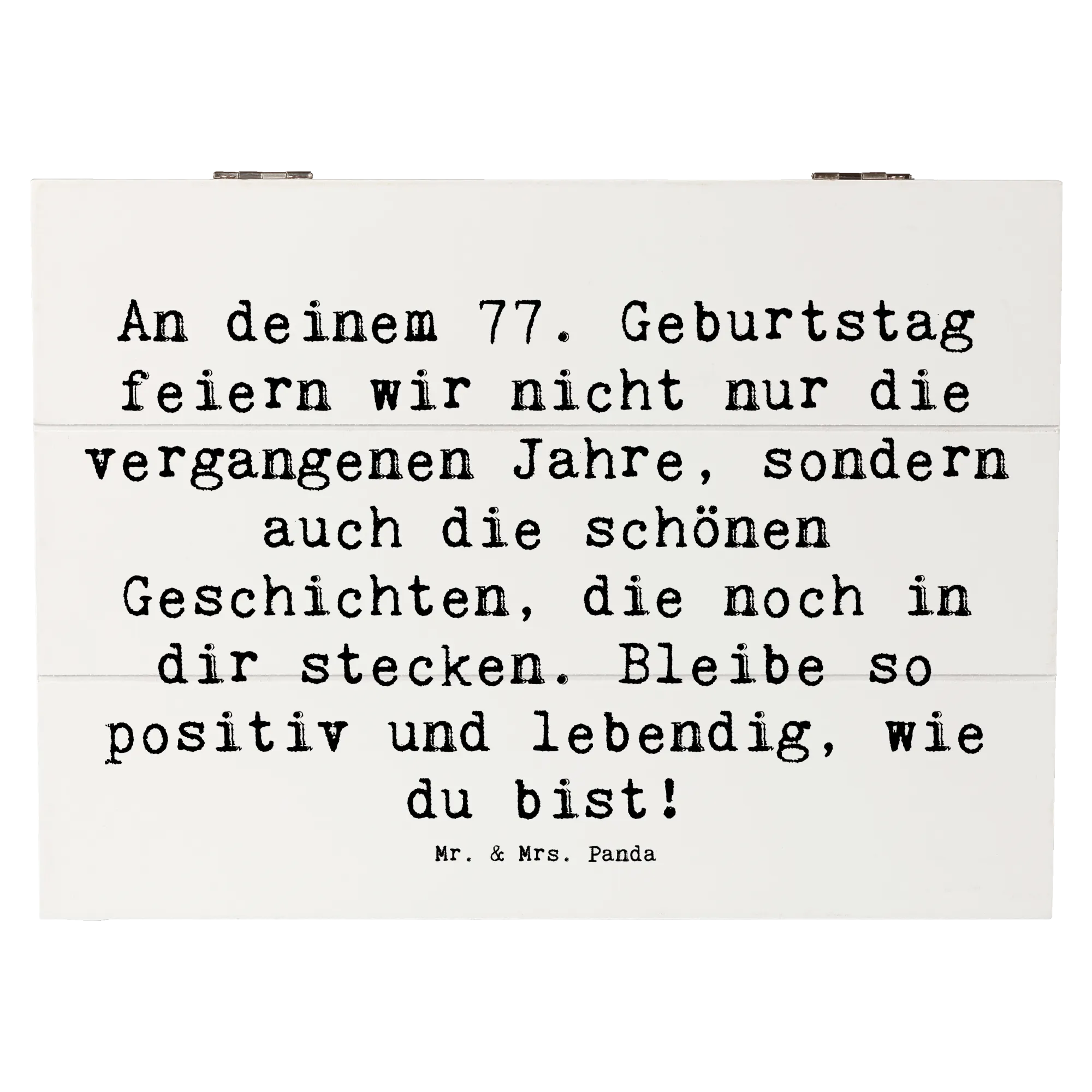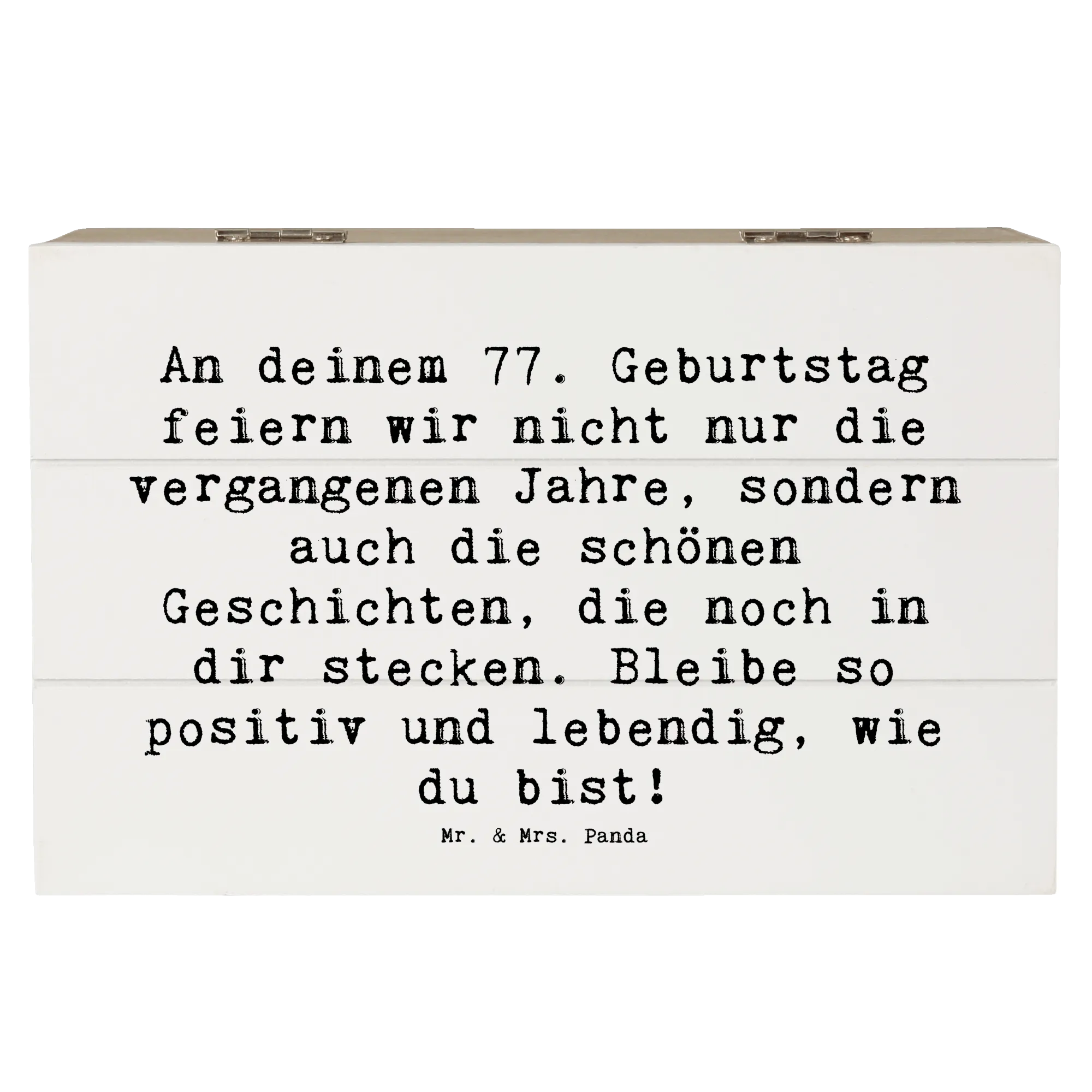 Ein besonderes Geschenk für Familie und Freunde, die ihren 77. Geburtstag gebührend feiern möchten. Schaffe mit der Holzkiste von Mr. & Mrs. Panda unvergessliche Erinnerungen, die ein Leben lang halten! Perfekt zur Nutzung bei Geburtsfeiern, Jubiläen oder einfach als schöne Aufbewahrung für die kleinen und großen Schätze des Lebens.