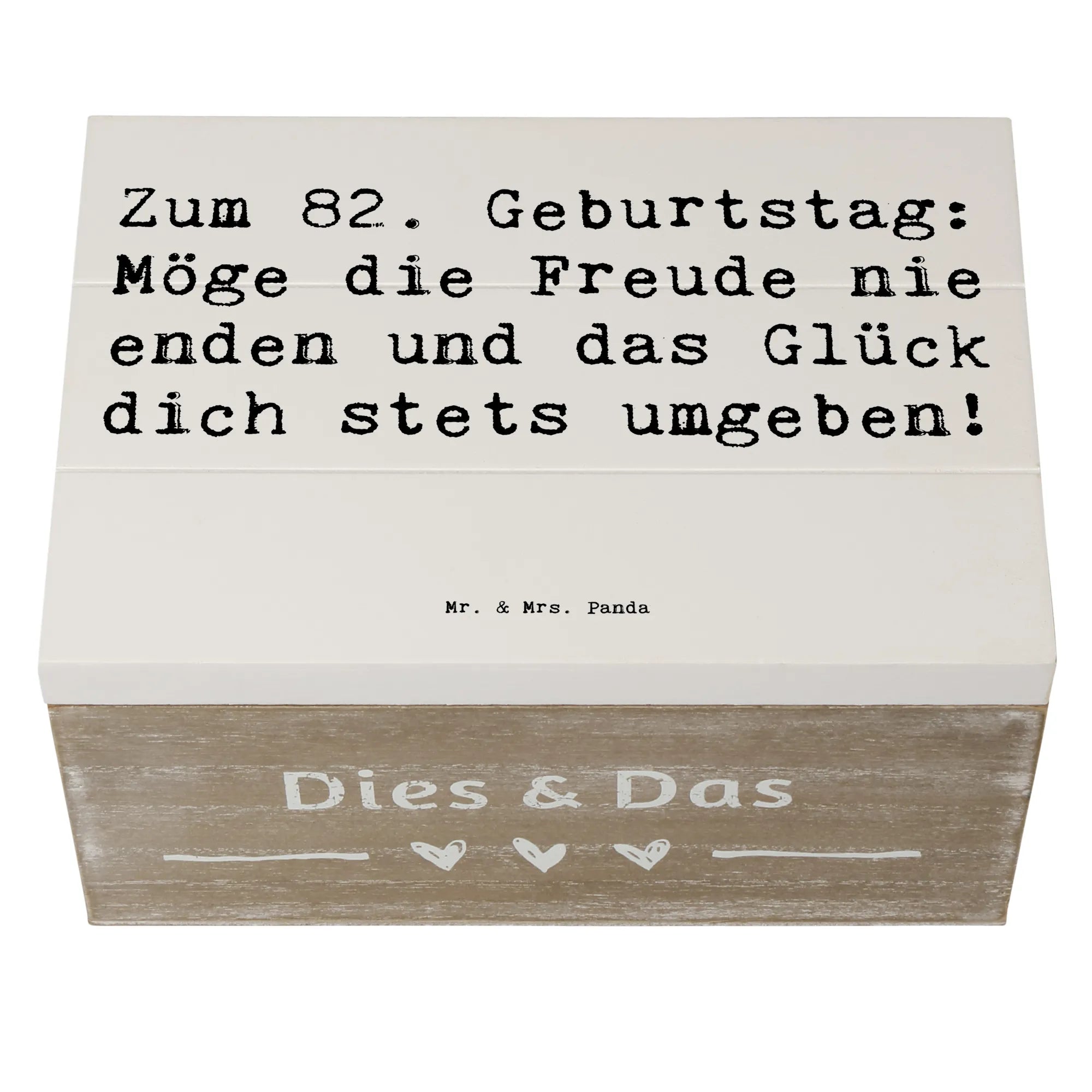 Die wunderschöne Holzkiste von Mr. & Mrs. Panda zum 82. Geburtstag ist das perfekte Geschenk, um diesen besonderen Tag unvergesslich zu machen. Diese Erinnerungskiste besticht durch ihr liebevolles Design, das mit dem bewegenden Slogan "Zum 82. Geburtstag: Möge die Freude nie enden und das Glück dich stets umgeben!" verziert ist. Sie ist ideal geeignet, um wundervolle Schätze aufzubewahren – sei es für Erinnerungen an die Kindheit, festliche Anlässe oder einfach nur als eine stilvolle Dekokiste.