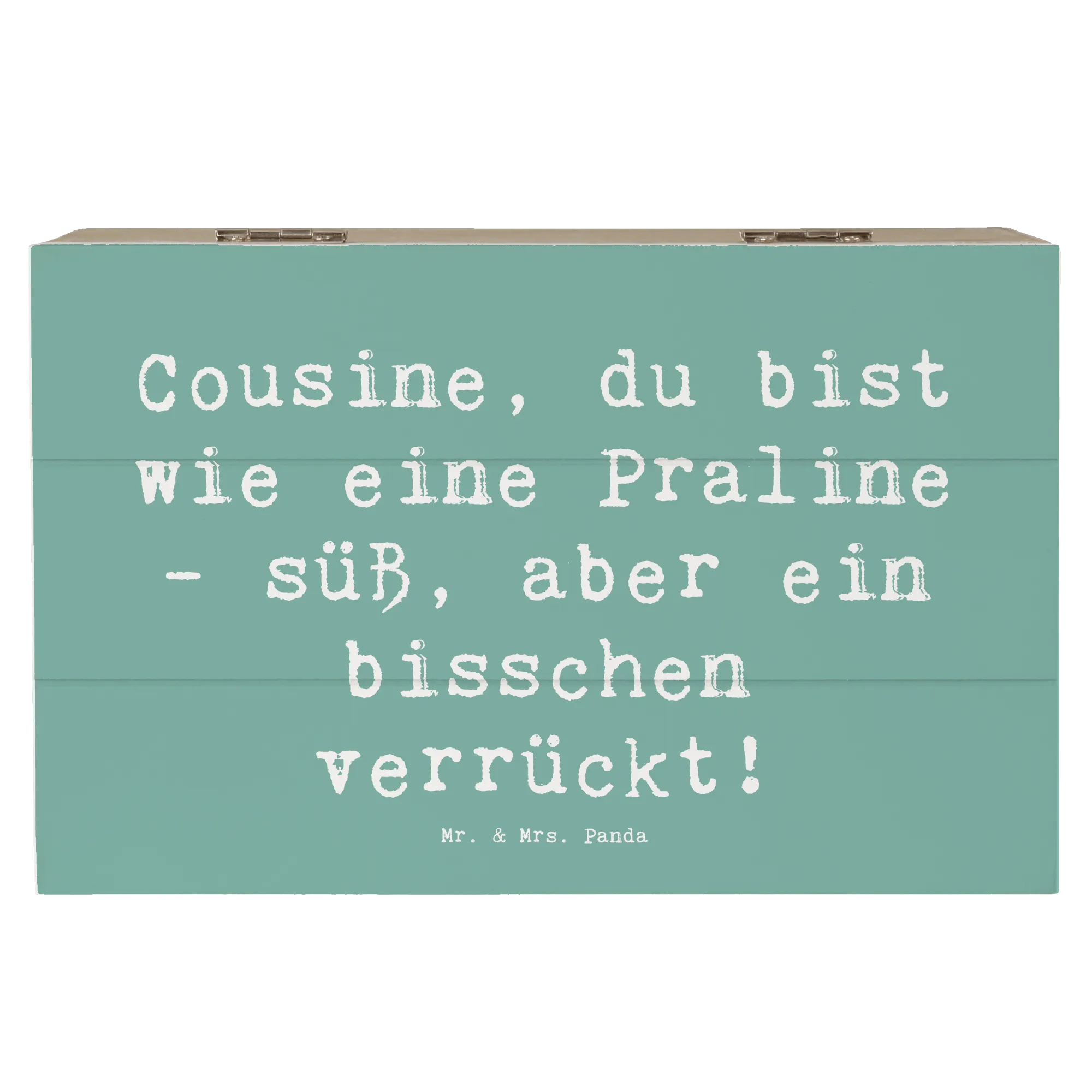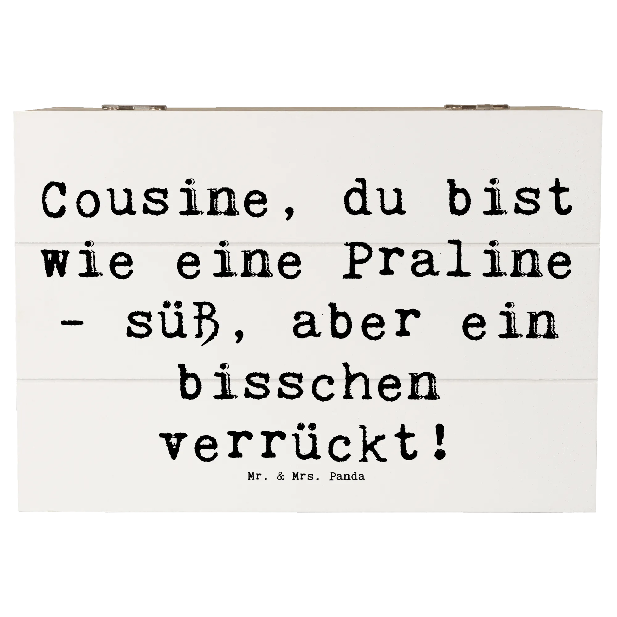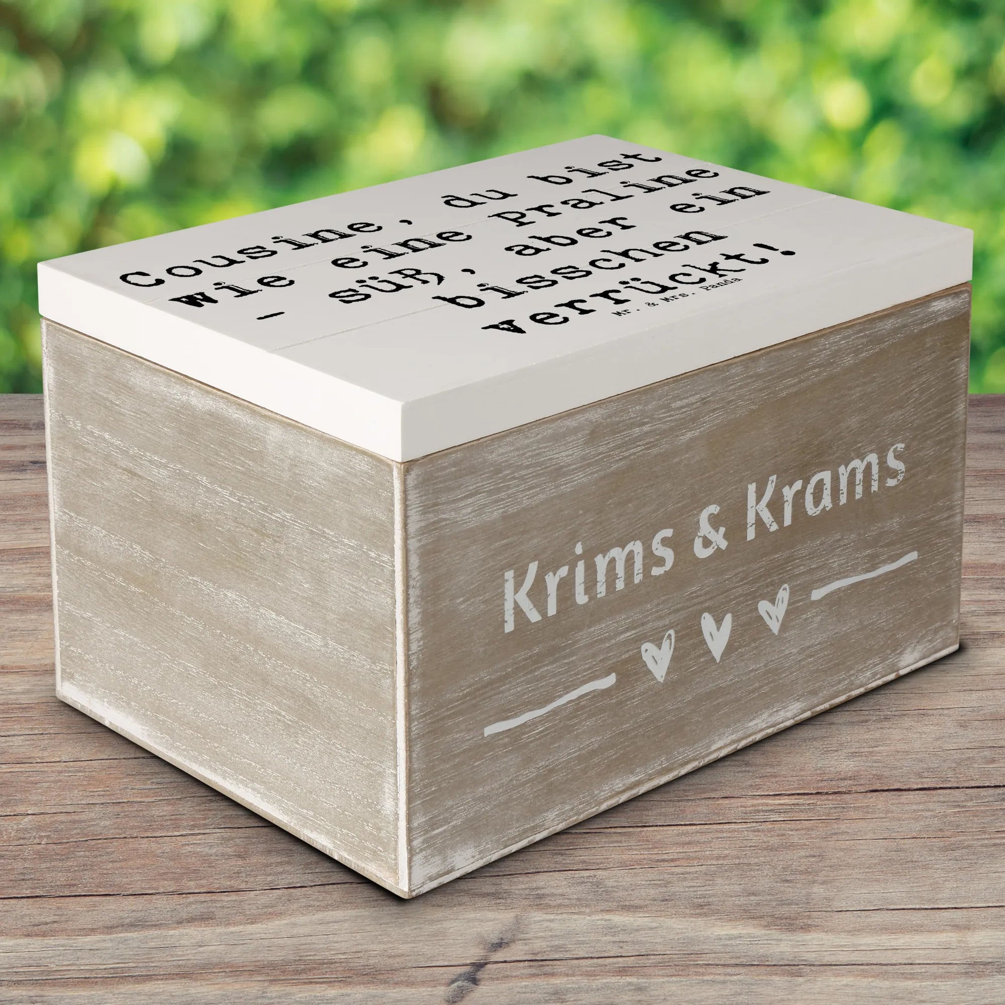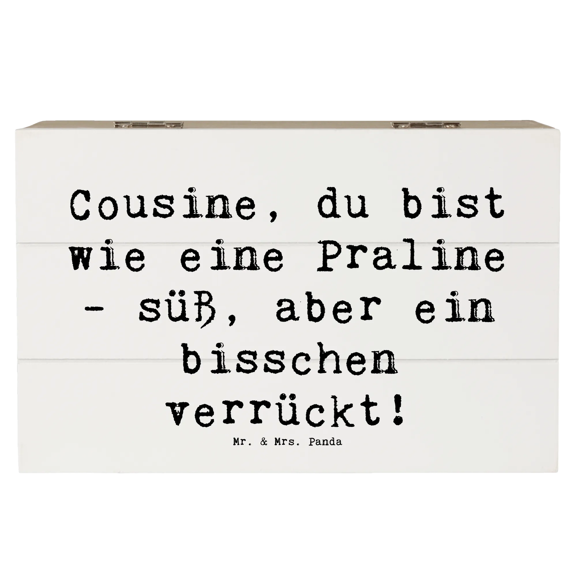 Die wunderschöne Holzkiste von Mr. & Mrs. Panda ist das perfekte Geschenk für Deine liebste Cousine! Mit dem liebevollen Motiv und dem Spruch 'Cousine, du bist wie eine Praline - süß, aber ein bisschen verrückt!' bringt diese Kiste nicht nur einen Hauch von Humor in Eure Beziehung, sondern ist auch ein wunderschöner Aufbewahrungsort für die kostbarsten Erinnerungen.