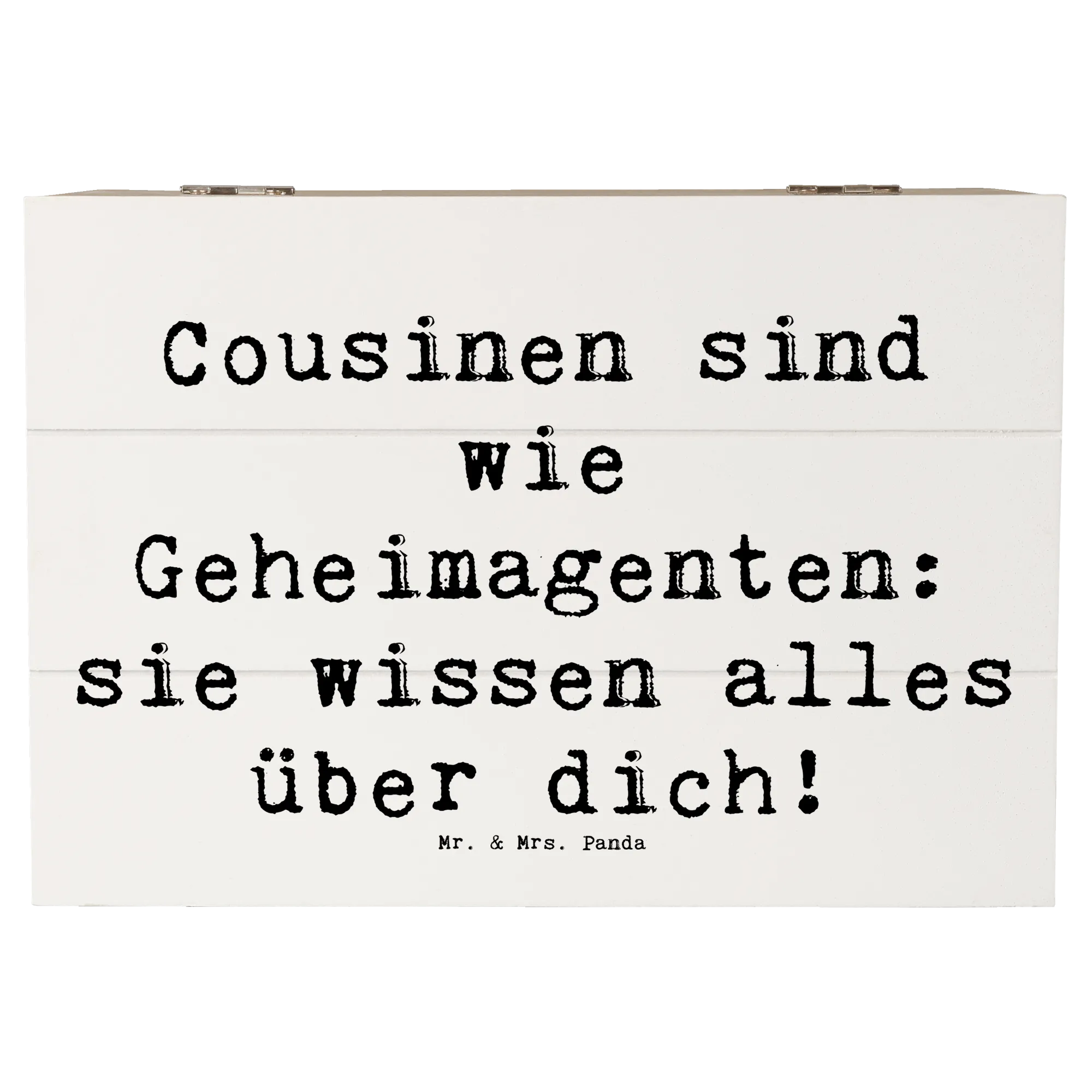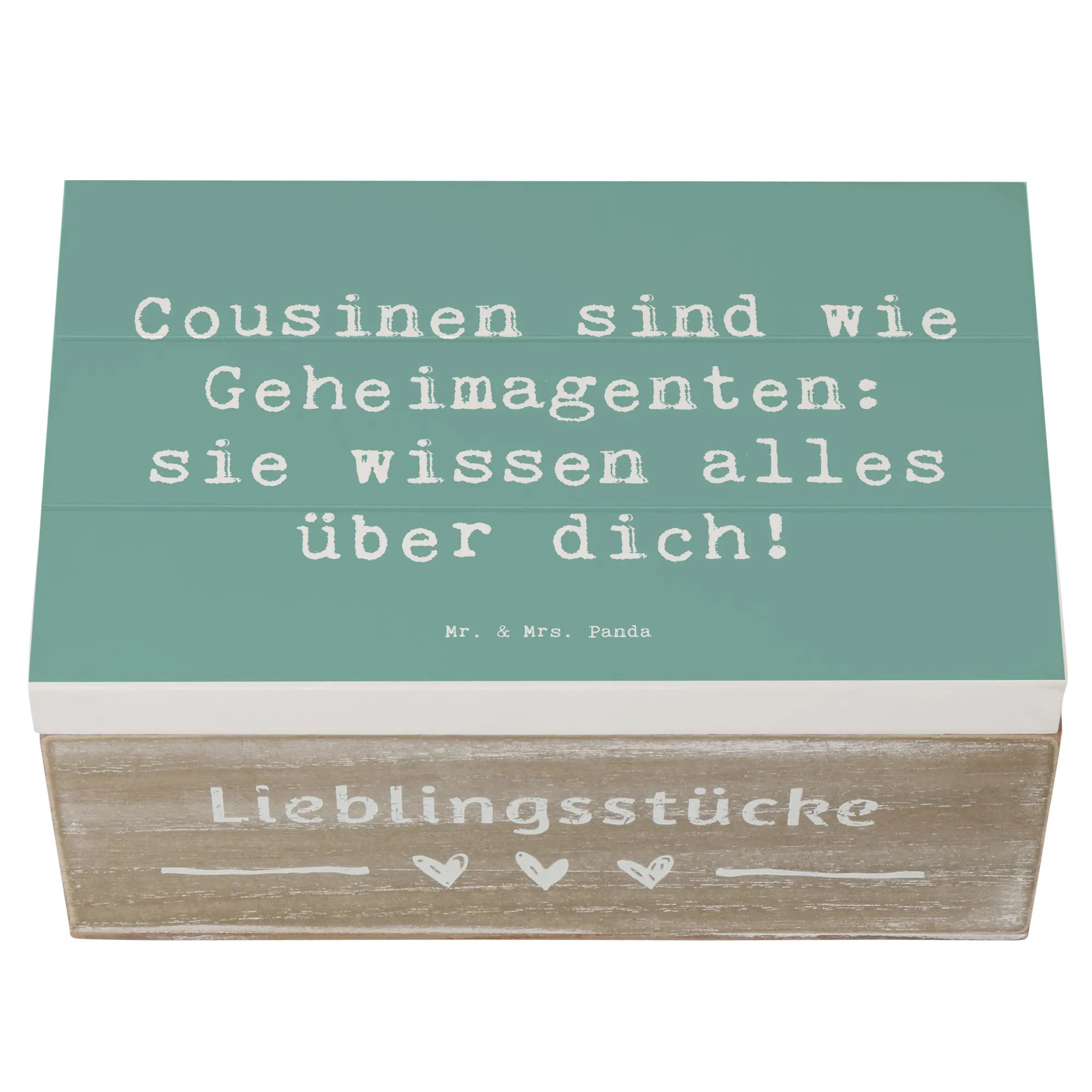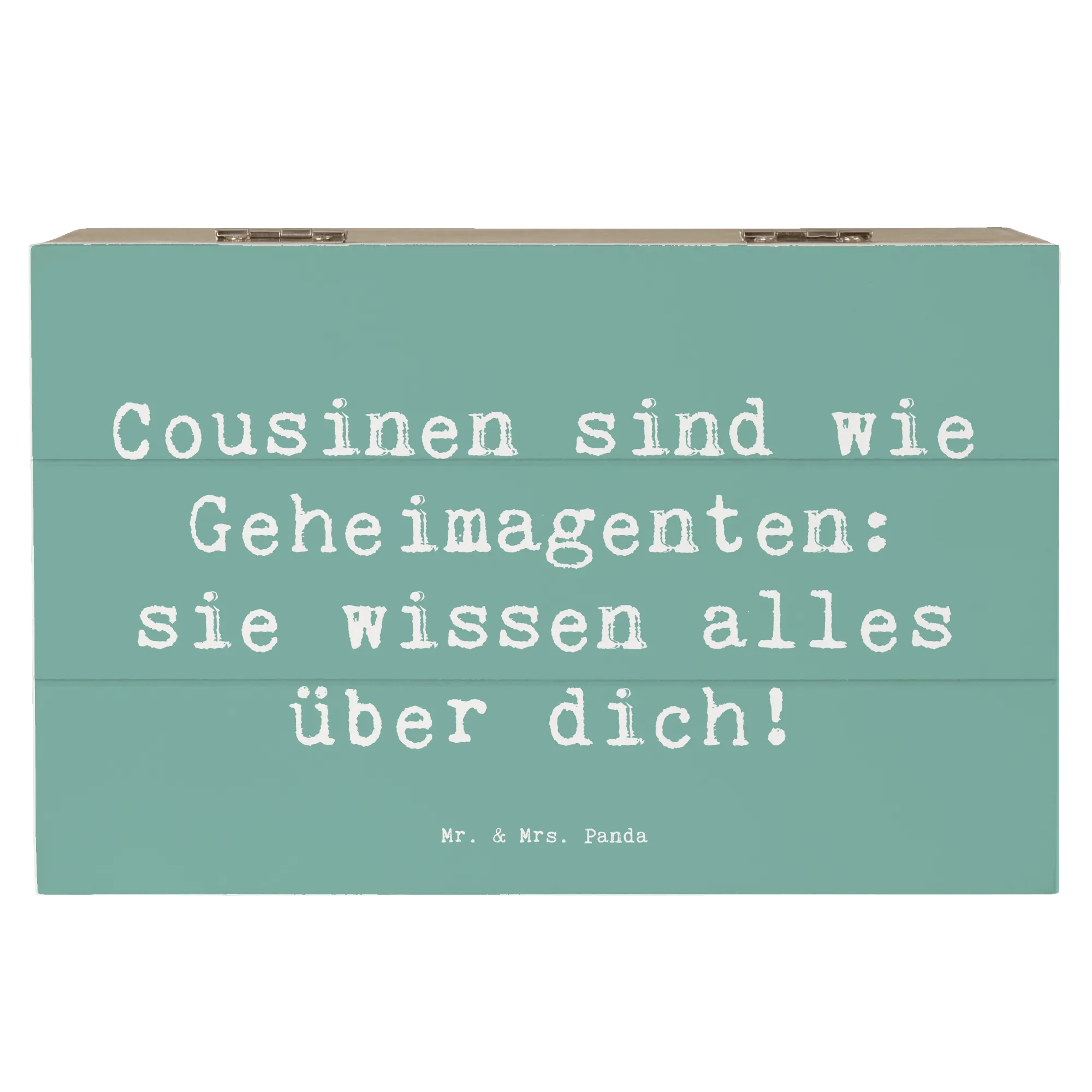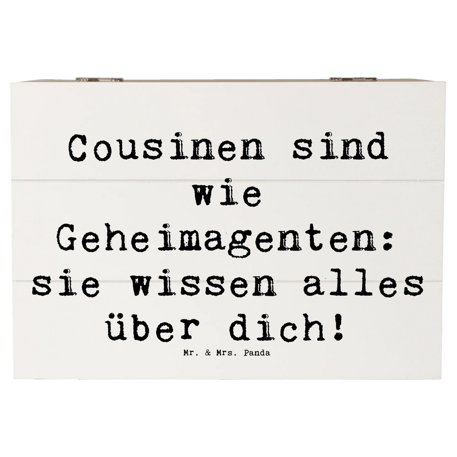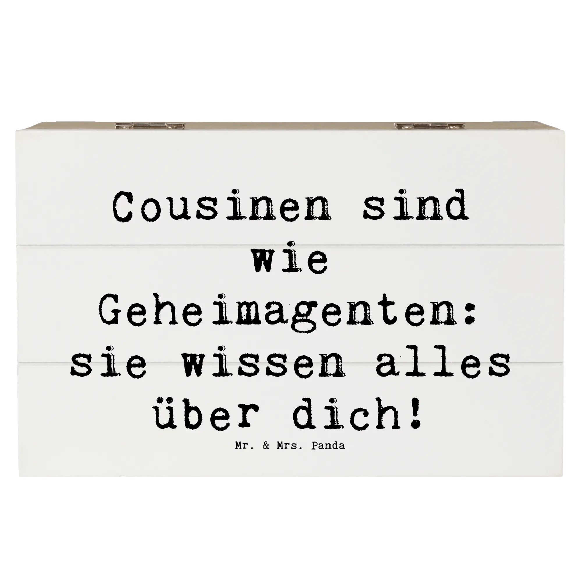 Die Holzkiste von Mr. & Mrs. Panda mit dem Spruch "Cousinen sind wie Geheimagenten: sie wissen alles über dich!" ist das perfekte Geschenk für deine Lieblingscousine oder deinen Lieblingscousin!