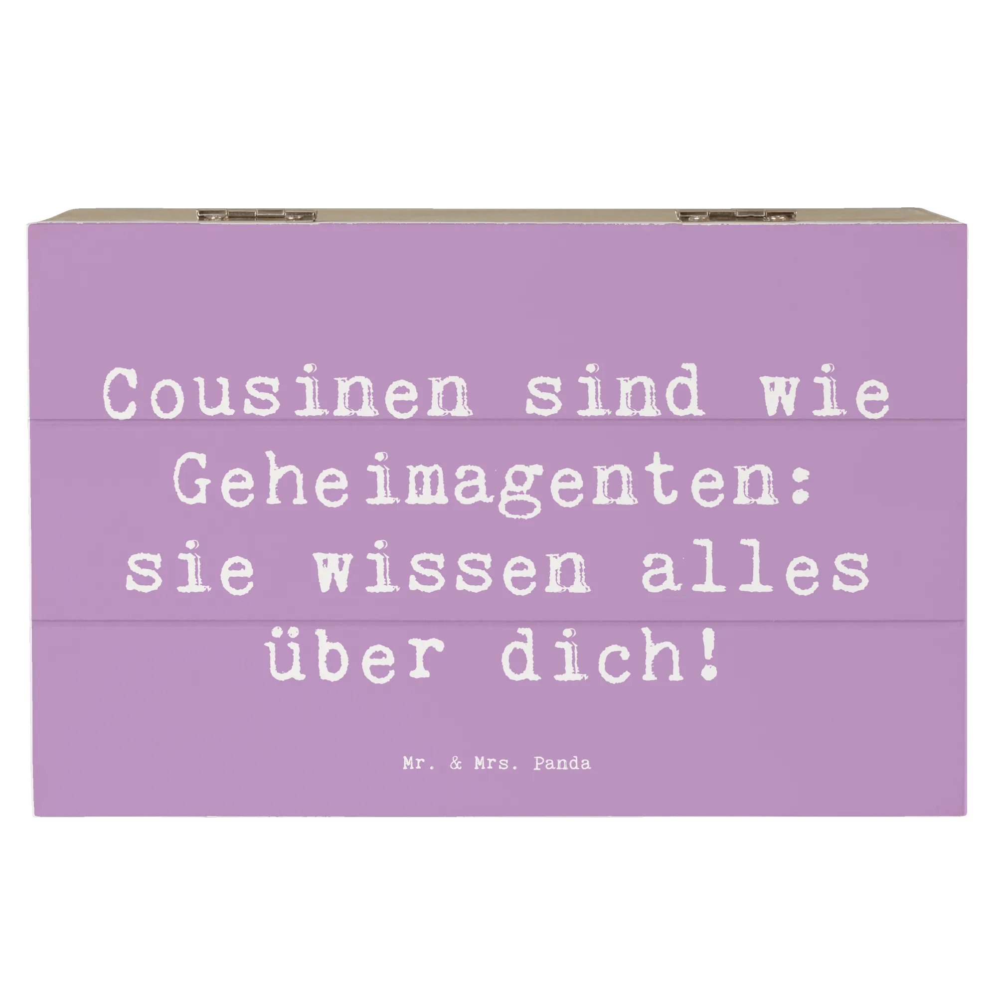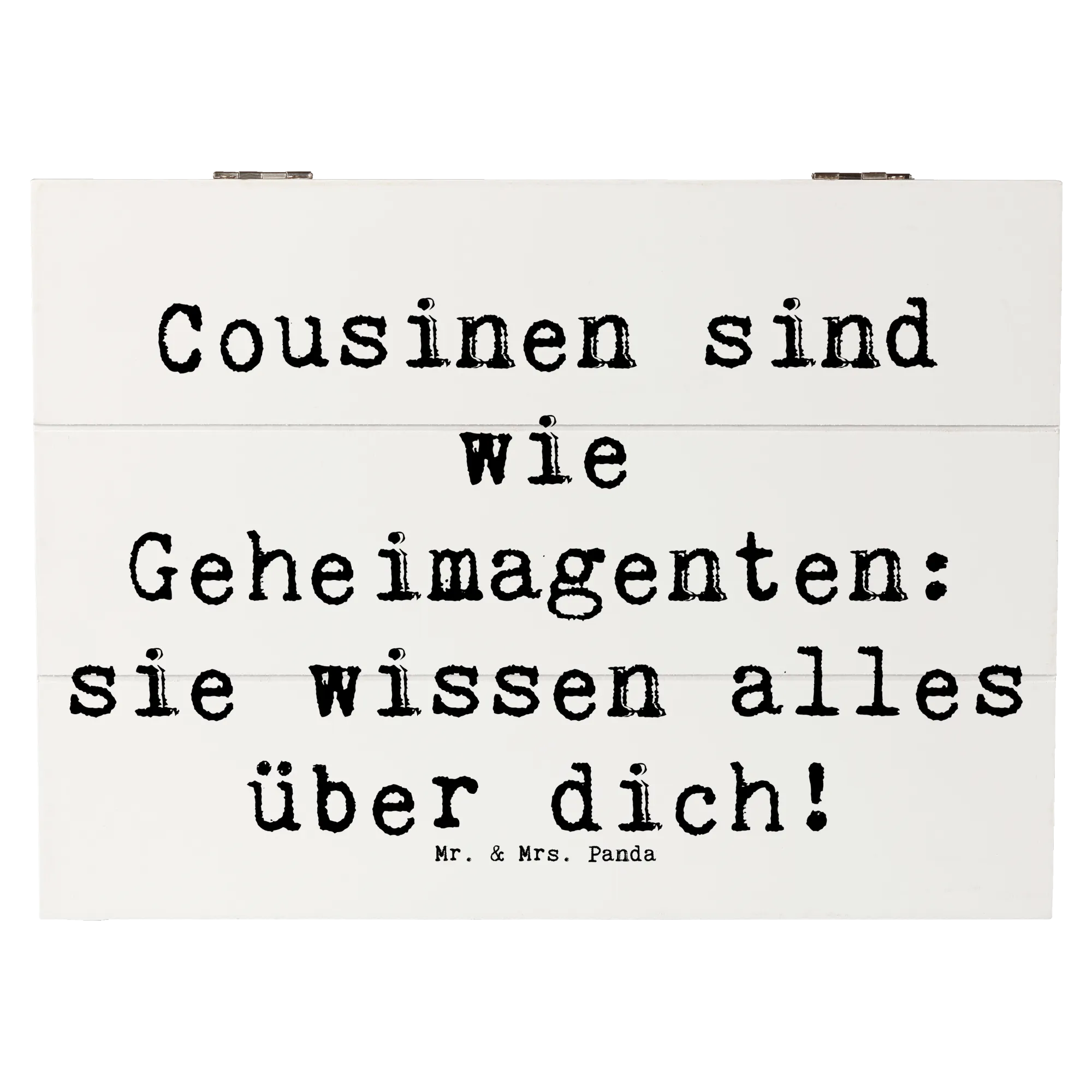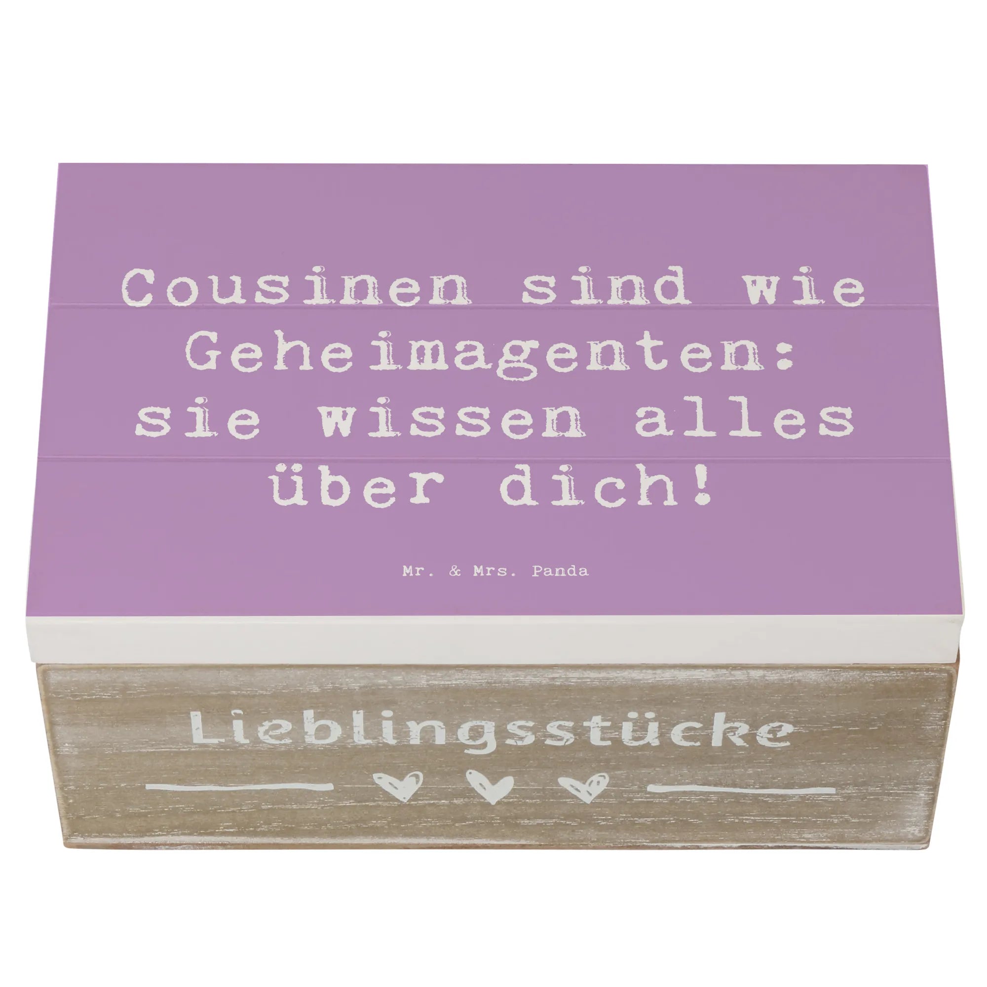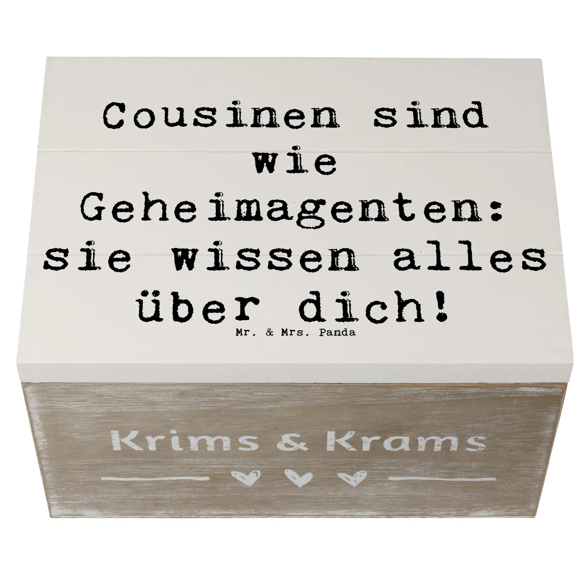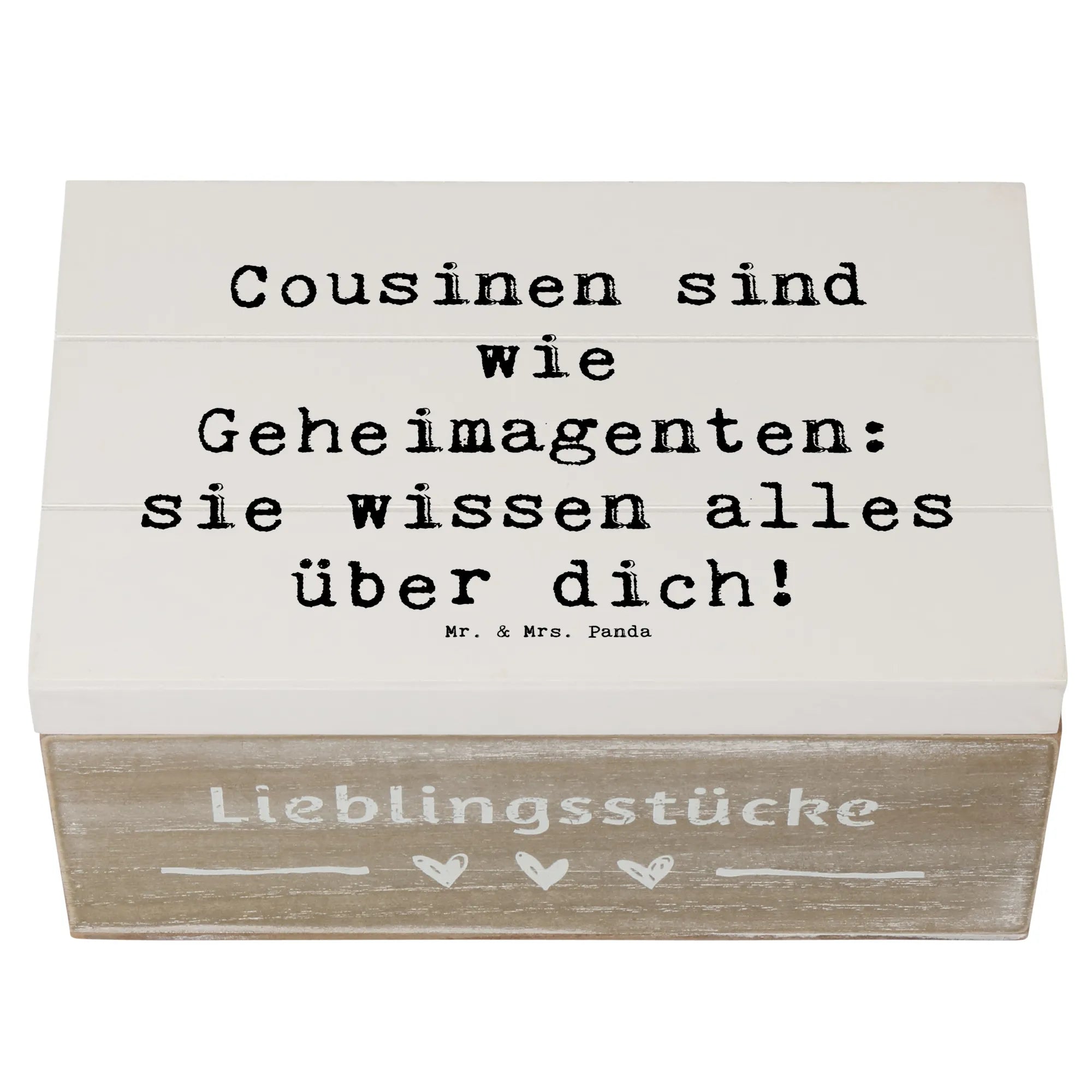 Die Holzkiste von Mr. & Mrs. Panda mit dem Spruch "Cousinen sind wie Geheimagenten: sie wissen alles über dich!" ist das perfekte Geschenk für deine Lieblingscousine oder deinen Lieblingscousin!