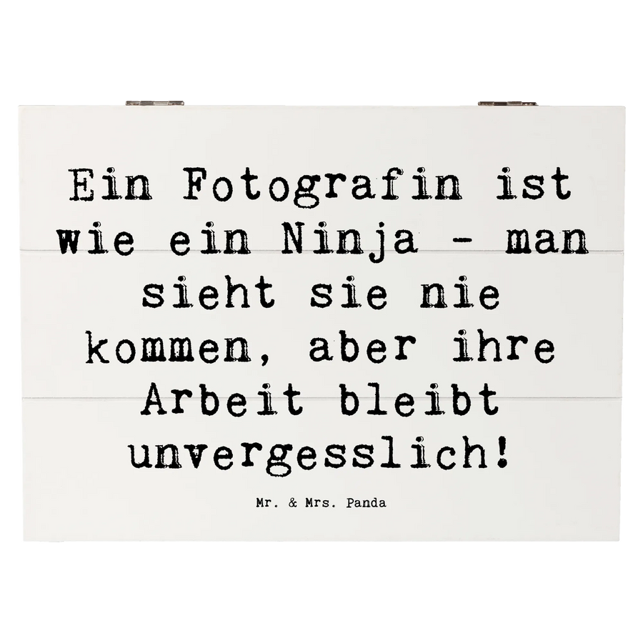 Du suchst nach dem perfekten Geschenk für eine Fotografin? Unsere wunderschöne Holzkiste von Mr. & Mrs. Panda, bedruckt mit dem charmanten Spruch "Ein Fotografin ist wie ein Ninja - man sieht sie nie kommen, aber ihre Arbeit bleibt unvergesslich!", ist die ideale Wahl!