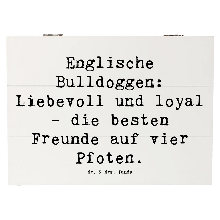 Der charmante Spruch "Englische Bulldoggen: Liebevoll und loyal - die besten Freunde auf vier Pfoten." ziert die Kiste und gibt ihr eine persönliche Note. Sie ist nicht abschließbar, lässt sich aber dank der besonderen Einschlagscharniere leicht öffnen und schließen.