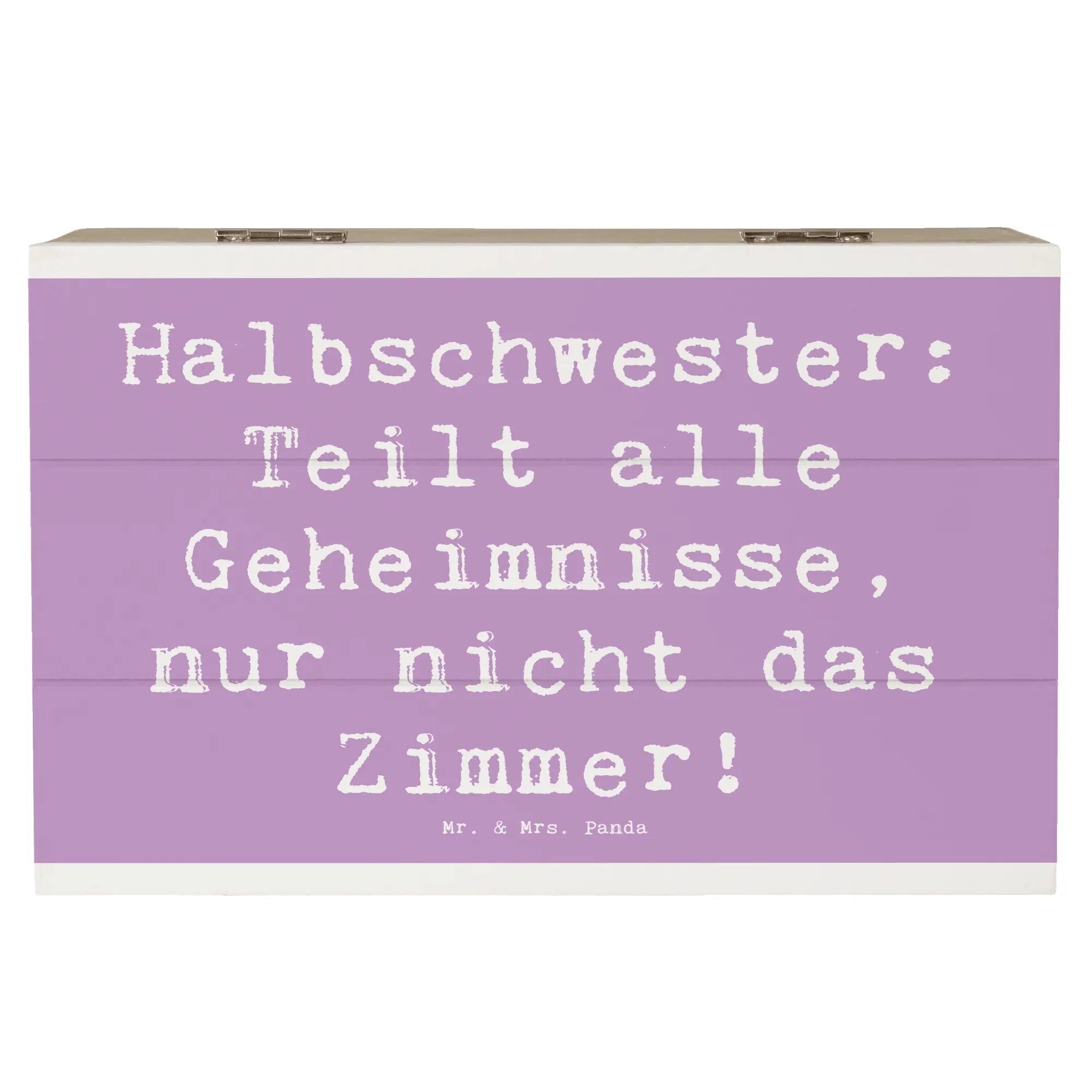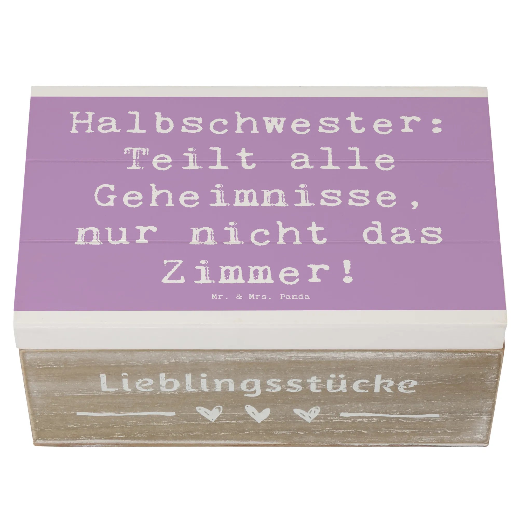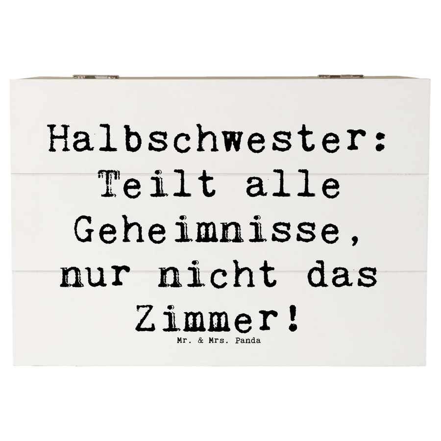 Die Holzkiste "Halbschwester" von Mr. & Mrs. Panda ist das ideale Geschenk für alle, die eine besondere Beziehung zu ihrer Halbschwester pflegen. Diese wunderschöne Kiste ist aus robuster Premium Hartfaser gefertigt und bietet nicht nur einen stilvollen Aufbewahrungsort für Erinnerungen wie Fotos, Briefe oder kleine Schätze, sondern ist auch ein toller Hingucker in jedem Raum. Mit den Maßen 180 mm x 250 mm x 150 mm bietet sie genügend Platz für all die kostbaren Dinge, die Du mit Deiner Halbschwester teilst. Der liebevolle Spruch „Halbschwester: Teilt alle Geheimnisse, nur nicht das Zimmer!“ bringt zum Lachen und sorgt gleichzeitig für ein Gefühl der Verbundenheit.