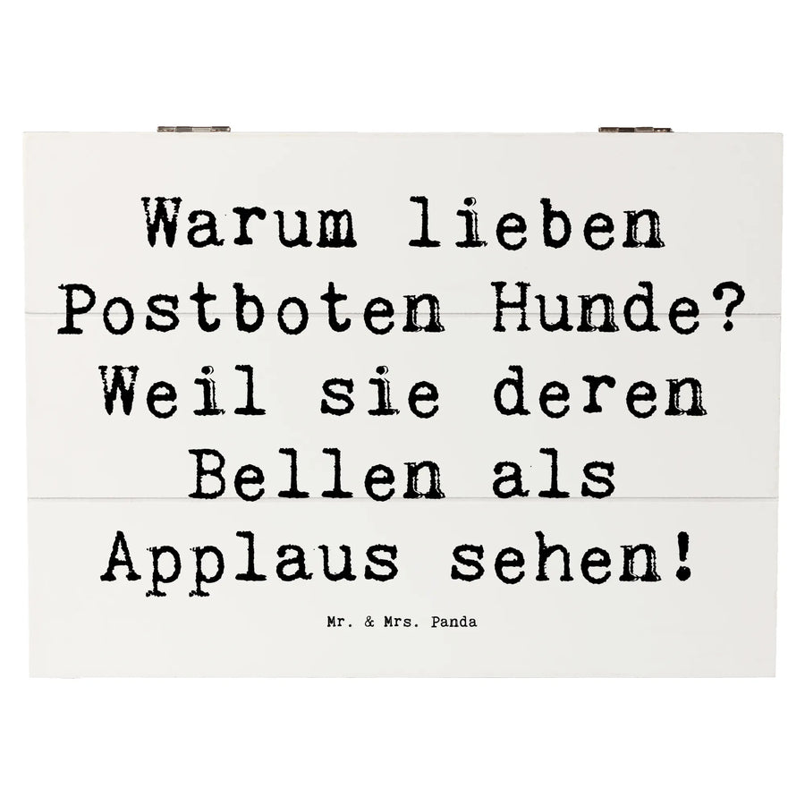 Die wunderschöne Holzkiste von Mr. & Mrs. Panda ist der perfekte Aufbewahrungsort für all Deine Schätze! Ob Fotos, Erinnerungen oder kleine persönliche Dinge – diese einzigartige Erinnerungskiste bringt Ordnung in Dein Leben und wirkt dabei einfach zauberhaft. Mit dem liebevollen Motiv "Postbote" und dem spritzigen Spruch "Warum lieben Postboten Hunde? Weil sie deren Bellen als Applaus sehen!" wird diese Kiste garantiert zum Hingucker in jedem Raum.