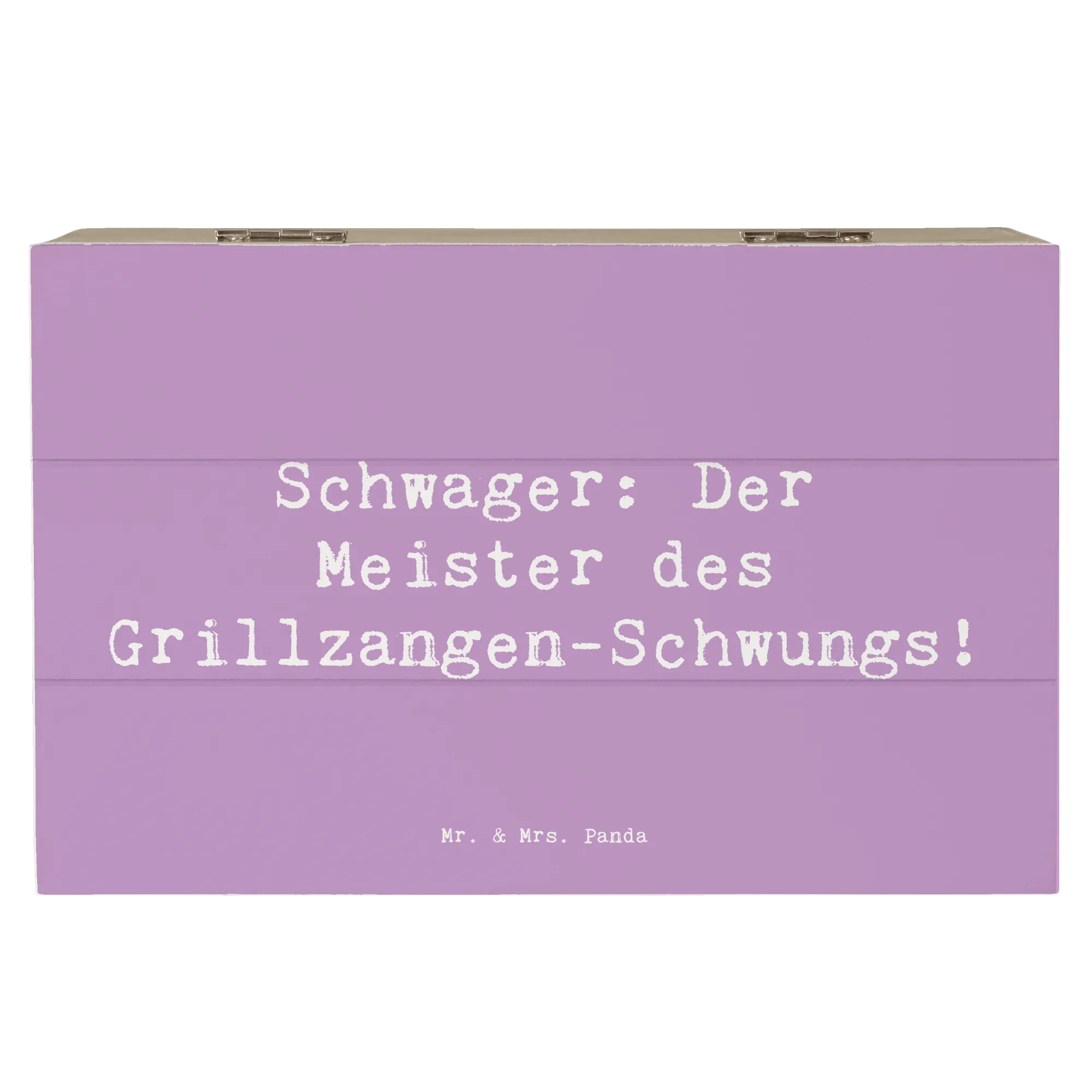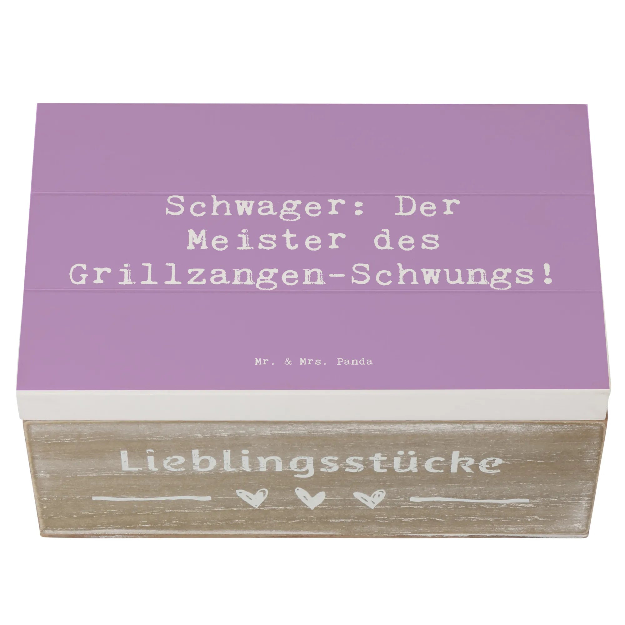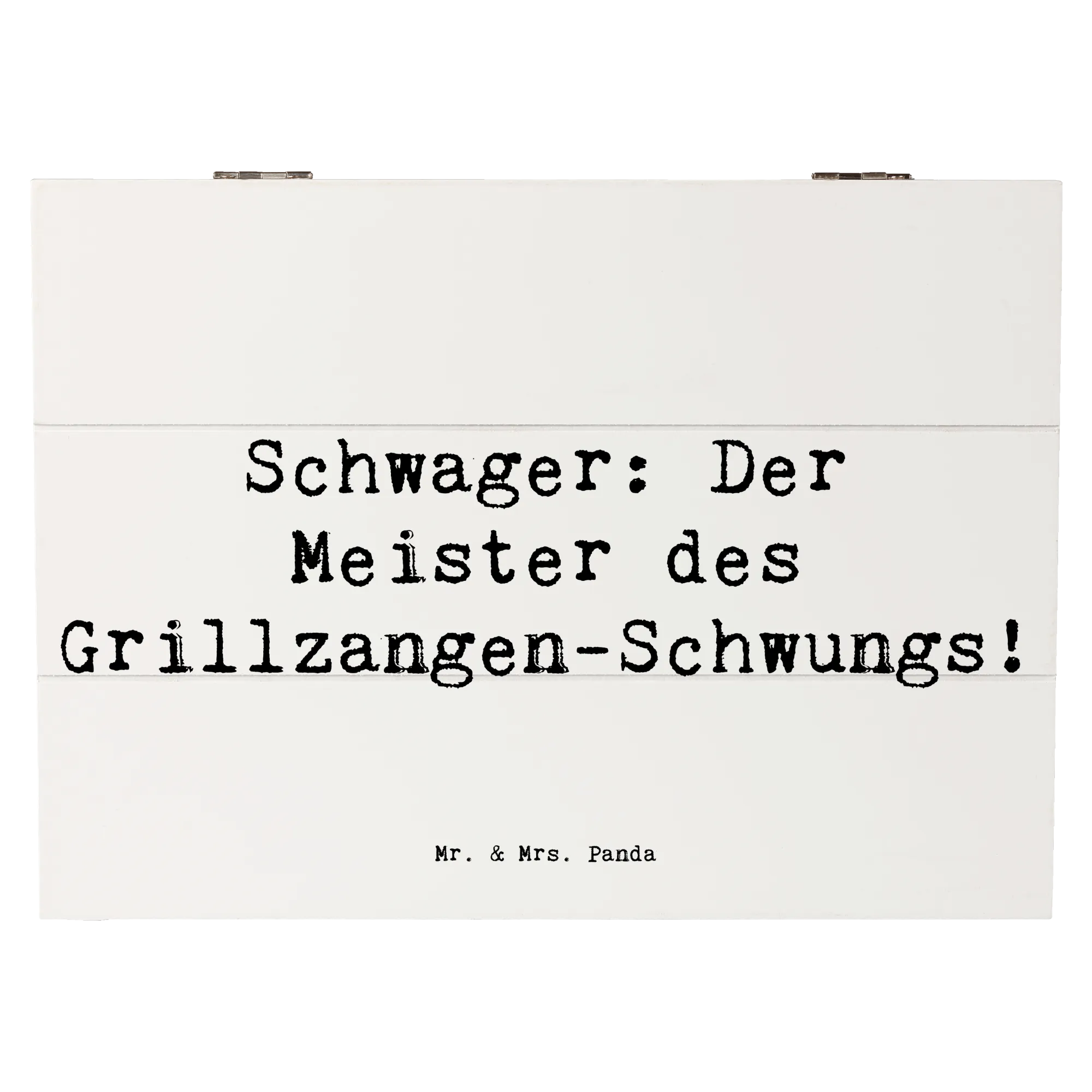 Die Holzkiste "Schwager" von Mr. & Mrs. Panda ist das perfekte Geschenk für alle, die ihren Schwager wertschätzen. Mit einem liebevoll gestalteten Motiv und dem witzigen Spruch "Schwager: Der Meister des Grillzangen-Schwungs!" wird diese Kiste zum echten Hingucker.