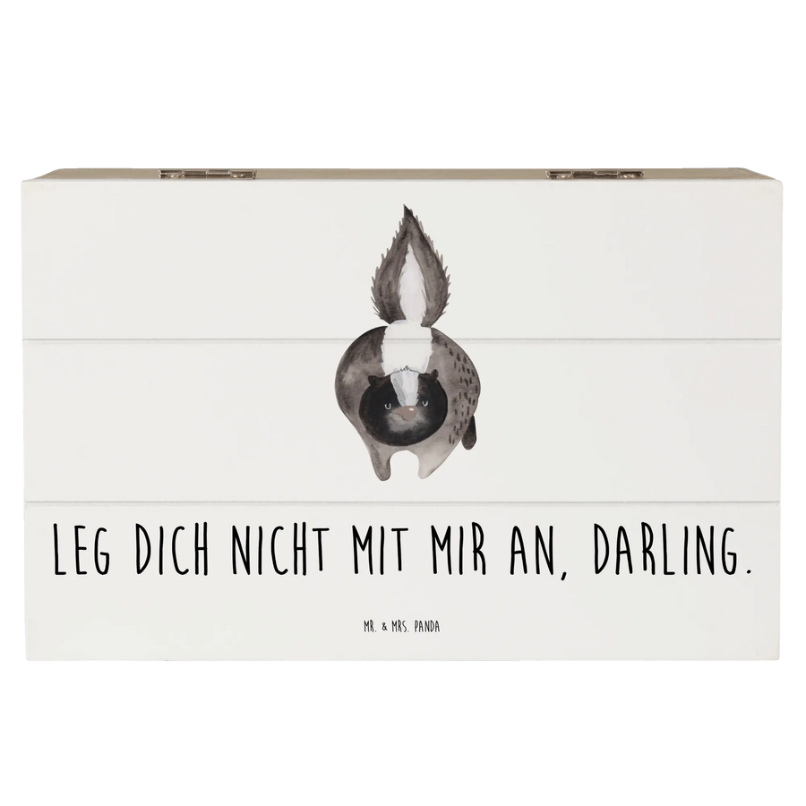 Das süße Stinktier mit dem drohenden Blick und dem aufgestellten Schwanz wird mit dem lustigen Spruch "Leg dich nicht mit mir an, Darling" zu einem echten Hingucker in jedem Raum. Diese Holzkiste wird aus robuster Holzfaser hergestellt, die nicht nur langlebig, sondern auch wasserabweisend ist. Die spezielle Aquarell-Gestaltung von Mrs. Panda verleiht der Kiste einen einzigartigen Charme und macht sie zu einem ganz besonderen Geschenk.