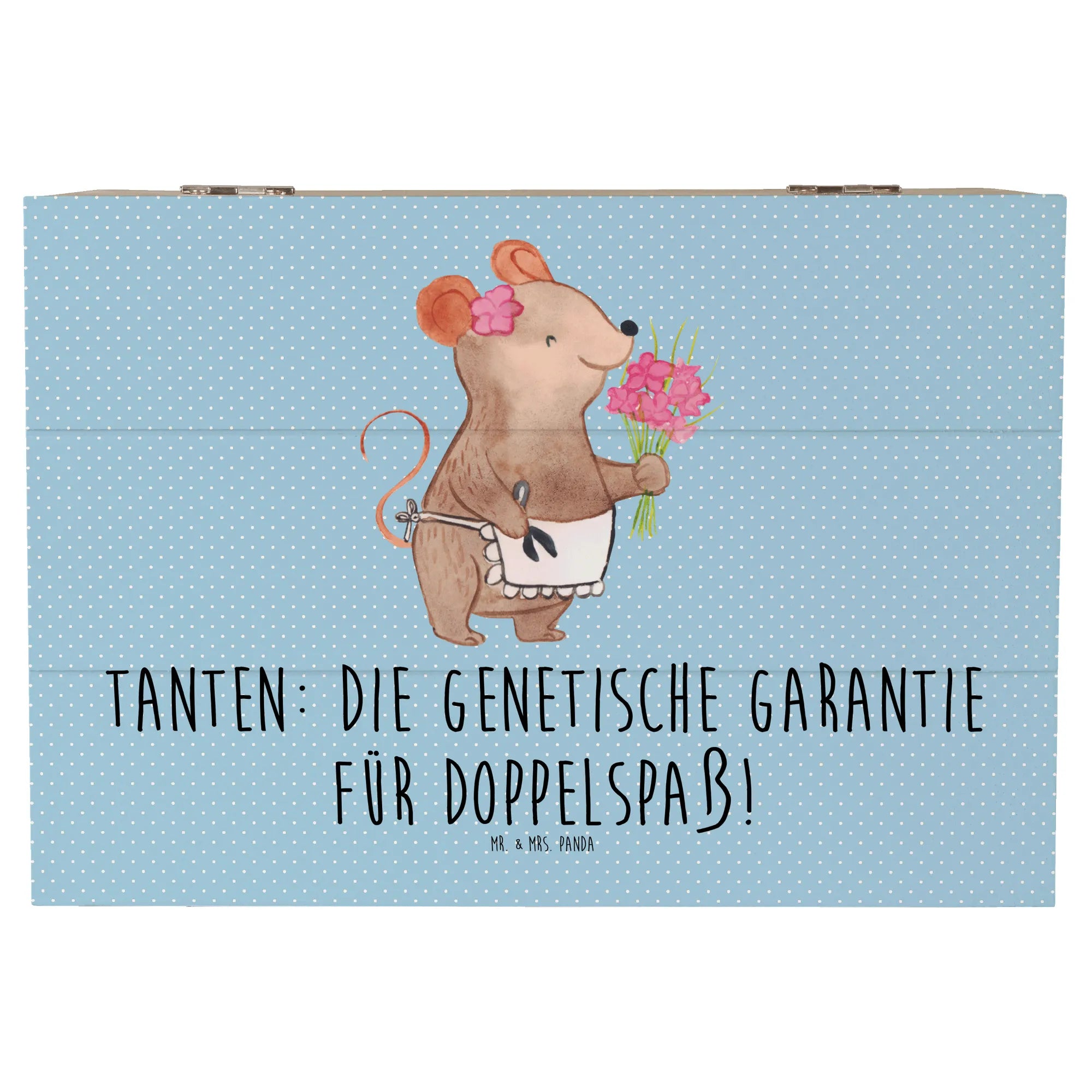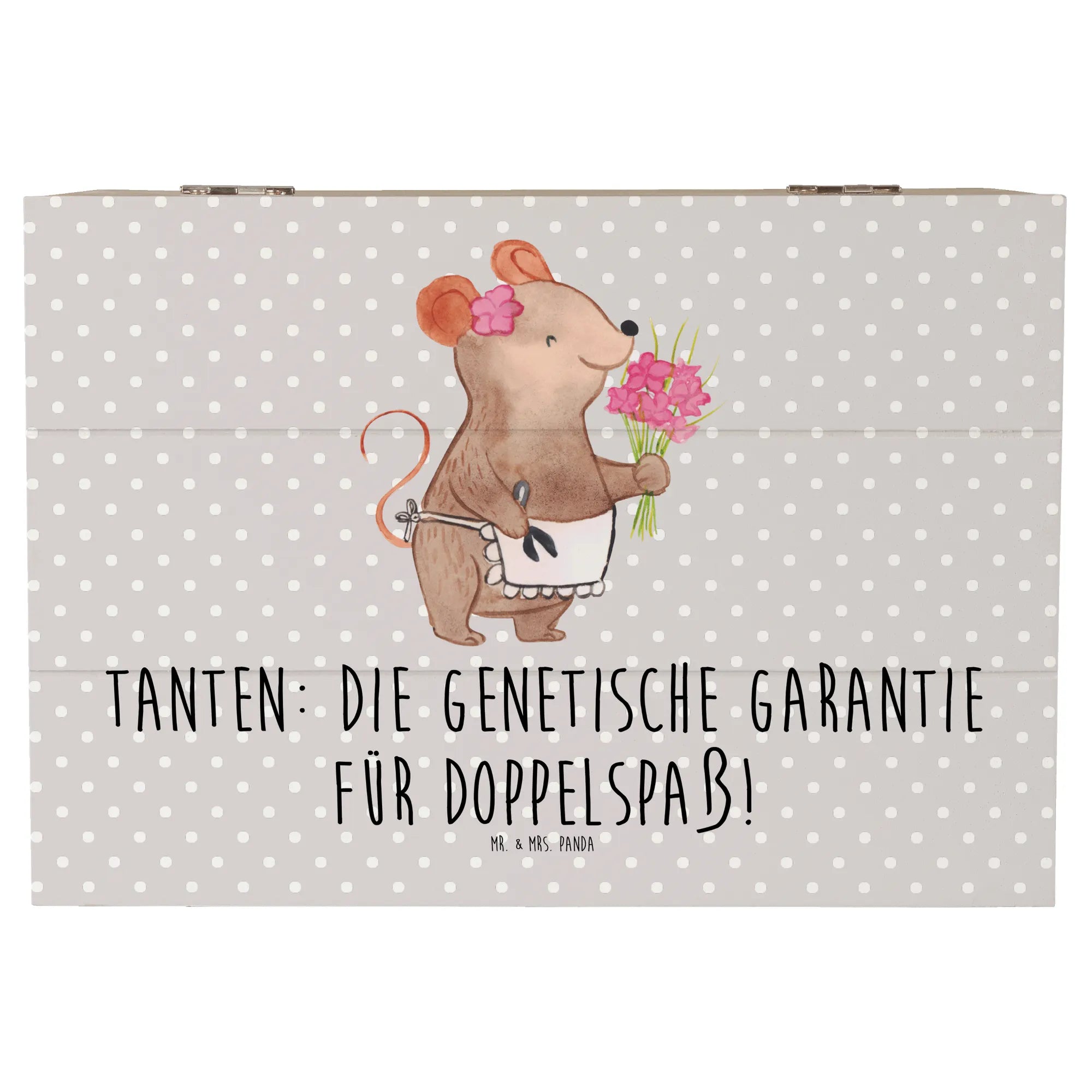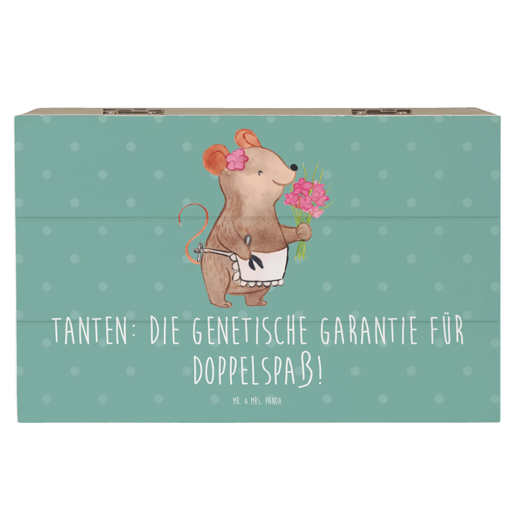 Entdecke die wunderschöne Holzkiste von Mr. & Mrs. Panda, die perfekt für jede Tante ist! Diese einzigartige Schatzkiste, bedruckt mit dem charmanten Spruch "Tanten: Die genetische Garantie für Doppelspaß!", ist der ideale Ort, um all die besonderen Erinnerungen und Schätze zu bewahren, die Du mit Deiner Tante geteilt hast.