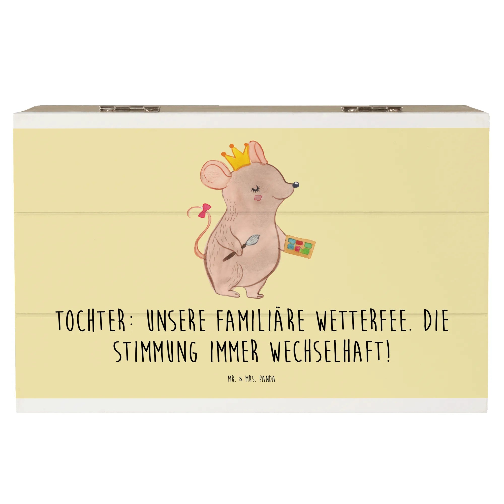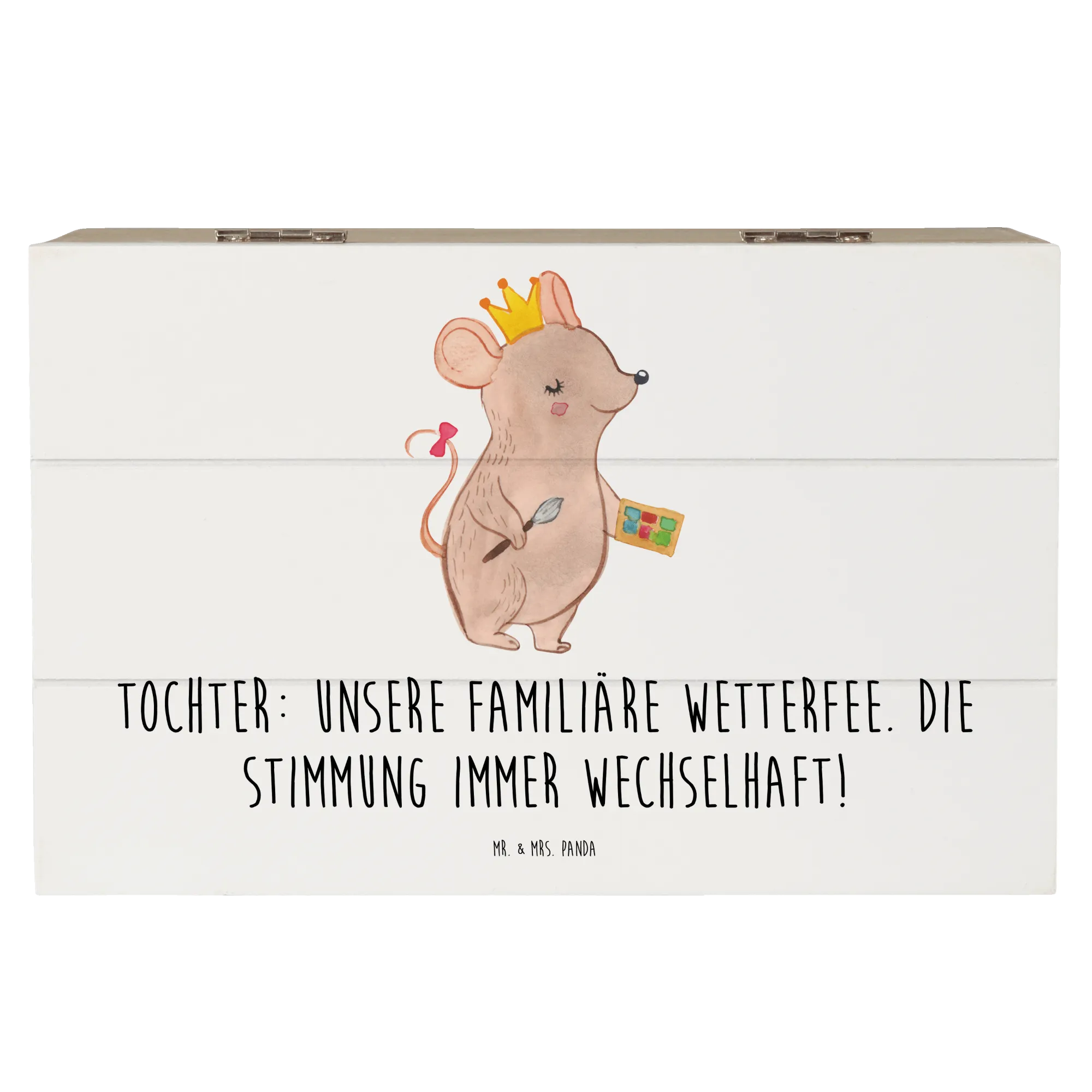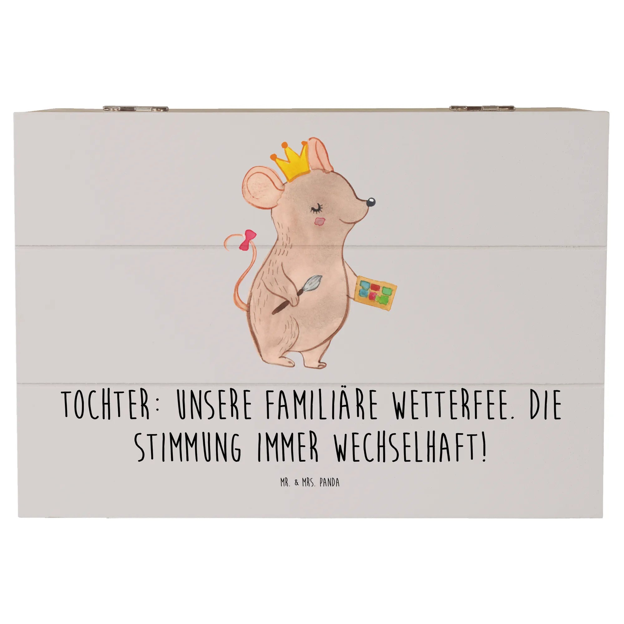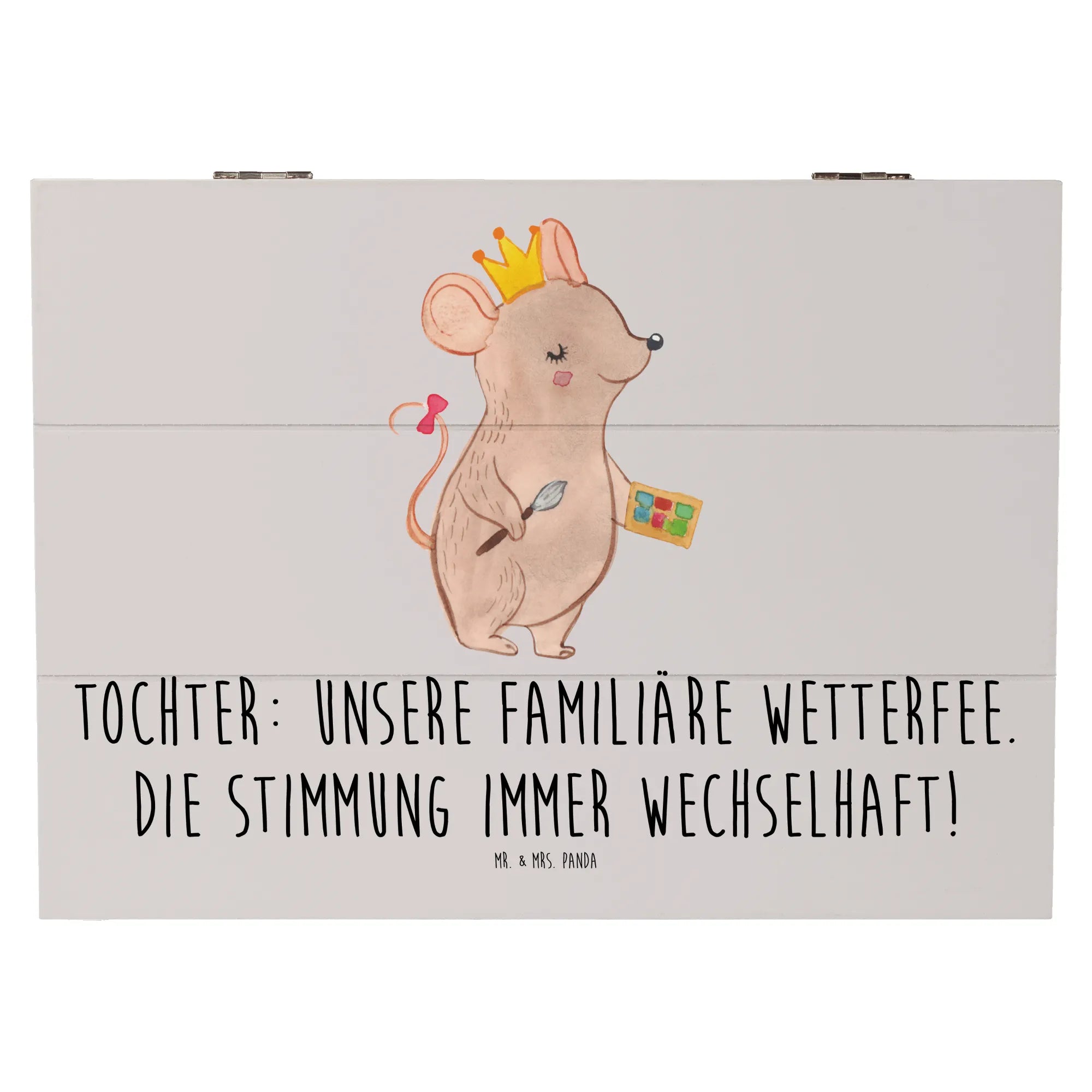 Diese wunderschöne Holzkiste von Mr. & Mrs. Panda ist das perfekte Geschenk für Deine Tochter! Mit dem liebevoll gestalteten Motiv, das mit dem Spruch "Unsere familiäre Wetterfee. Die Stimmung immer wechselhaft!" verziert ist, bringt diese Kiste nicht nur Freude, sondern auch einen Hauch von Persönlichkeit in jedes Kinderzimmer.