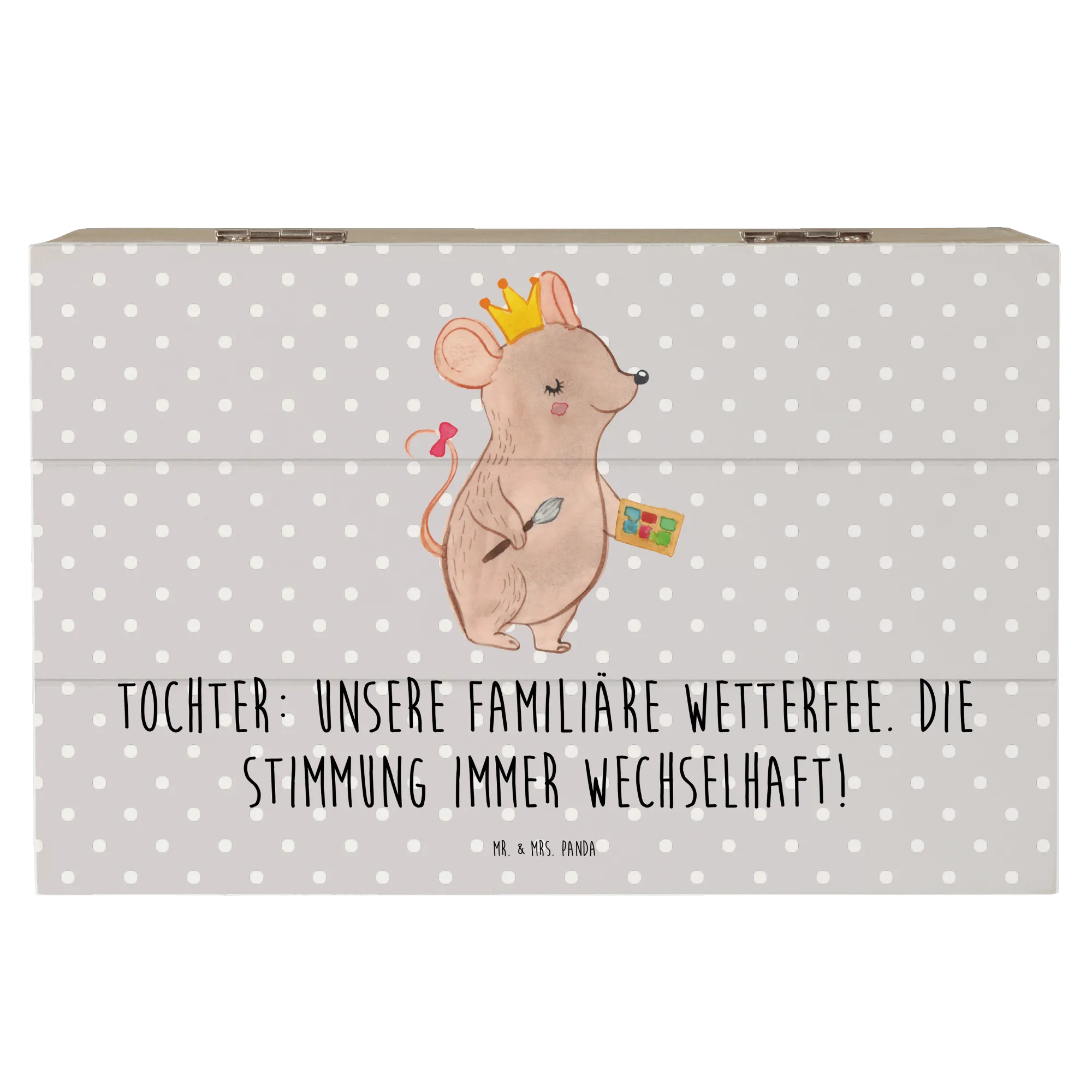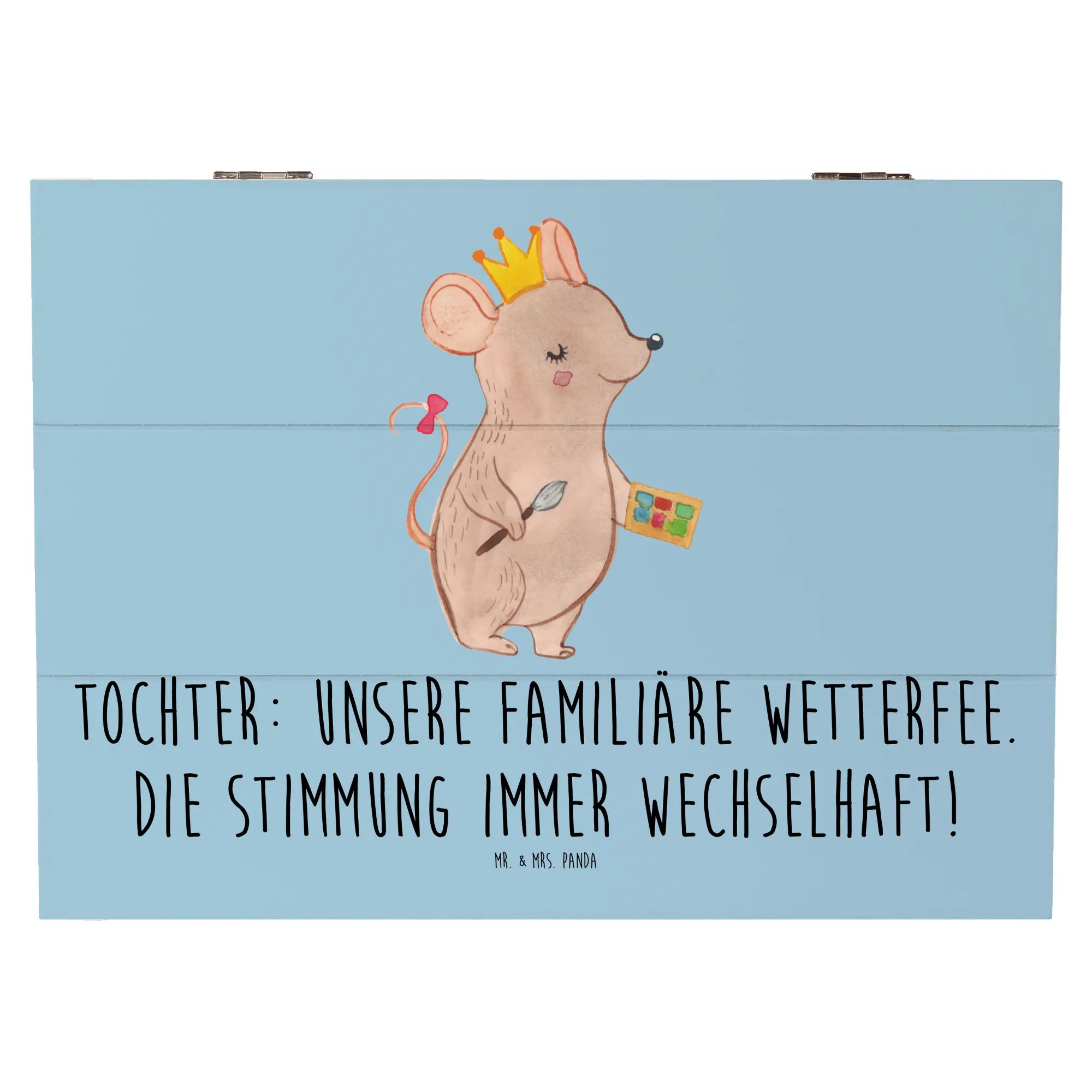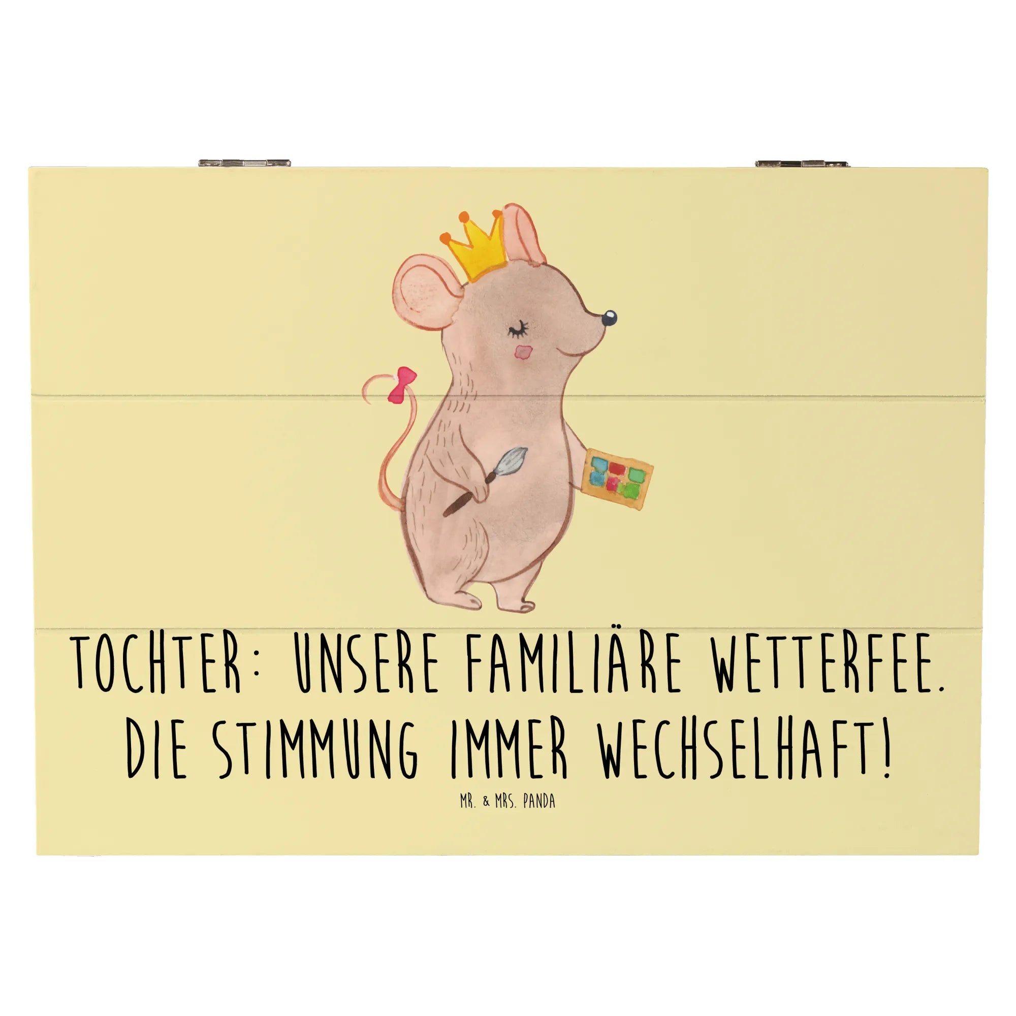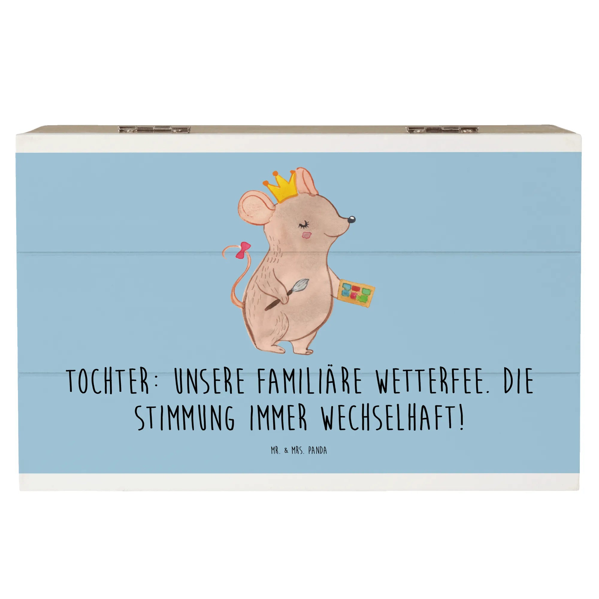 Diese wunderschöne Holzkiste von Mr. & Mrs. Panda ist das perfekte Geschenk für Deine Tochter! Mit dem liebevoll gestalteten Motiv, das mit dem Spruch "Unsere familiäre Wetterfee. Die Stimmung immer wechselhaft!" verziert ist, bringt diese Kiste nicht nur Freude, sondern auch einen Hauch von Persönlichkeit in jedes Kinderzimmer.