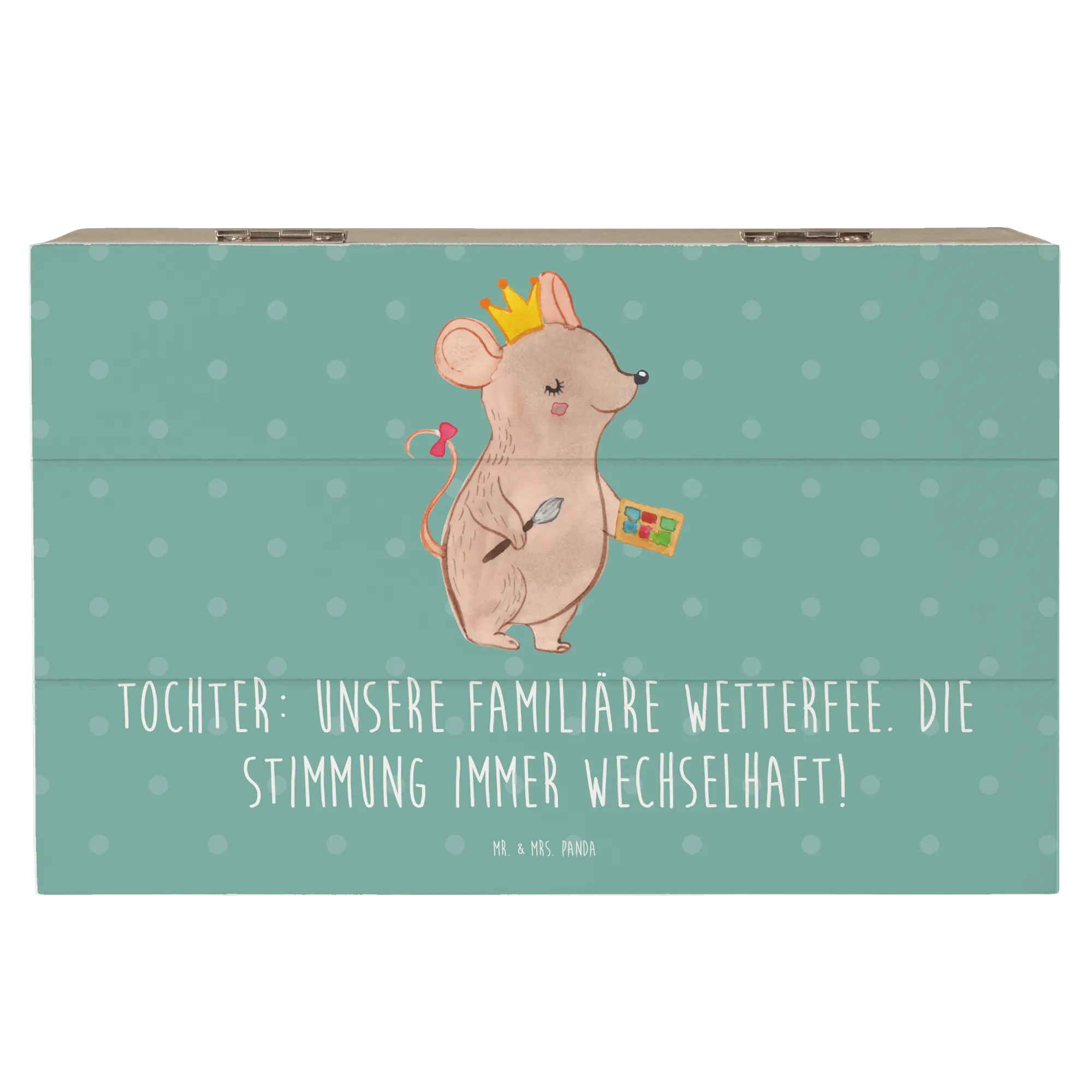 Die wundervolle Holzkiste von Mr. & Mrs. Panda ist das perfekte Geschenk für Deine Tochter! Diese bezaubernde Kiste ist nicht nur ein praktischer Aufbewahrungsort für all ihre wertvollen Schätze, sondern auch ein liebevolles Erinnerungsstück, das sie ein Leben lang begleiten wird. Mit einem fröhlichen Motiv, das mit dem Text 'Tochter: Unsere familiäre Wetterfee. Die Stimmung immer wechselhaft!' bedruckt ist, bringt sie garantiert ein Lächeln in jedes Gesicht.