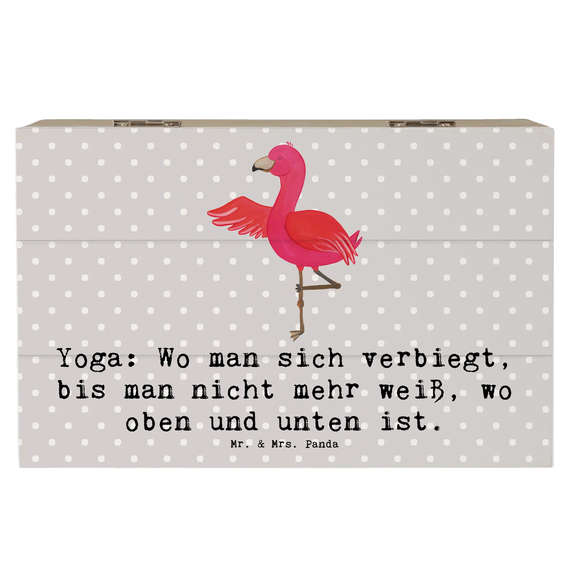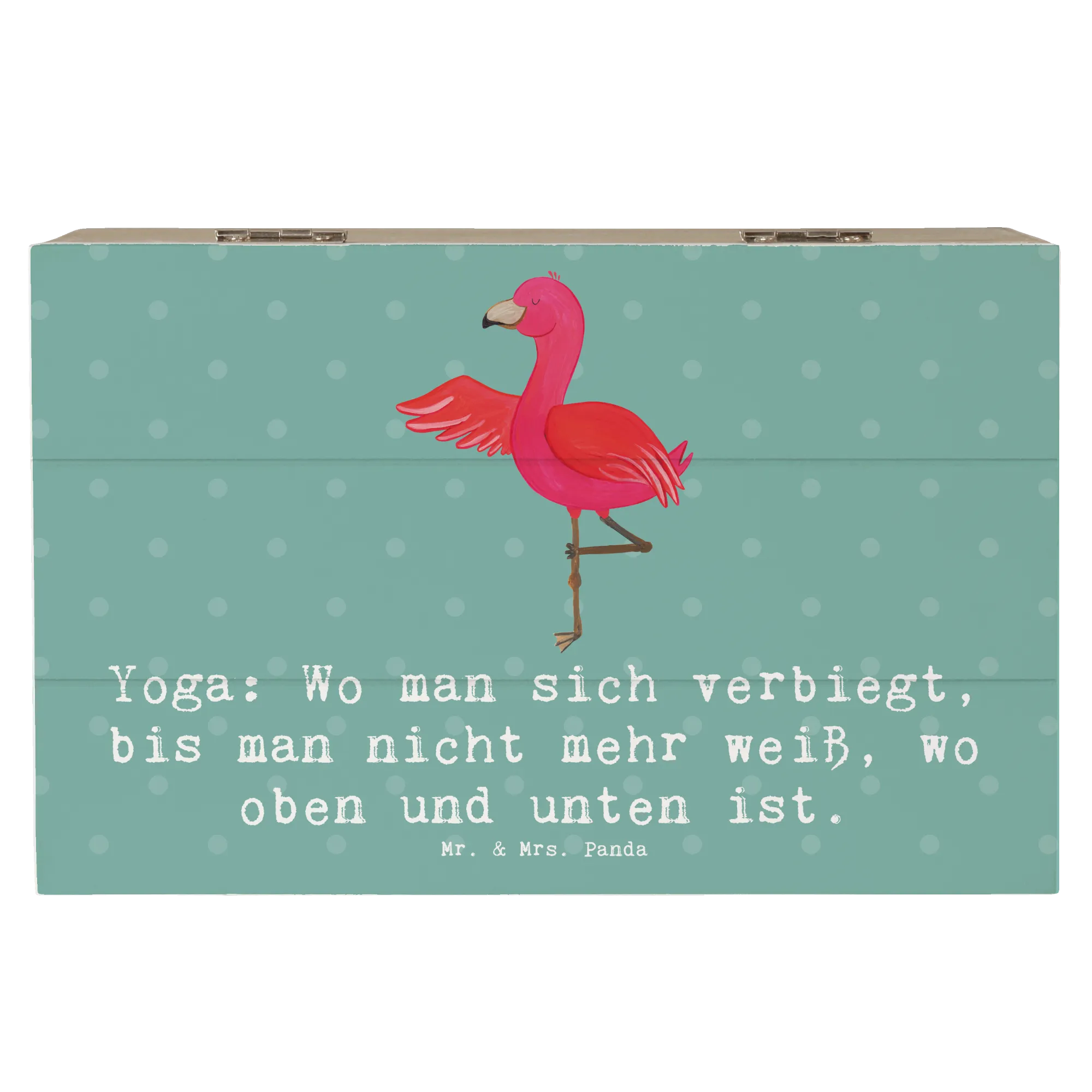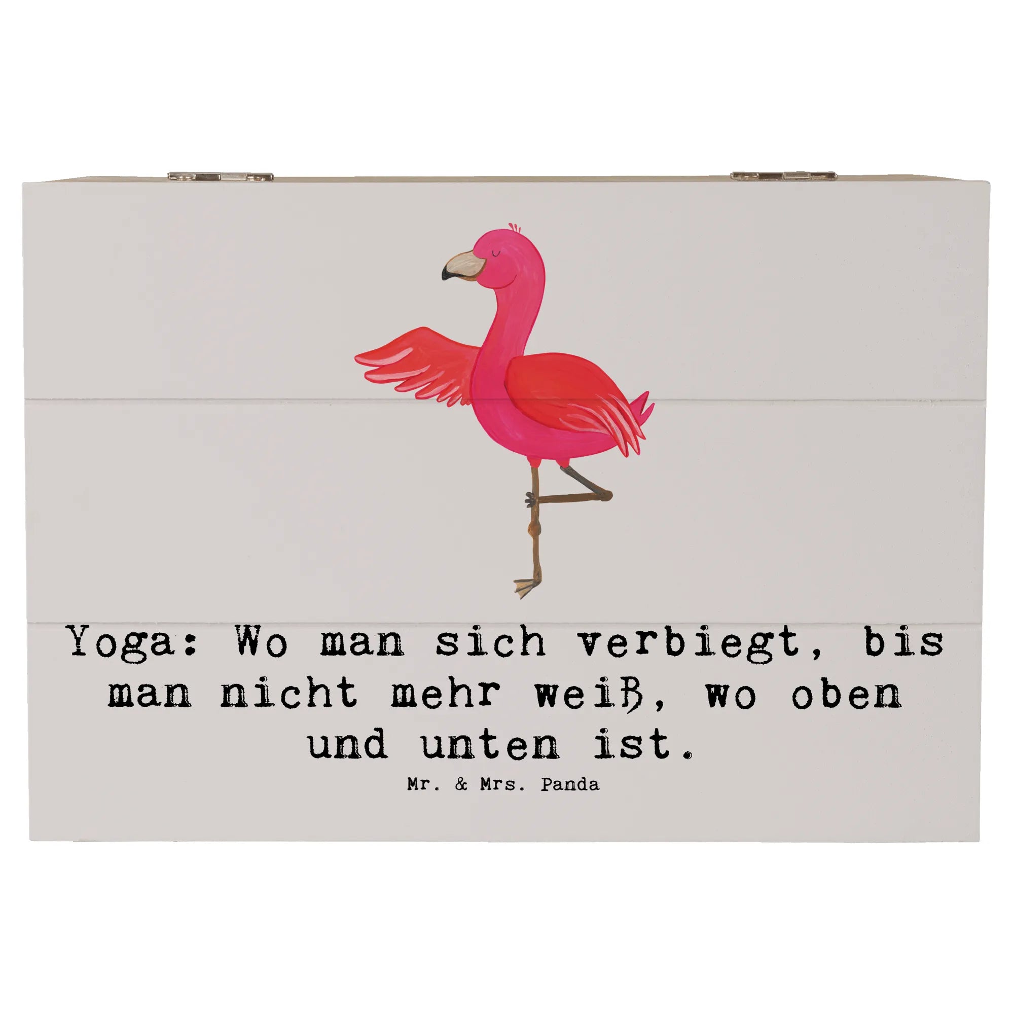 Das einzigartige Design mit dem fröhlichen Yoga-Motiv bringt Freude und Inspiration in jeden Raum. Schaffe dir Platz für all die schönen Erinnerungen an deine sportlichen Erlebnisse und besonderen Momente im Leben. Die Holzkiste von Mr. & Mrs. Panda kann auch als Dekokiste aufgestellt werden – ideal, um deinem Zuhause einen persönlichen Touch zu verleihen.
