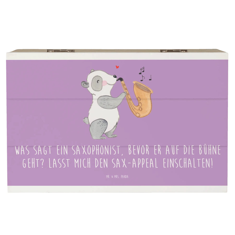 Entdecke die wunderbare Holzkiste von Mr. & Mrs. Panda, die das Herz eines jeden Musikliebhabers höher schlagen lässt. Mit einem stilvollen Saxophon-Motiv und dem humorvollen Slogan "Was sagt ein Saxophonist, bevor er auf die Bühne geht? Lasst mich den Sax-appeal einschalten!" versehen, ist diese Erinnerungskiste ein perfekter Begleiter für alle, die die Magie der Musik lieben.