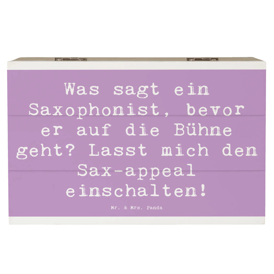 Die liebevoll gestaltete Kiste mit dem einzigartigen Saxophon-Motiv und dem spritzigen Spruch "Was sagt ein Saxophonist, bevor er auf die Bühne geht? Lasst mich den Sax-appeal einschalten!" bringt nicht nur Freude, sondern auch eine Portion Humor in dein Zuhause.