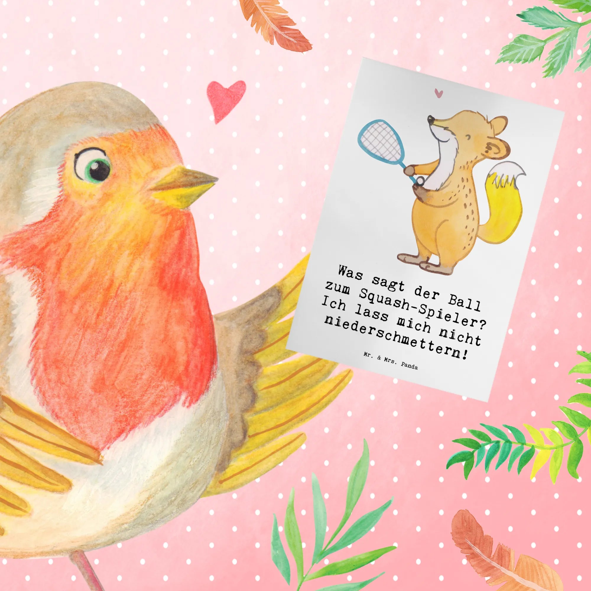 Die Grußkarte mit dem motivierenden Motiv Squash aus der Kollektion Sportarten von Mr. & Mrs. Panda ist das perfekte Geschenk für jeden Sportliebhaber und Squash-Fan! Mit dem humorvollen Spruch "Was sagt der Ball zum Squash-Spieler? Ich lass mich nicht niederschmettern!" bringt diese Karte ein Lächeln auf die Gesichter aller, die leidenschaftlich diesem aufregenden Sport nachgehen.