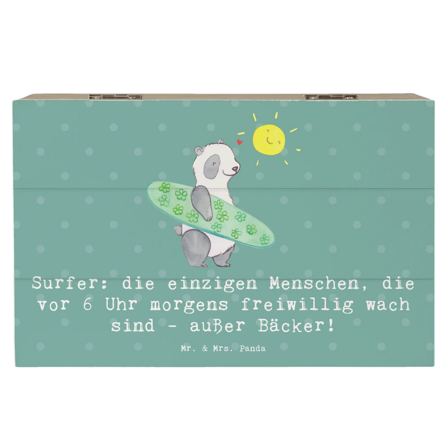 Du suchst nach dem perfekten Geschenk für einen Sportliebhaber oder Surf-Enthusiasten? Dann ist die Holzkiste von Mr. & Mrs. Panda genau das Richtige für dich! Mit dem motivierenden Spruch 'Surfer: die einzigen Menschen, die vor 6 Uhr morgens freiwillig wach sind - außer Bäcker!' ist diese Kiste ein absoluter Hingucker.