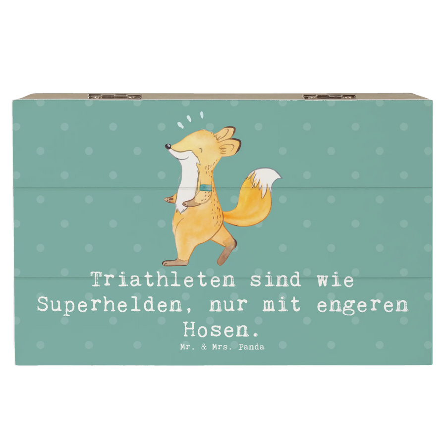 Unsere Holzkiste „Triathlon“ aus der liebevollen Sportarten-Kollektion von Mr. & Mrs. Panda ist mehr als nur eine Aufbewahrungsbox. Bedruckt mit dem humorvollen Spruch „Triathleten sind wie Superhelden, nur mit engeren Hosen.“ bringt sie jedes Sportlerherz zum Lächeln und wird zum treuen Begleiter im Alltag.