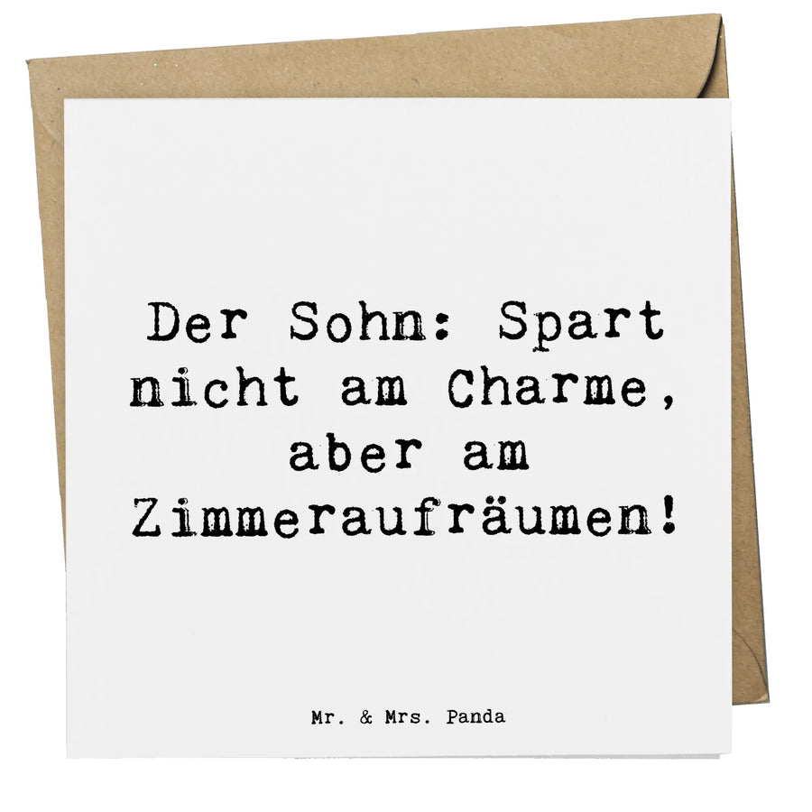 Auf der Vorderseite der Karte findet sich der charmante Spruch: "Der Sohn: Spart nicht am Charme, aber am Zimmeraufräumen!", der mit einem Lächeln gelesen werden kann. Die Innenseite der Karte ist blanko und bietet viel Raum für persönliche Nachrichten und herzliche Wünsche. Diese ideale Karte ist eine großartige Möglichkeit, um Dankeschön zu sagen oder um jemandem einfach mal eine Freude zu bereiten.