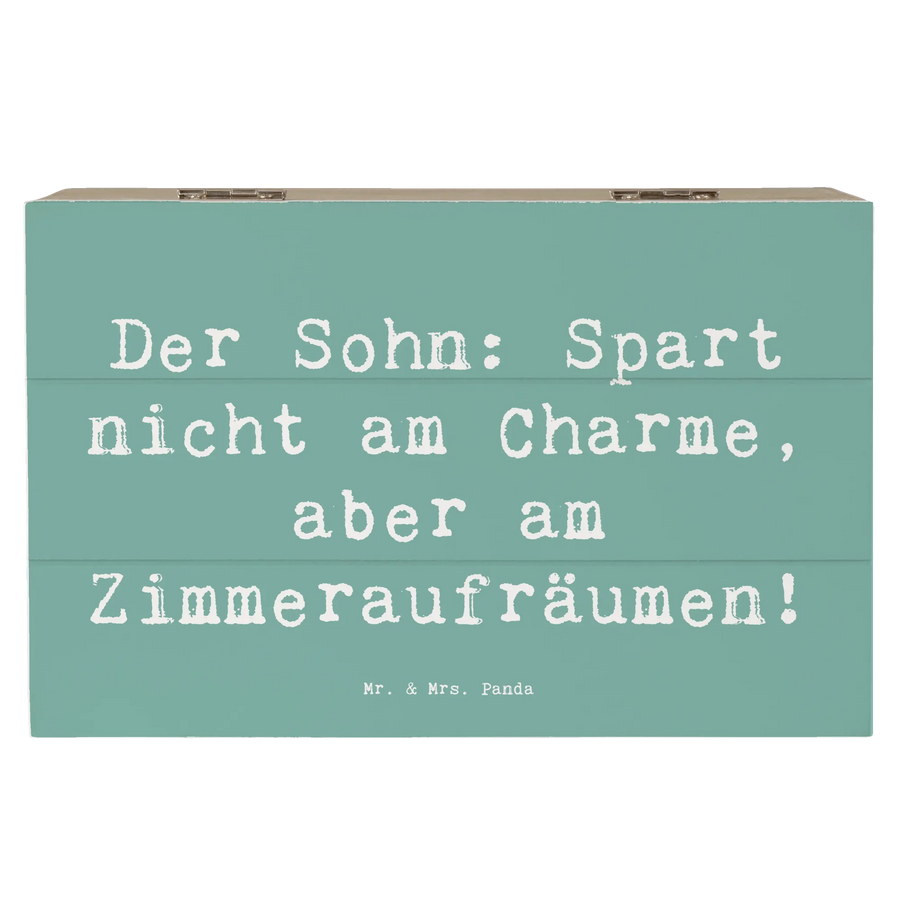 Entdecke die wunderschöne Holzkiste von Mr. & Mrs. Panda, die mit Liebe und Charme entworfen wurde, um die schönsten Erinnerungen und Schätze deines Lebens festzuhalten. Diese besondere Kiste trägt das herzerwärmende Motiv "Der Sohn: Spart nicht am Charme, aber am Zimmeraufräumen!" und ist der perfekte Aufbewahrungsort für all die kleinen Dinge, die dein Herz berühren.