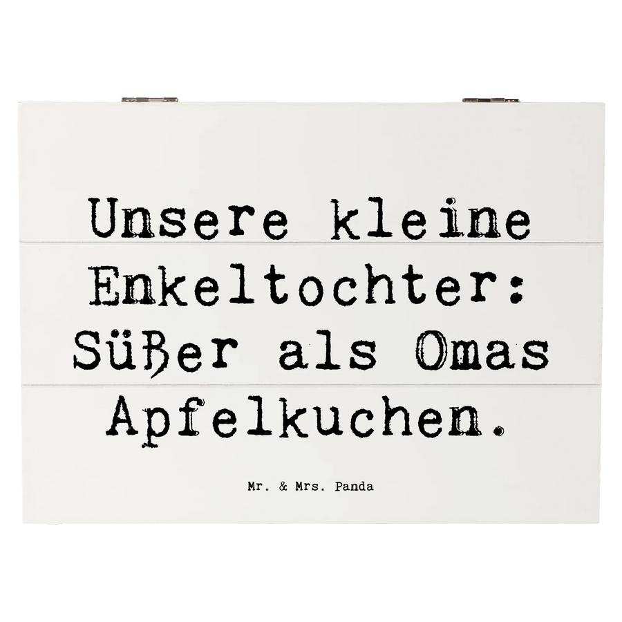Eine wunderschöne Holzkiste von Mr. & Mrs. Panda, im bezaubernden Design für Deine geliebte Enkeltochter. Diese besondere Schatzkiste mit dem Spruch 'Unsere kleine Enkeltochter: Süßer als Omas Apfelkuchen.' ist das perfekte Geschenk, um die einzigartigen Momente der Kindheit festzuhalten.