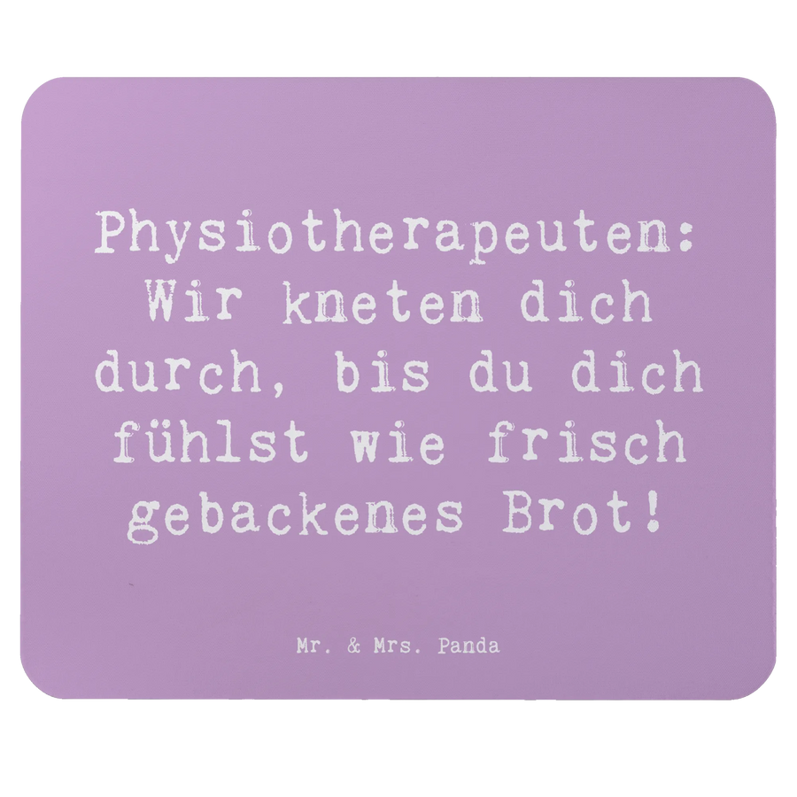 Wenn du auf der Suche nach einem einzigartigen Geschenk für einen Physiotherapeuten oder eine Physiotherapeutin bist, dann ist das Mauspad von Mr. & Mrs. Panda genau das Richtige für dich! Mit dem liebevollen Spruch "Physiotherapeuten: Wir kneten dich durch, bis du dich fühlst wie frisch gebackenes Brot!" verbreitet dieses Mauspad Freude und bringt ein Lächeln in den Büroalltag.