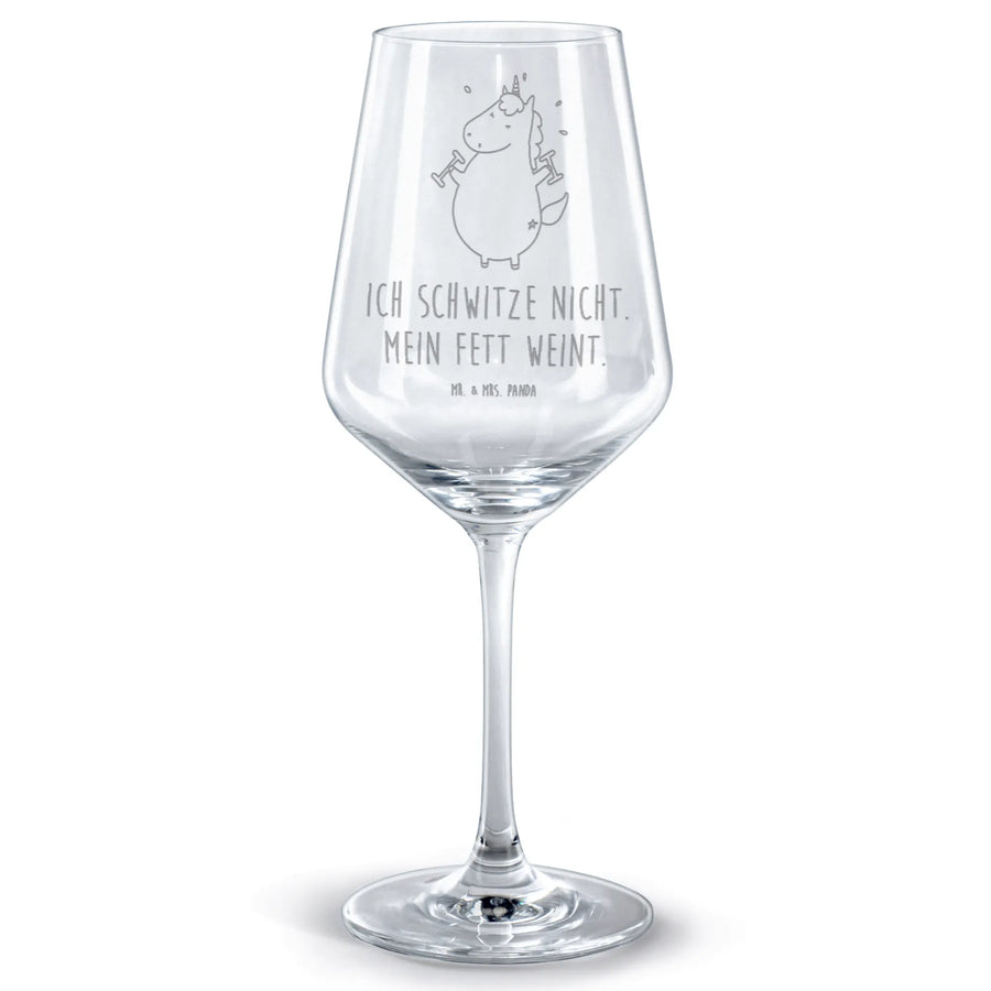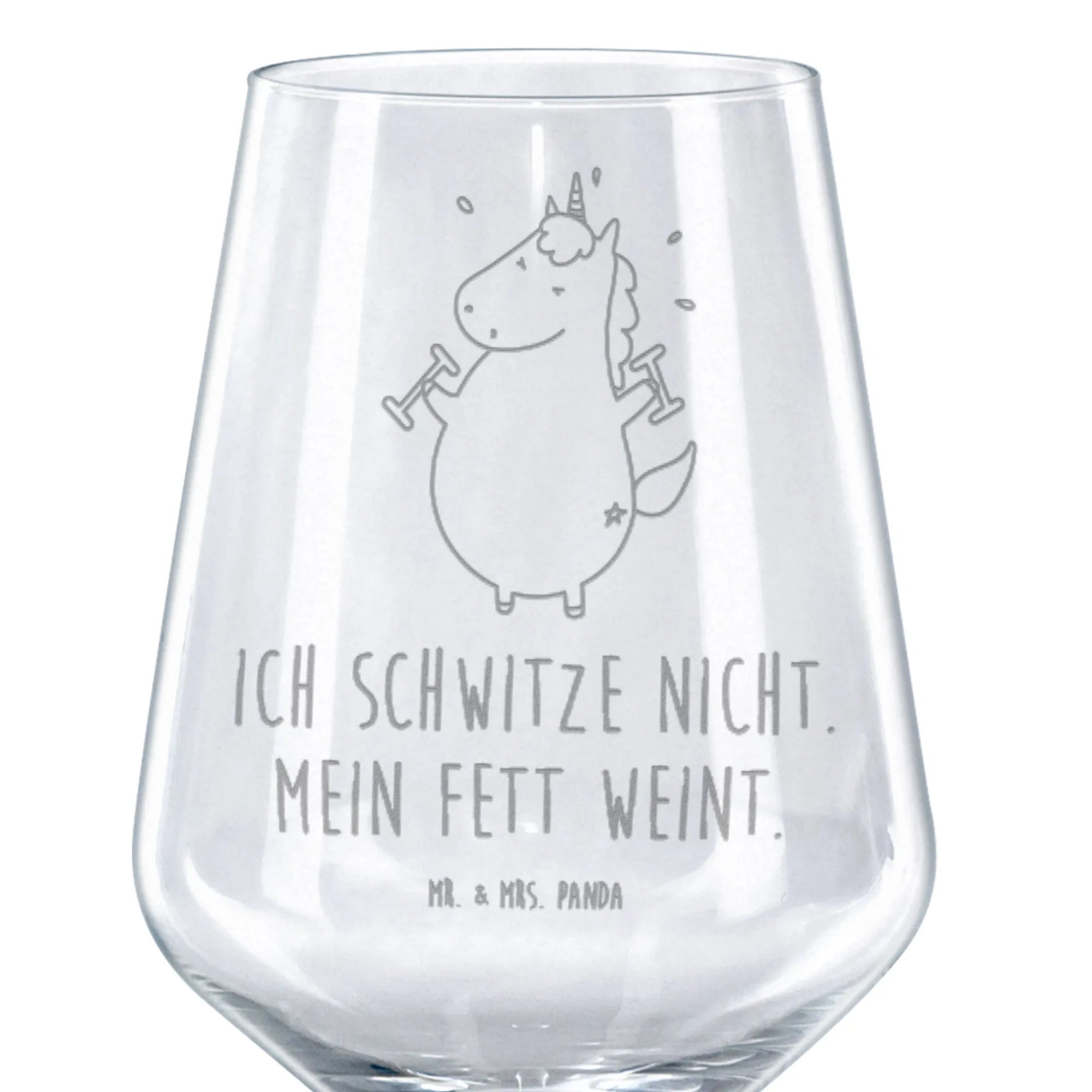 Mr. & Mrs. Panda Rotweinglas "Einhorn Fitness" – das Weinglas für alle, die Wein lieben und ihren Humor bewahren wollen. Dieses elegante Bordeauxglas trifft auf ein freches Einhorn-Motiv und den Spruch „Ich schwitze nicht. Mein Fett weint.“ – liebevoll von Mrs. Panda handgezeichnet und als qualitativ hochwertige Lasergravur umgesetzt. 🍷🦄