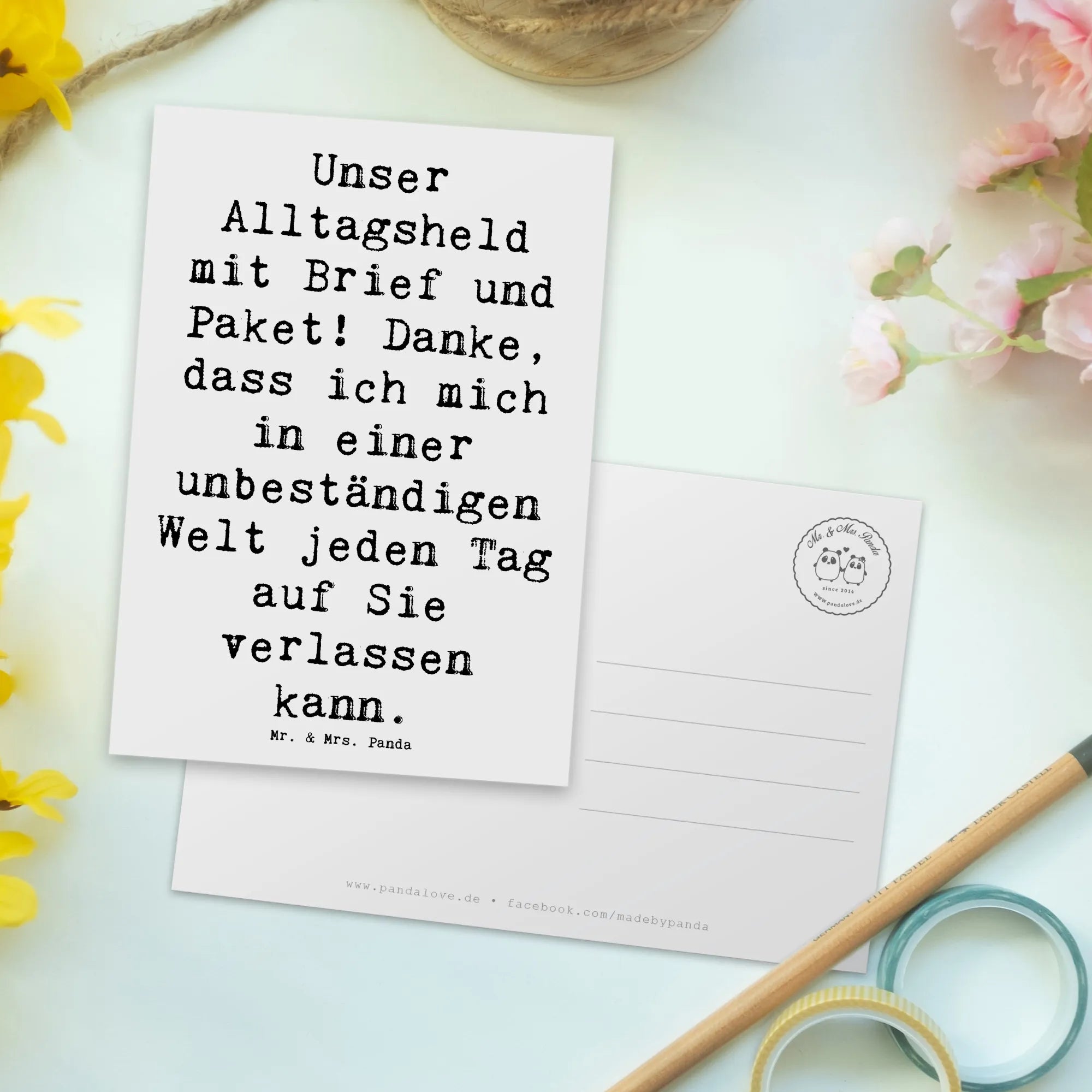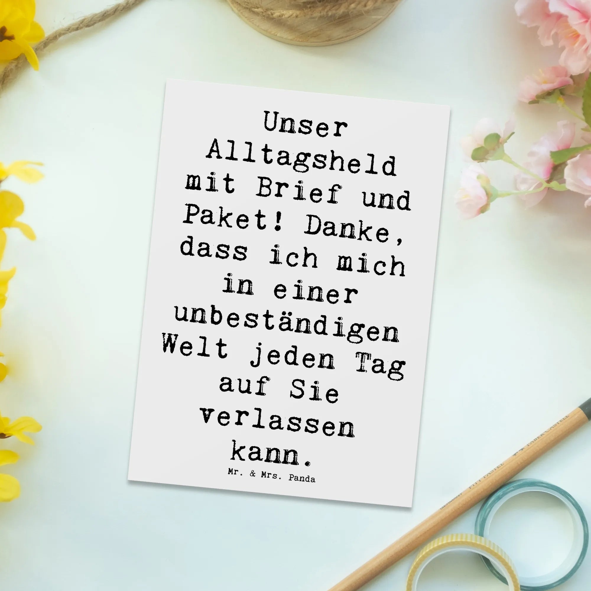 Die einzigartige Postkarte von Mr. & Mrs. Panda mit dem bezaubernden Motiv des Briefträgers ist der perfekte Weg, um Dankbarkeit auf eine herzliche und kreative Art auszudrücken. Diese wunderschöne Karte überrascht nicht nur mit ihrem charmanten Design, sondern auch mit einem inspirierenden Spruch: 'Unser Alltagsheld mit Brief und Paket! Danke, dass ich mich in einer unbeständigen Welt jeden Tag auf Sie verlassen kann.'