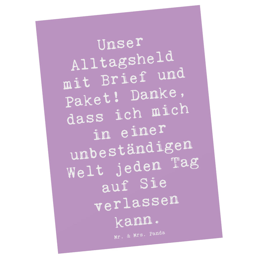 Die einzigartige Postkarte von Mr. & Mrs. Panda mit dem niedlichen Motif 'Briefträger' ist das perfekte Geschenk, um Deine Dankbarkeit auf eine liebevolle Art und Weise auszudrücken. In einer Welt voller Unsicherheiten ist es wichtig, Menschen zu schätzen, auf die man sich verlassen kann. Diese Karte mit dem klingenden Slogan 'Unser Alltagsheld mit Brief und Paket! Danke, dass ich mich in einer unbeständigen Welt jeden Tag auf Sie verlassen kann.' bringt genau das perfekte Gefühl rüber.
