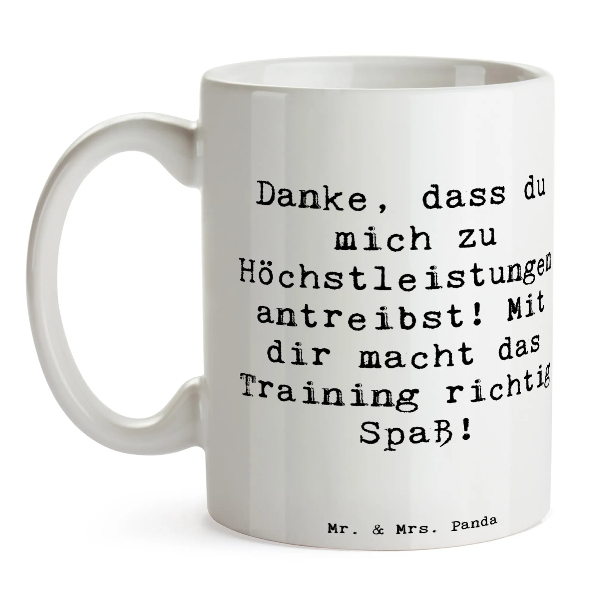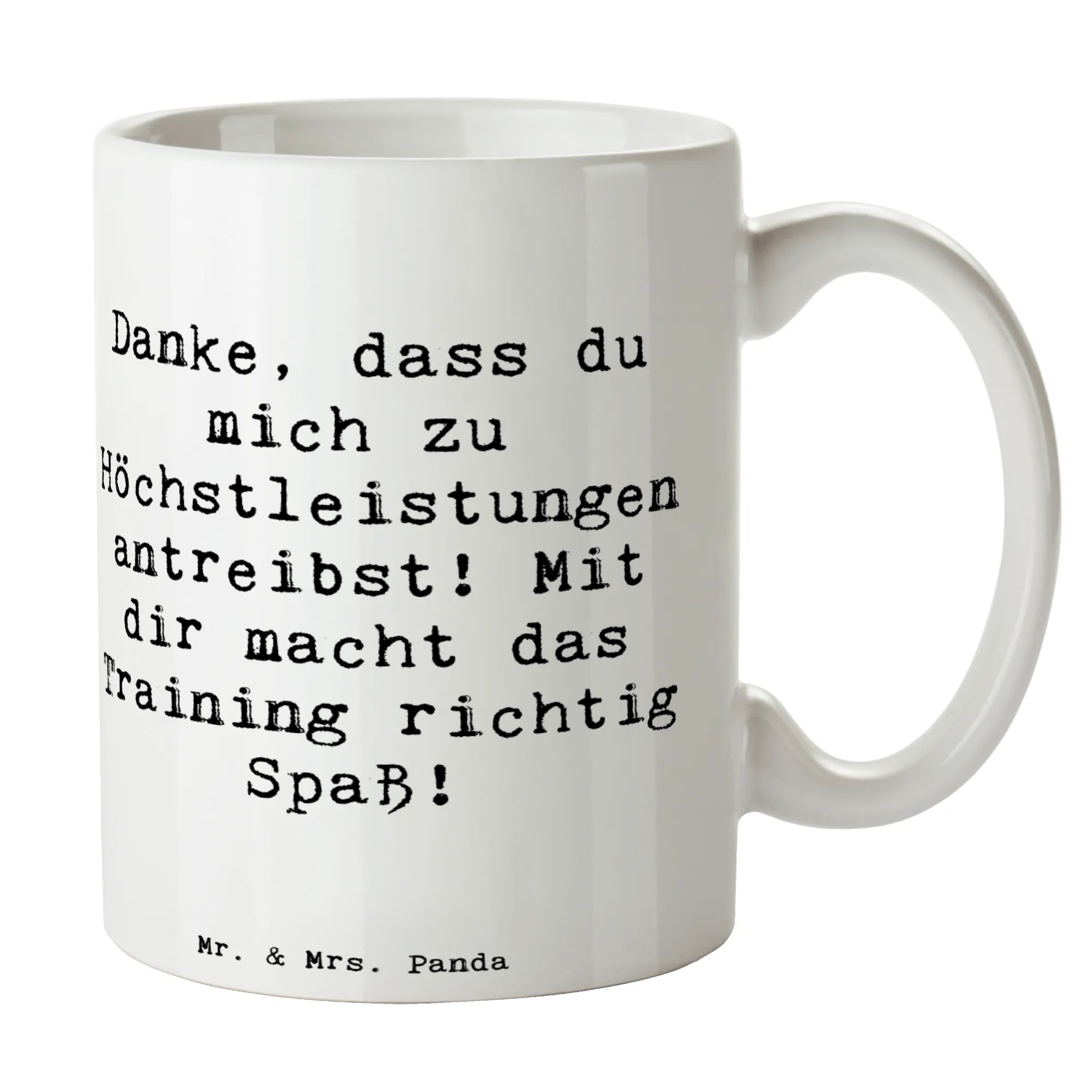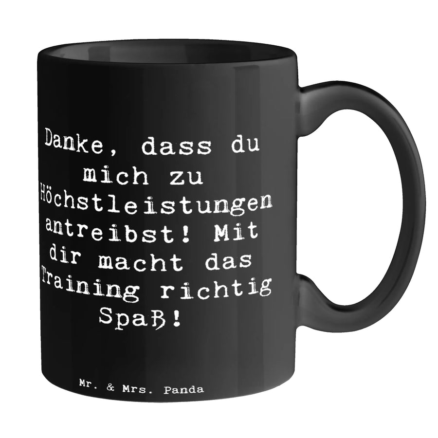 Mit ihrem liebevollen Motiv und dem herzlichen Spruch 'Danke, dass du mich zu Höchstleistungen antreibst! Mit dir macht das Training richtig Spaß!' ist diese Kaffeetasse eine wunderbare Möglichkeit, Wertschätzung und Dankbarkeit auszudrücken.