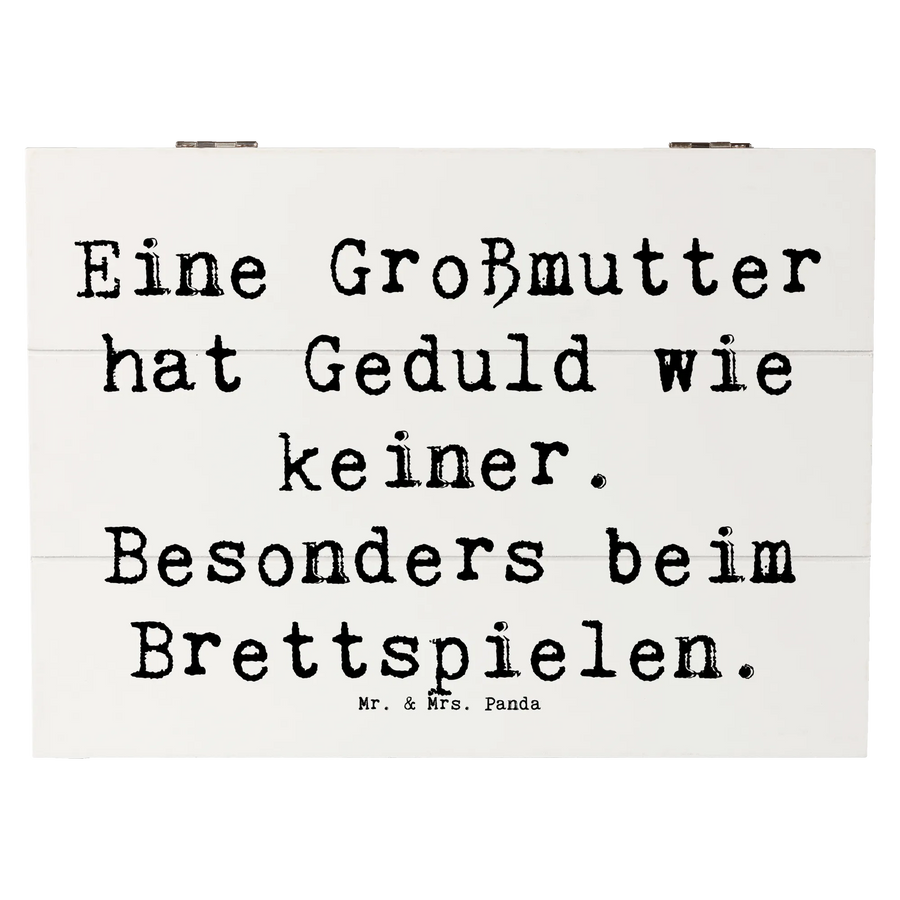 Unsere Holzkiste von Mr. & Mrs. Panda trägt den liebevollen Spruch: „Eine Großmutter hat Geduld wie keiner. Besonders beim Brettspielen.“ Sie ist nicht nur praktische Aufbewahrungsbox, sondern auch ein emotionales Geschenk, das Wärme und Humor verbindet. Ideal als Geschenk für Großmutter zum Geburtstag, Muttertag, zu Weihnachten oder einfach als kleines Dankeschön.