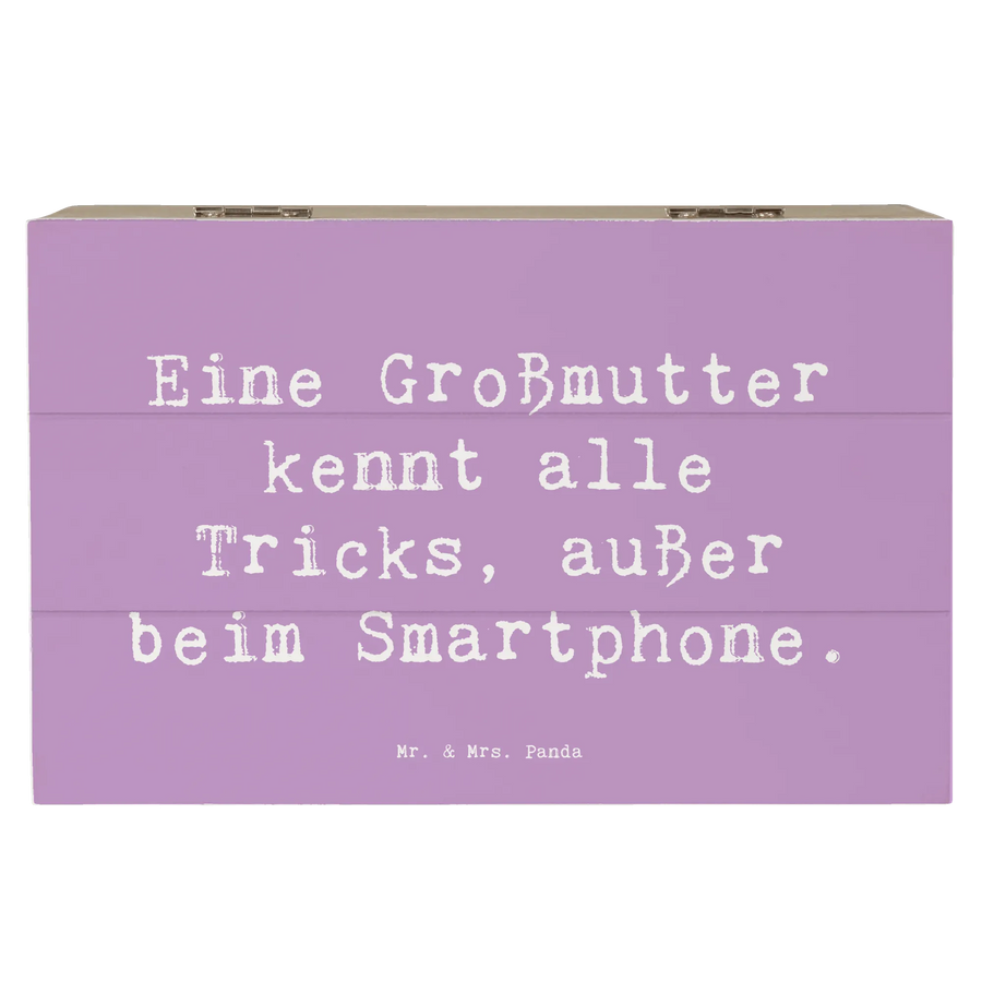 Die Holzkiste ist in einem sanften Lavendeltraum-Farbton gestaltet und mit dem liebevollen Slogan "Eine Großmutter kennt alle Tricks, außer beim Smartphone." versehen. Dieser charmante Spruch bringt nicht nur ein Lächeln auf das Gesicht deiner Oma, sondern verdeutlicht auch die besonderen Erinnerungen, die sie für die Familie bewahrt.