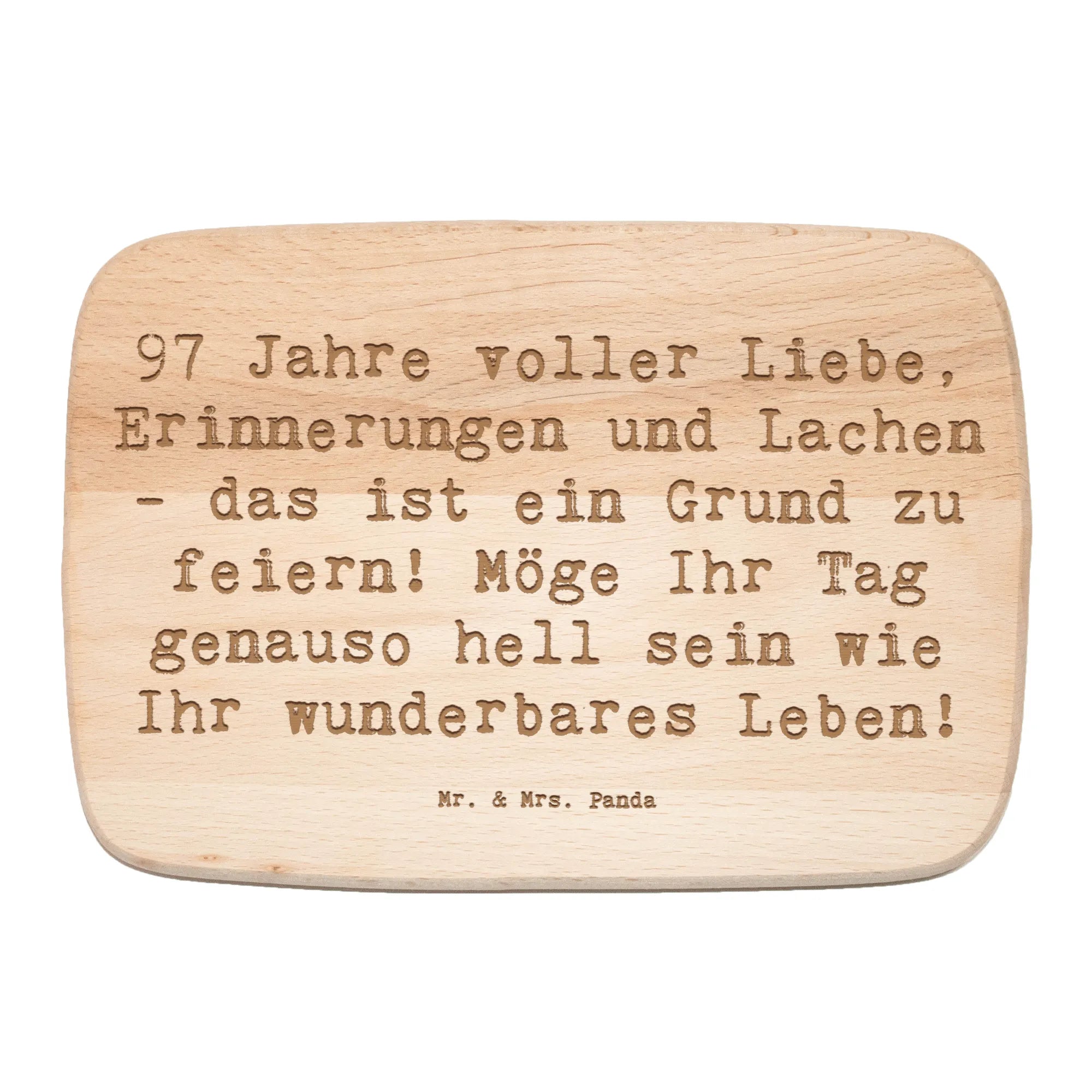 Das Frühstücksbrett "97 Jahre voller Liebe, Erinnerungen und Lachen" von Mr. & Mrs. Panda ist das perfekte Geschenk für einen ganz besonderen 97. Geburtstag. Wenn Du einen lieben Menschen hast, der dieses beeindruckende Alter erreicht hat, dann ist dieses Frühstücksbrettchen genau das Richtige!